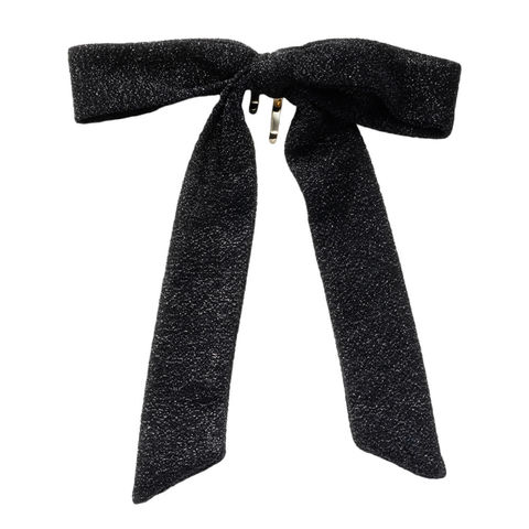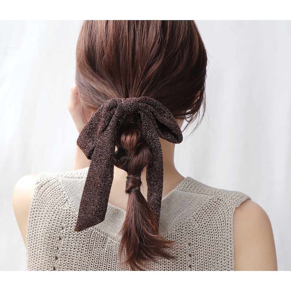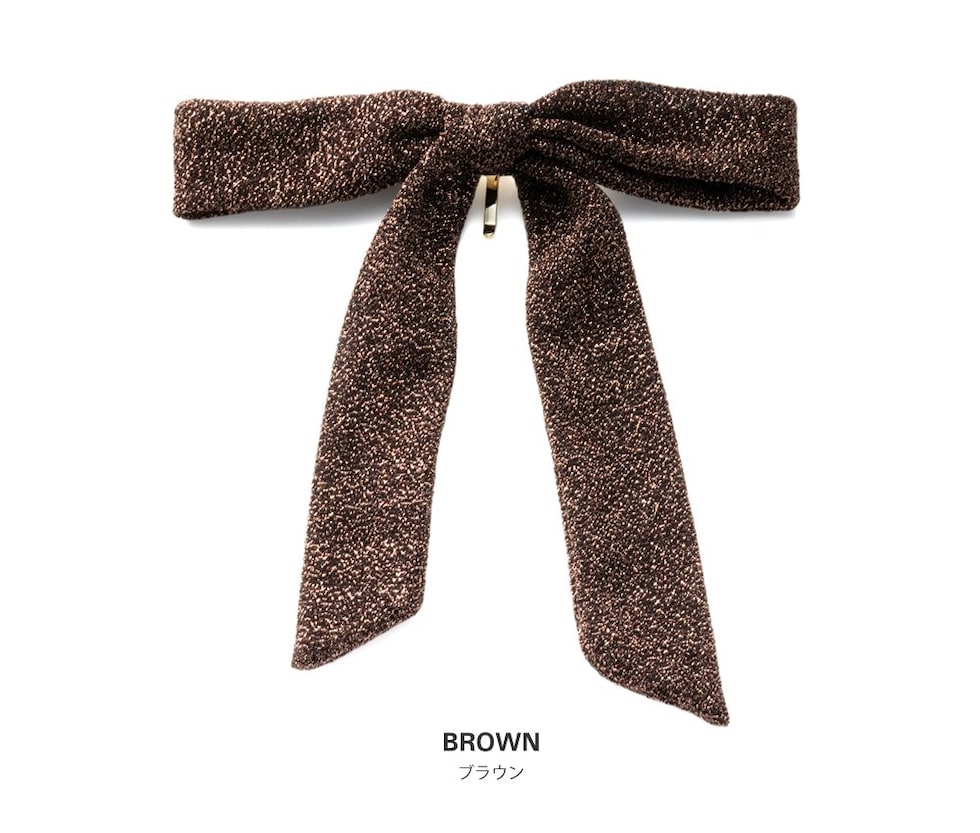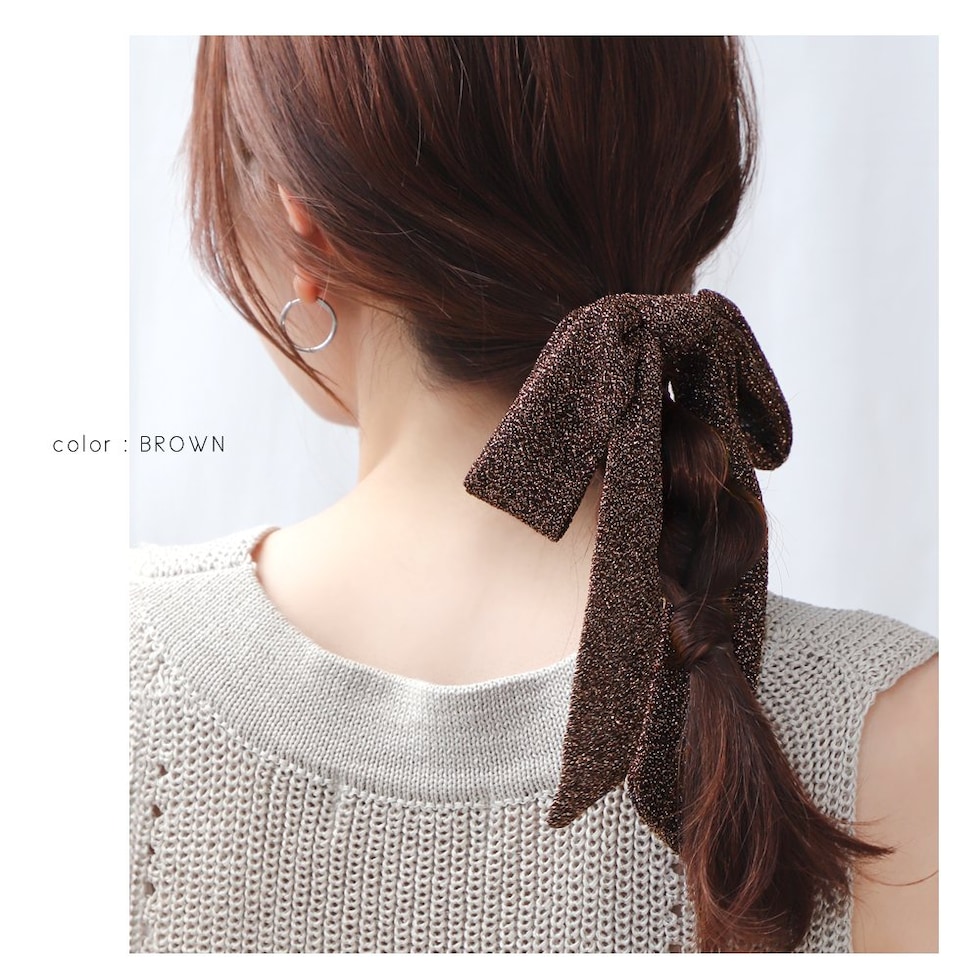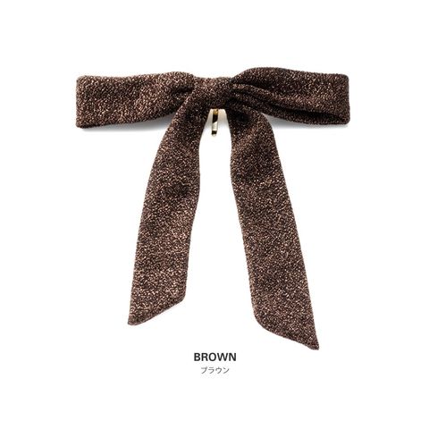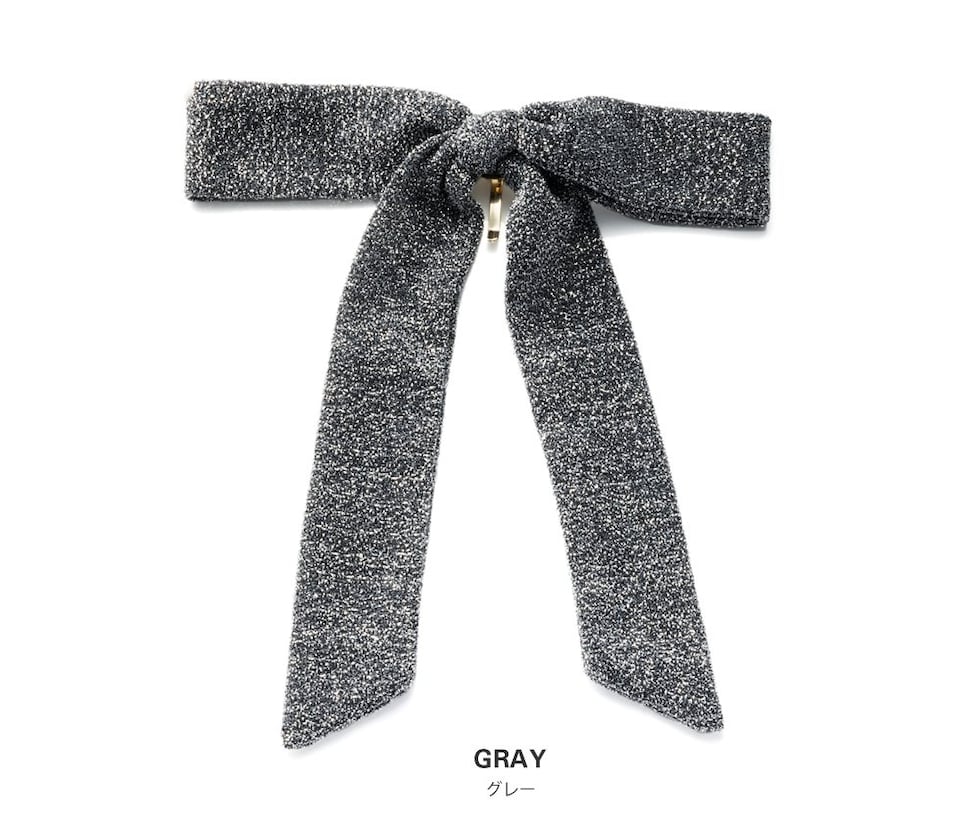 存在感抜群、グリッターリボンのロングポニーフック。光を受けて華やかに煌めくデザインが後ろ姿にこなれたアクセントをプラス。着脱簡単でリボンの形は調節出来るから、アレンジに合わせて変えれるのも嬉しいポイントです◎