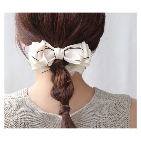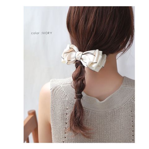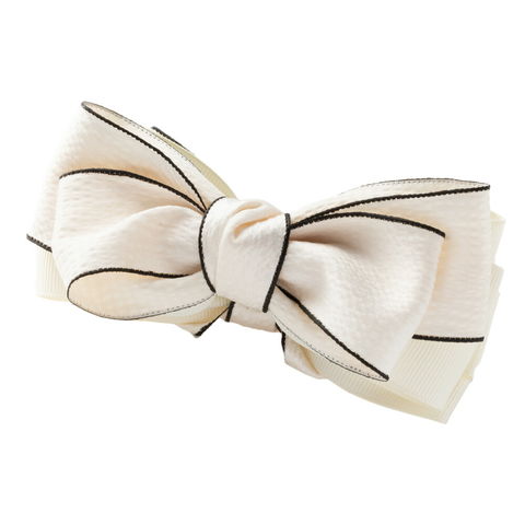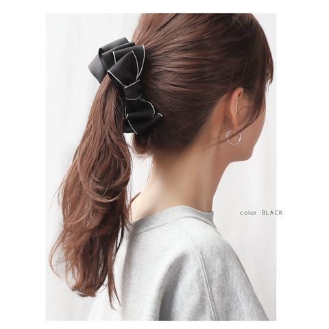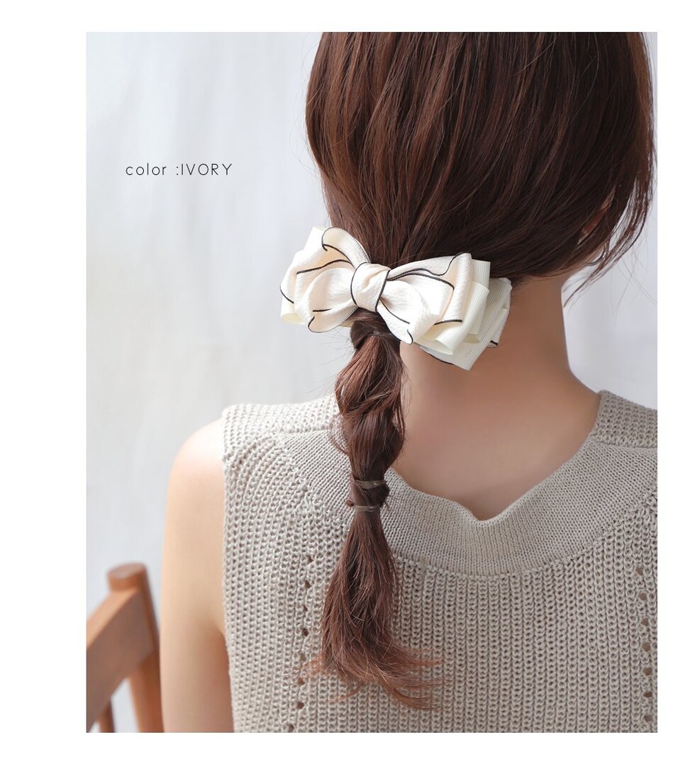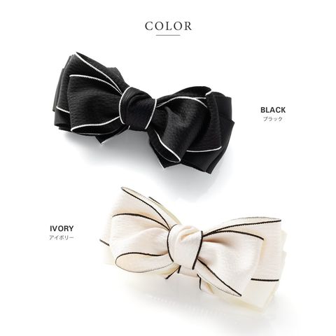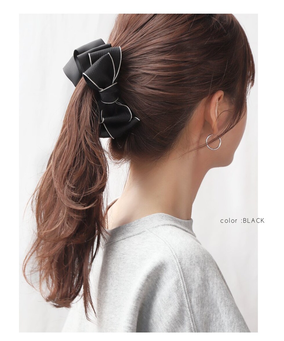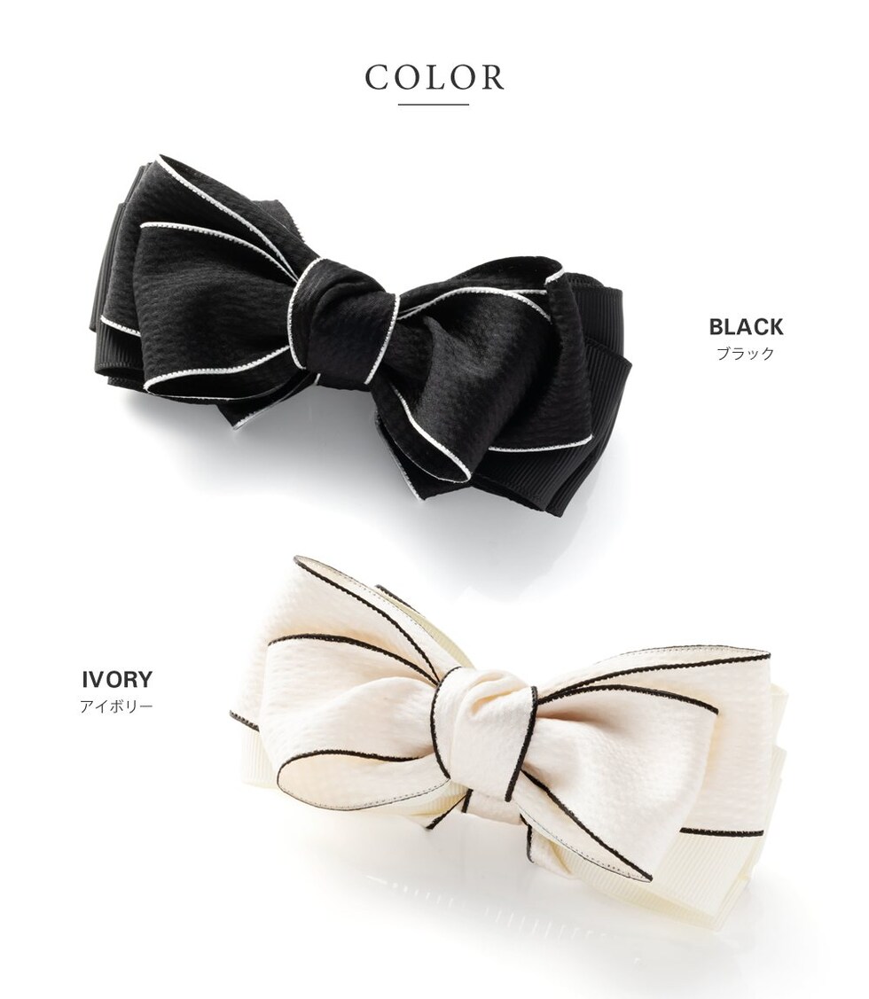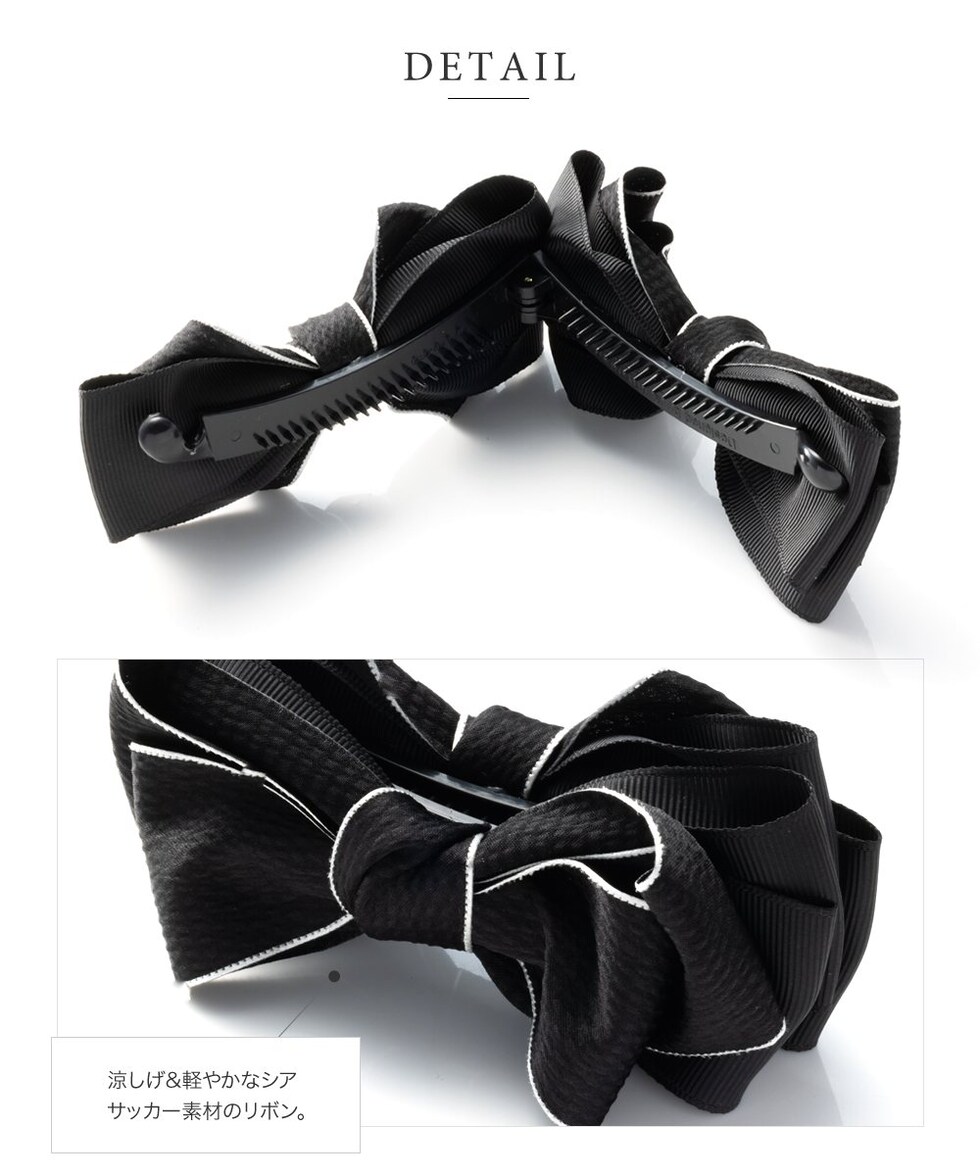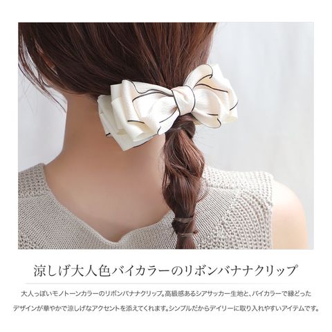 大人っぽいモノトーンカラーのリボンバナナクリップ。高級感あるシアサッカー生地と、バイカラーで縁どったデザインが華やかで涼しげなアクセントを添えてくれます。シンプルだからデイリーに取り入れやすいアイテムです。