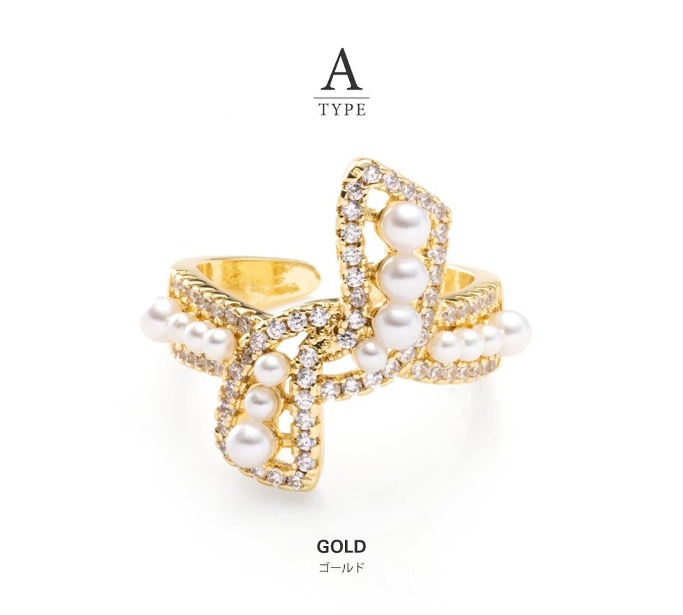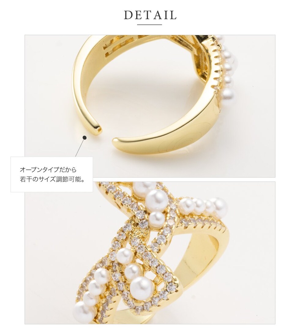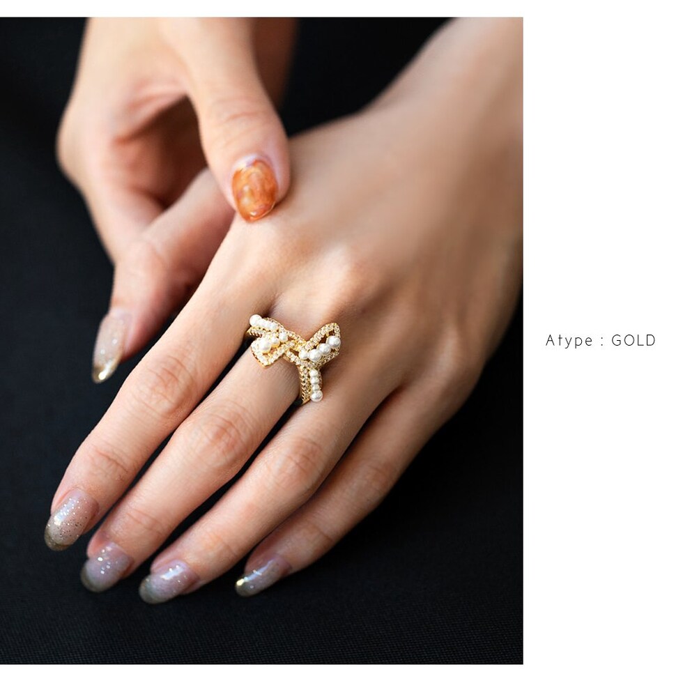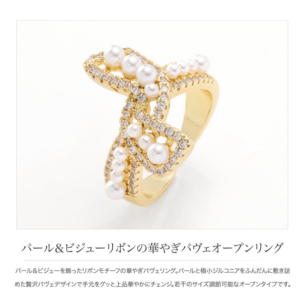 リング 指輪 レディース リボン パール ビジュー パヴェ ノット 結び目 オープンリング 2タイプ キュービックジルコニア リボンモチーフ パヴェリング 調整可能 cream dot ゆうパケット [A:ゴールド_フリーサイズ]