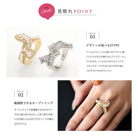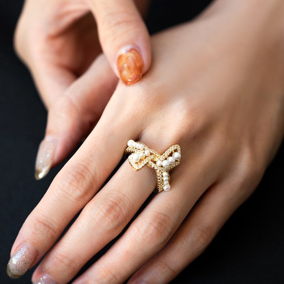 パール&ビジューを飾ったリボンモチーフの華やぎパヴェリング。パールと極小ジルコニアをふんだんに敷き詰めた贅沢パヴェデザインで手元をグッと上品華やかにチェンジ。若干のサイズ調節可能なオープンタイプです。