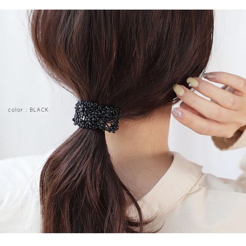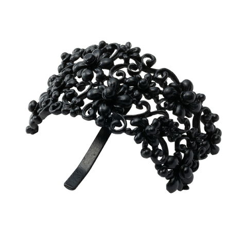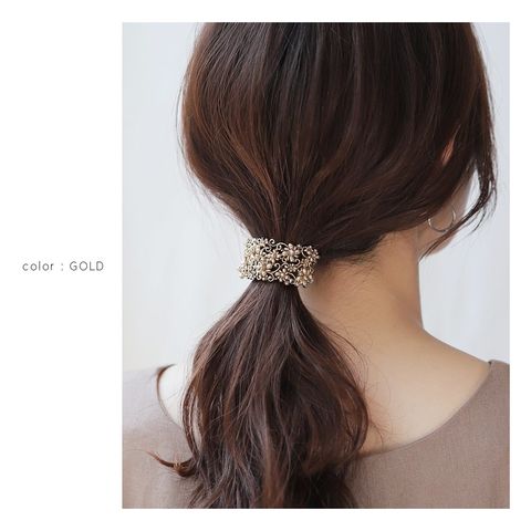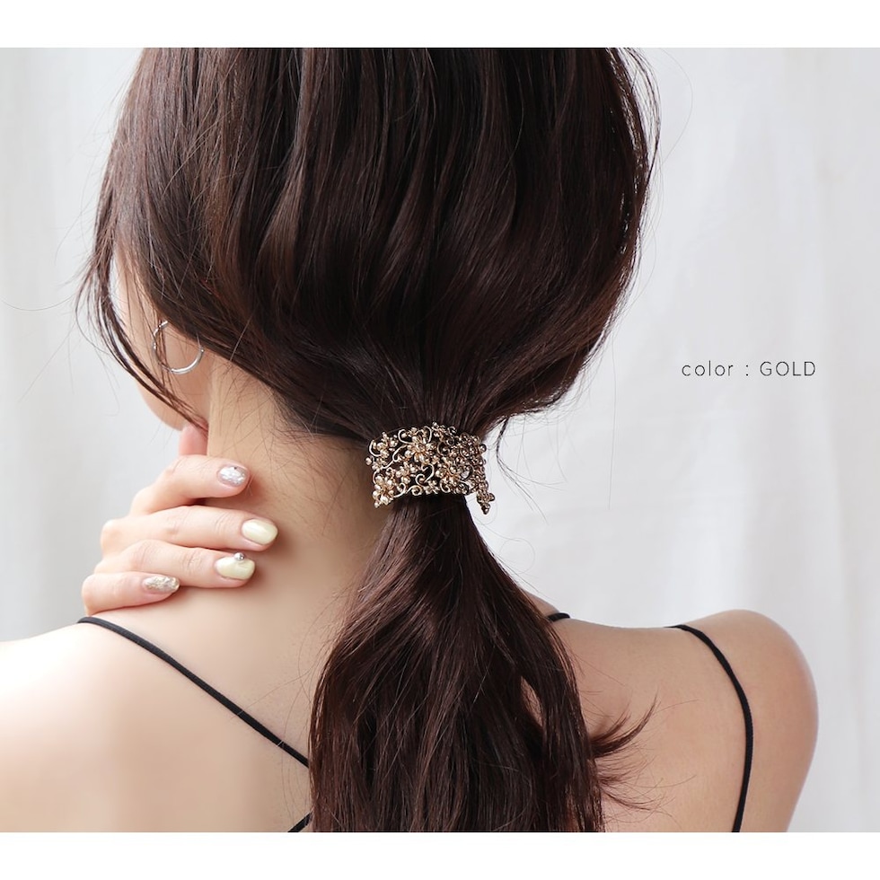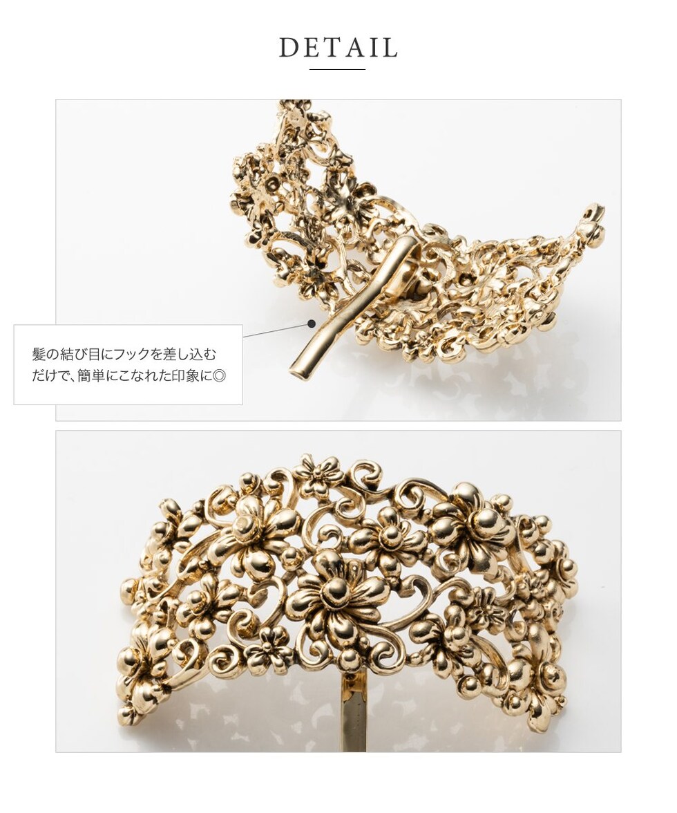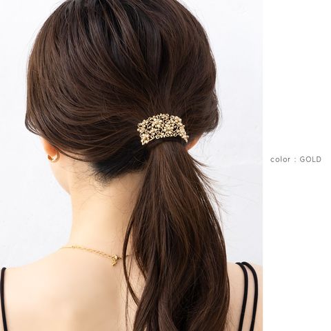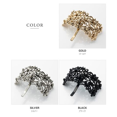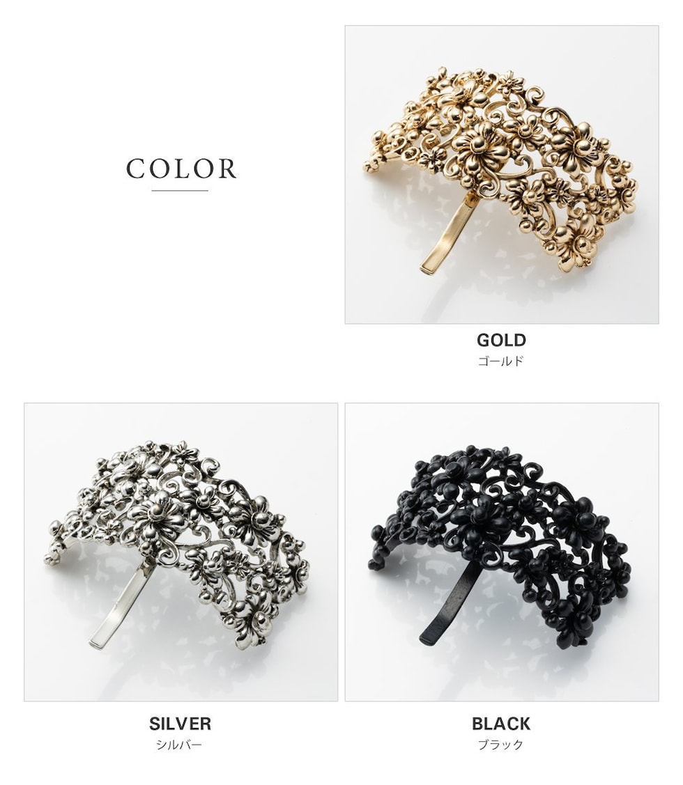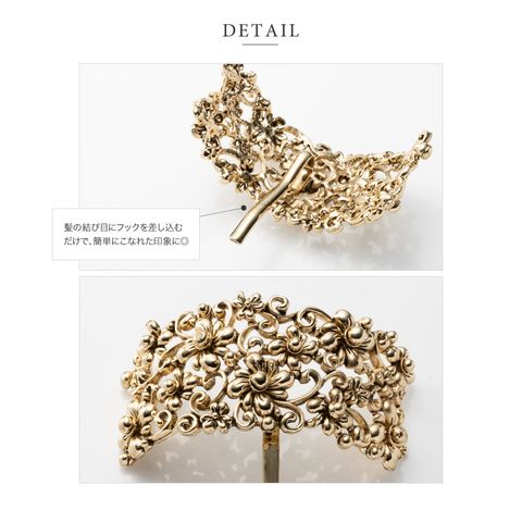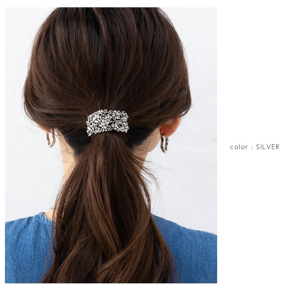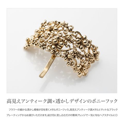 フラワーの細かな透かし模様が目を惹くメタルポニーフック。高見えアンティーク調メタルとマットなブラックプレーティングからお選びいただけます。結び目に差し込むだけの簡単アレンジで一気に旬なヘアスタイルに◎