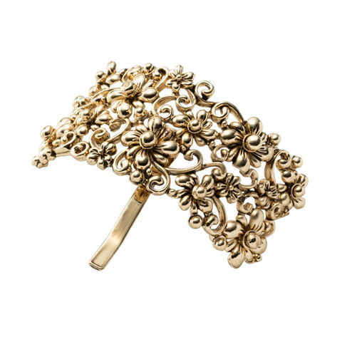 フラワーの細かな透かし模様が目を惹くメタルポニーフック。高見えアンティーク調メタルとマットなブラックプレーティングからお選びいただけます。結び目に差し込むだけの簡単アレンジで一気に旬なヘアスタイルに◎