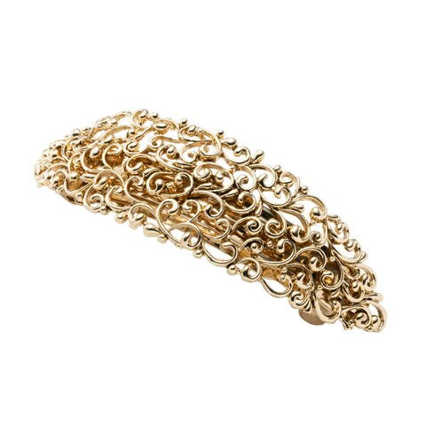 細かな透かし模様が目を惹く2タイプデザインのメタルバレッタ。高見えアンティーク調メタルとマットなブラックプレーティングがお選びいただけます。おろし髪をさっとまとめるだけでこなれ感のあるトレンドヘアが完成◎