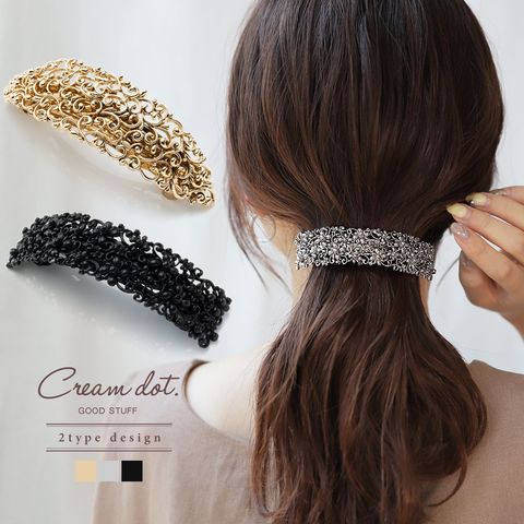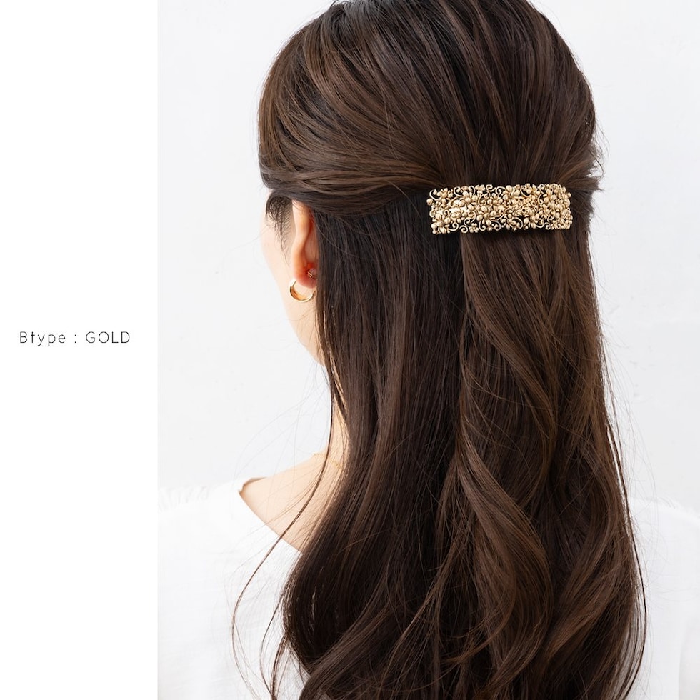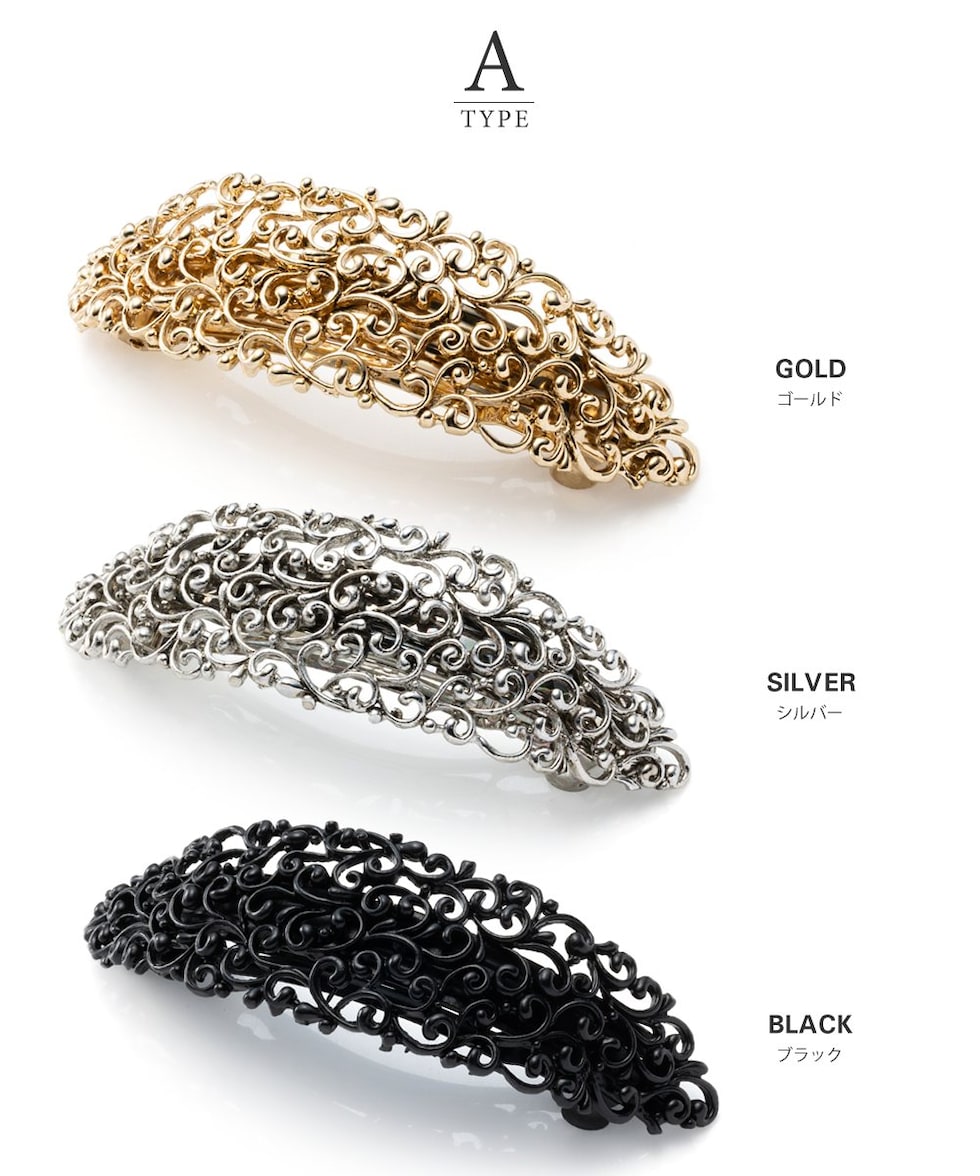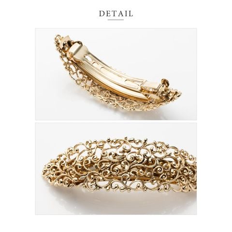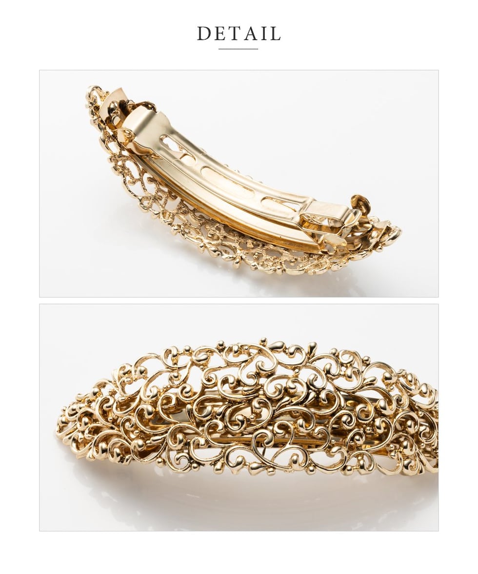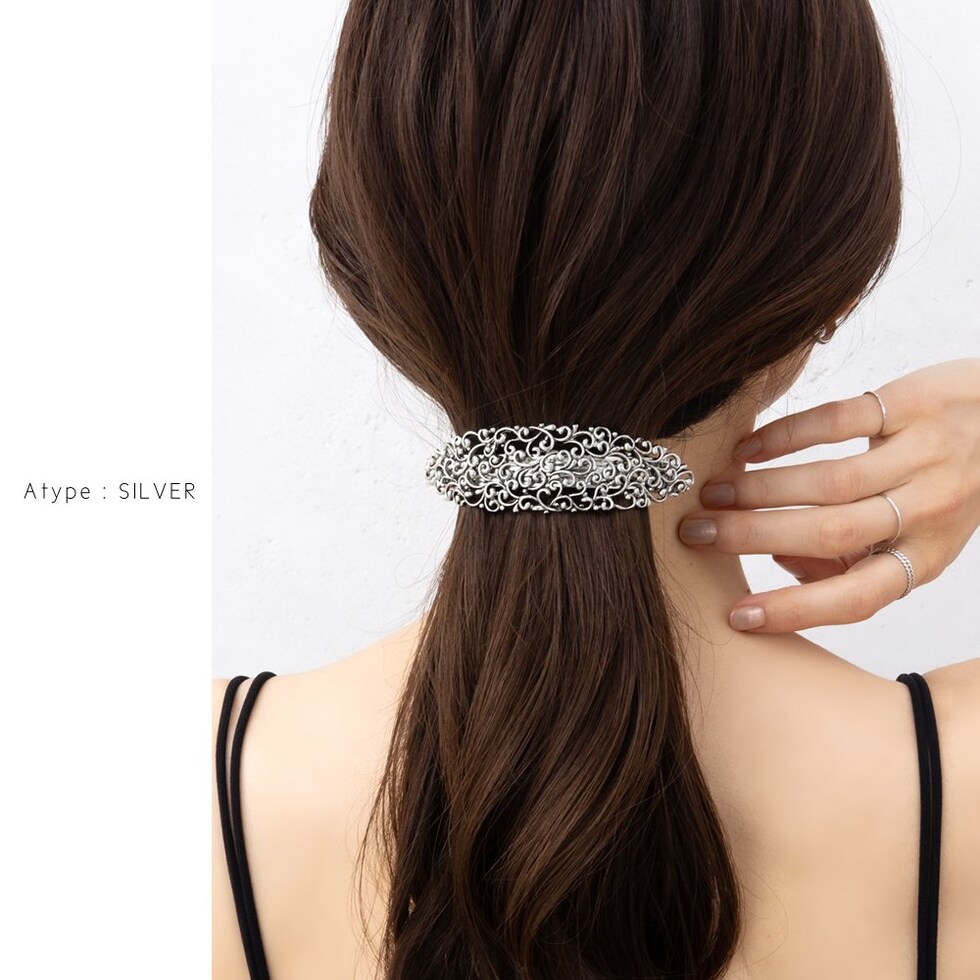 細かな透かし模様が目を惹く2タイプデザインのメタルバレッタ。高見えアンティーク調メタルとマットなブラックプレーティングがお選びいただけます。おろし髪をさっとまとめるだけでこなれ感のあるトレンドヘアが完成◎