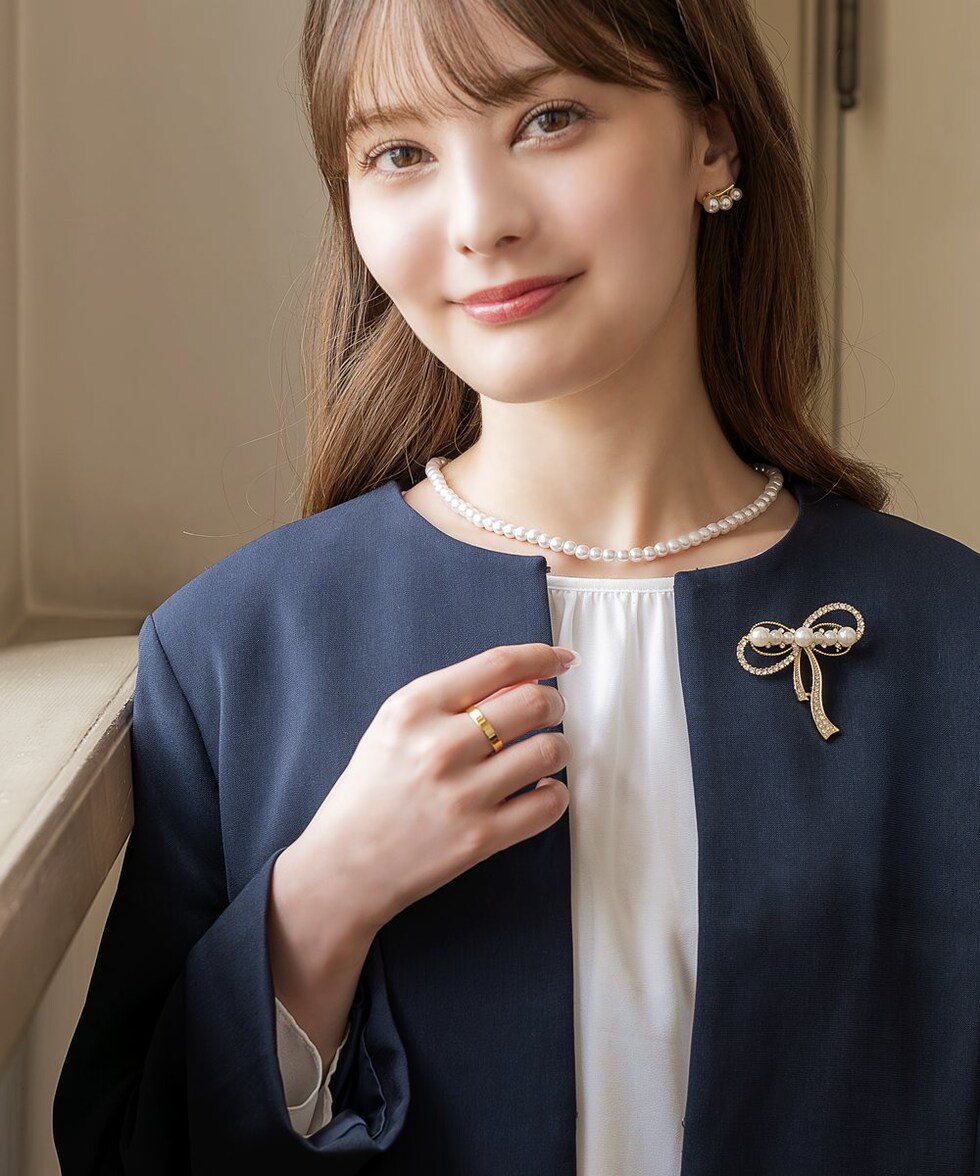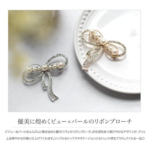 ビジュー&パールをふんだんに敷き詰めた贅沢パヴェのリボンブローチ。存在感を放つ煌びやかなデザインが、グッと上品華やかな印象に仕上げてくれます。シンプルなトップスやオケージョンにもトレンド感をプラスしてくれる一品◎