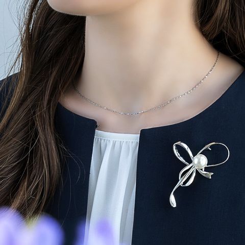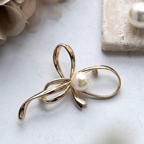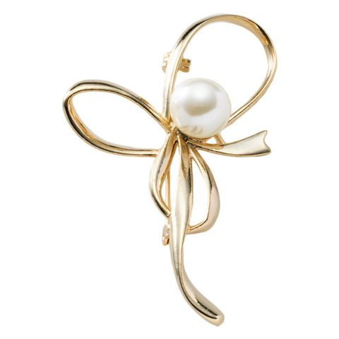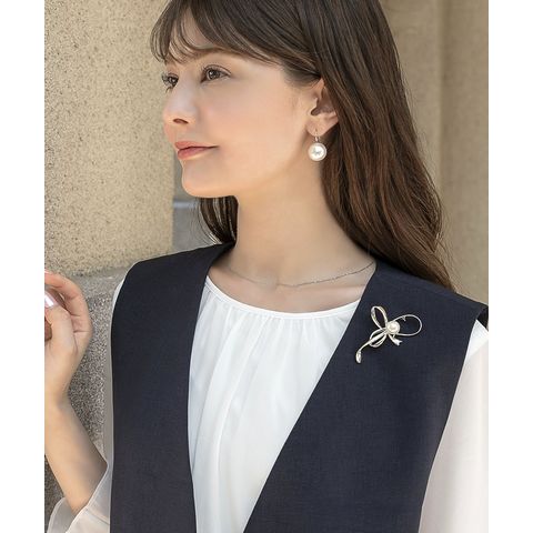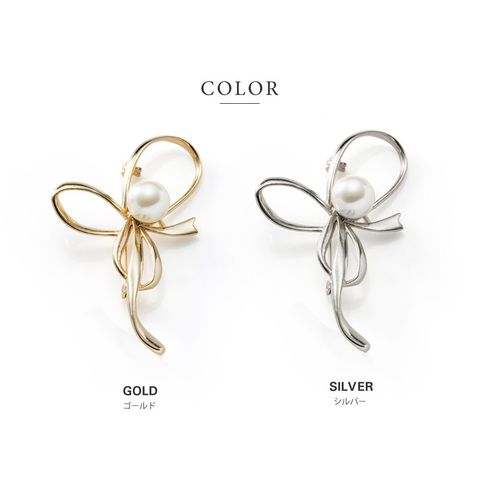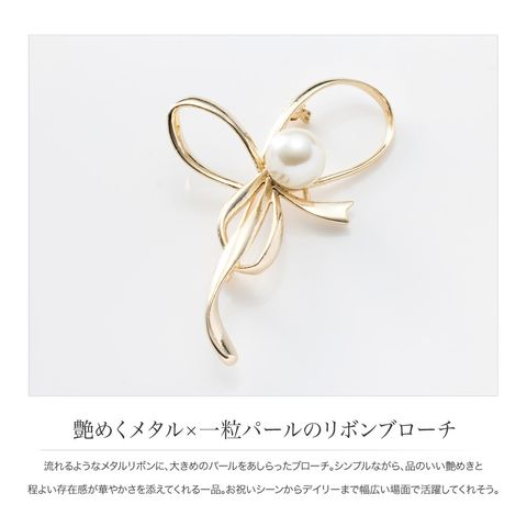 流れるようなメタルリボンに、大きめのパールをあしらったブローチ。シンプルながら、品のいい艶めきと程よい存在感が華やかさを添えてくれる一品。お祝いシーンからデイリーまで幅広い場面で活躍してくれそう。