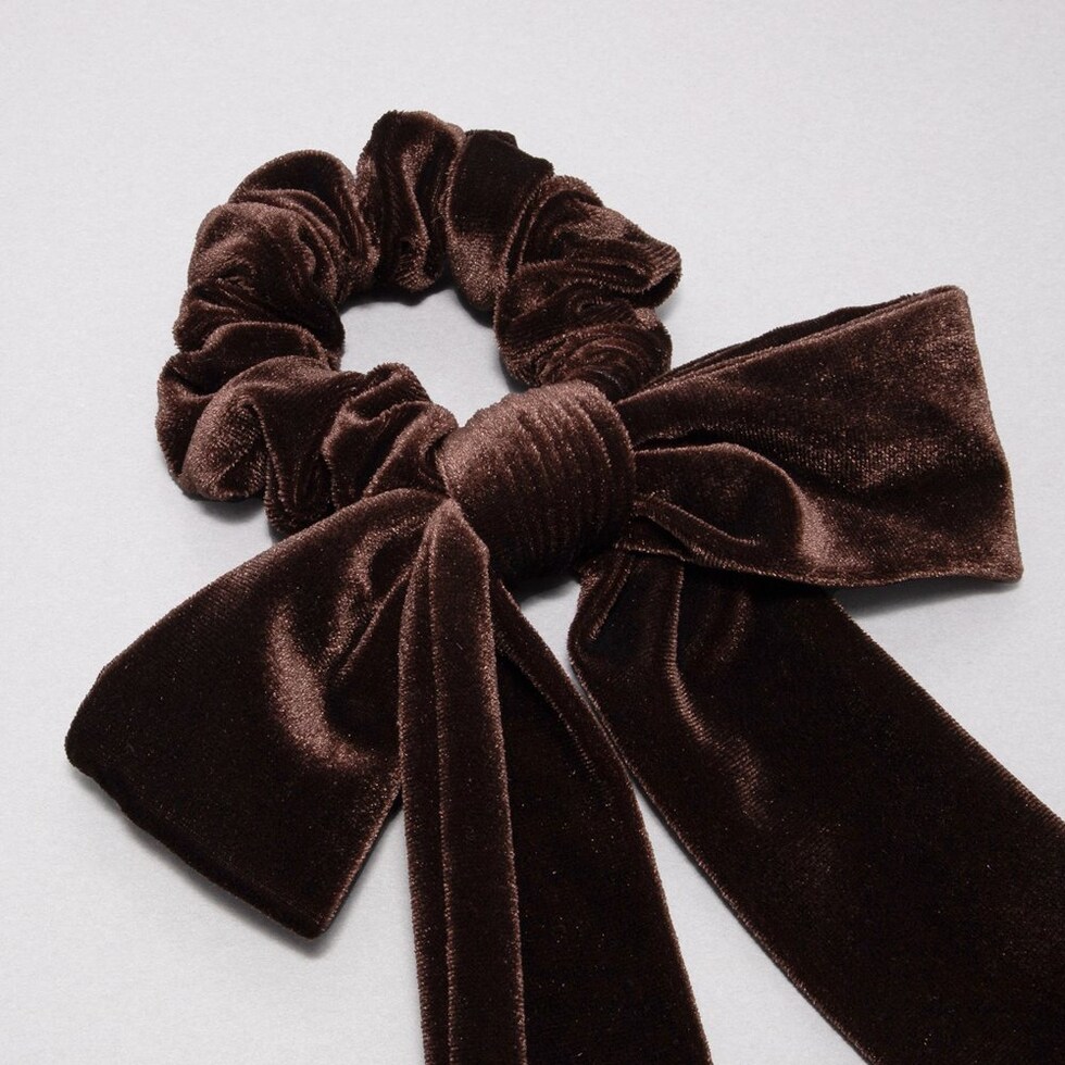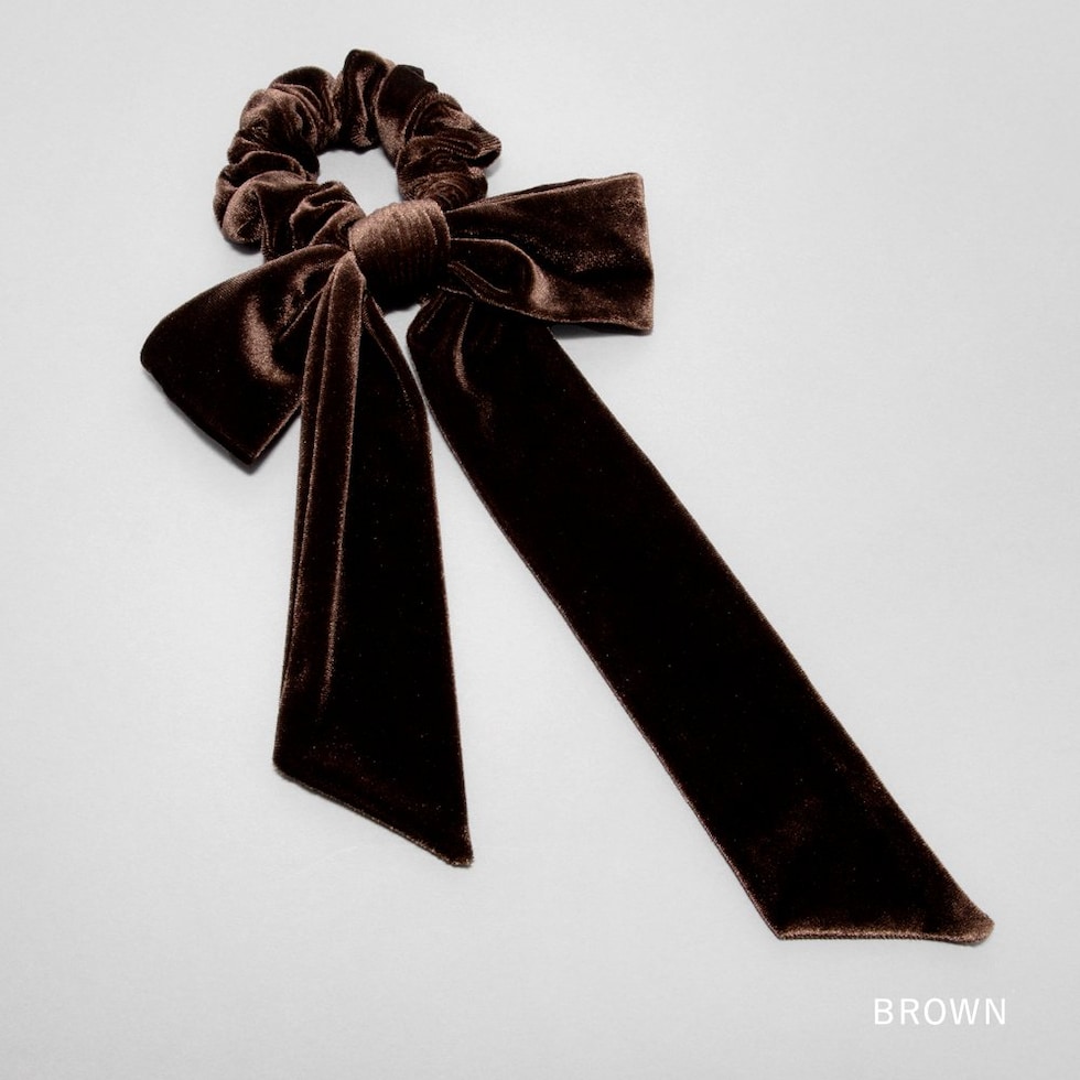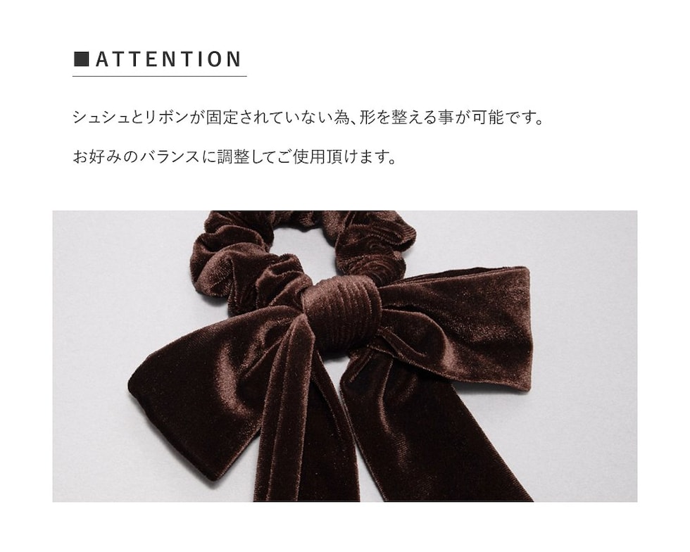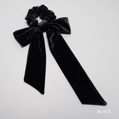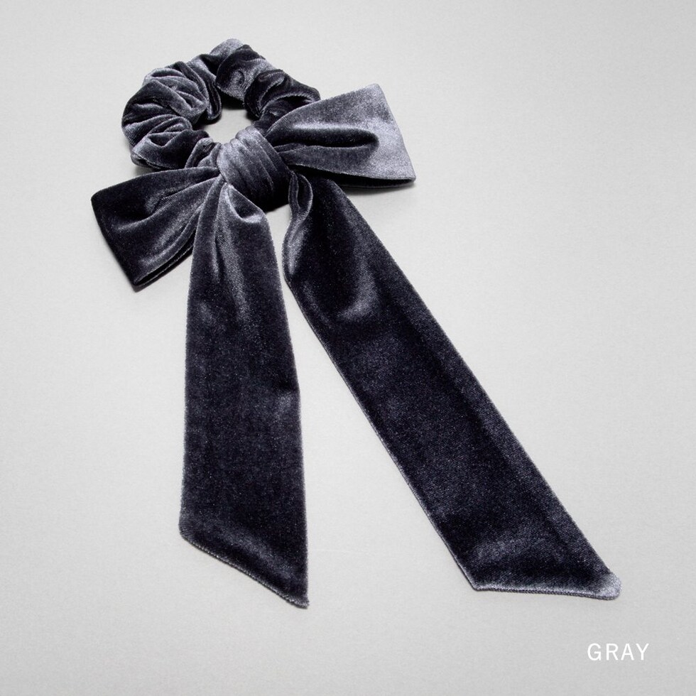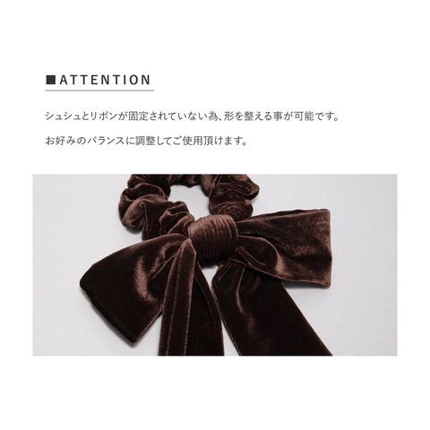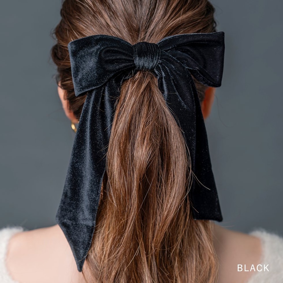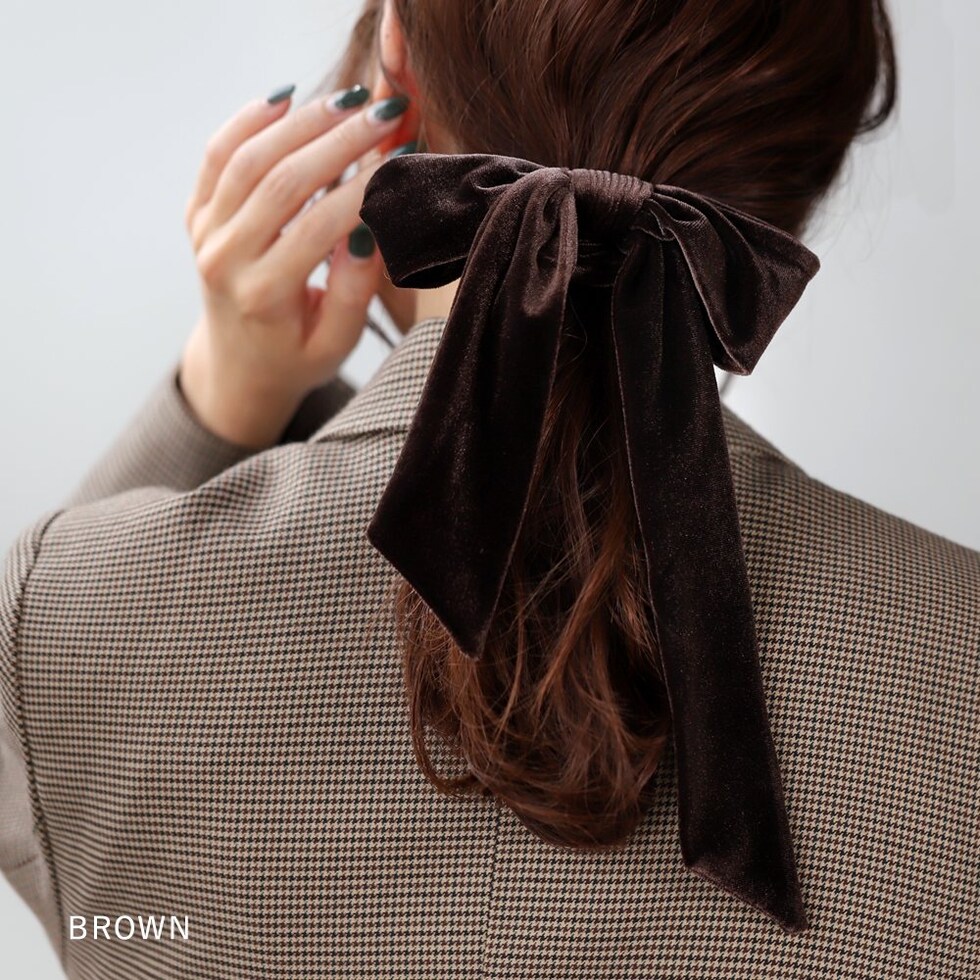 光沢感ある大きめベロアリボンのシュシュ。存在感たっぷりなロング丈のリボンがアレンジをグッとオシャレな雰囲気に仕上げます。大人に似合うシックなカラーとサッと装着できるシュシュで普段使いしやすいアイテムです。