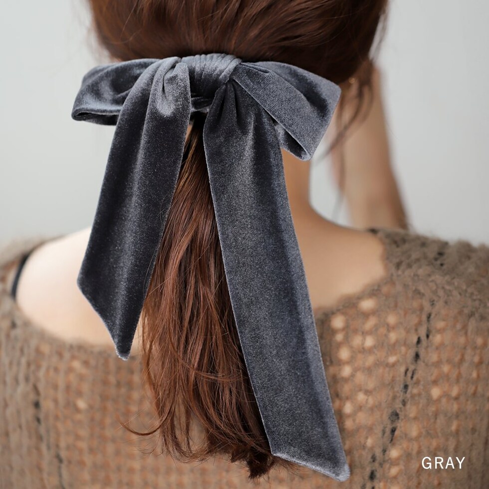 ヘアアクセサリー レディース シュシュ ヘアゴム ベロア リボン ロング ベルベット 光沢感 ボリューム 大きめ 存在感 調節可能 髪留め まとめ髪 ブラウン cream dot ゆうパケット [グレー_ワンサイズ]