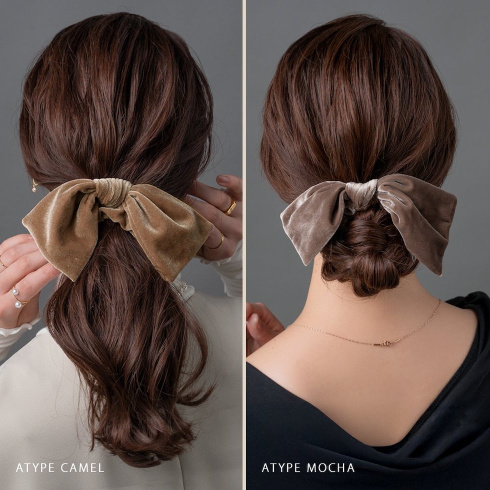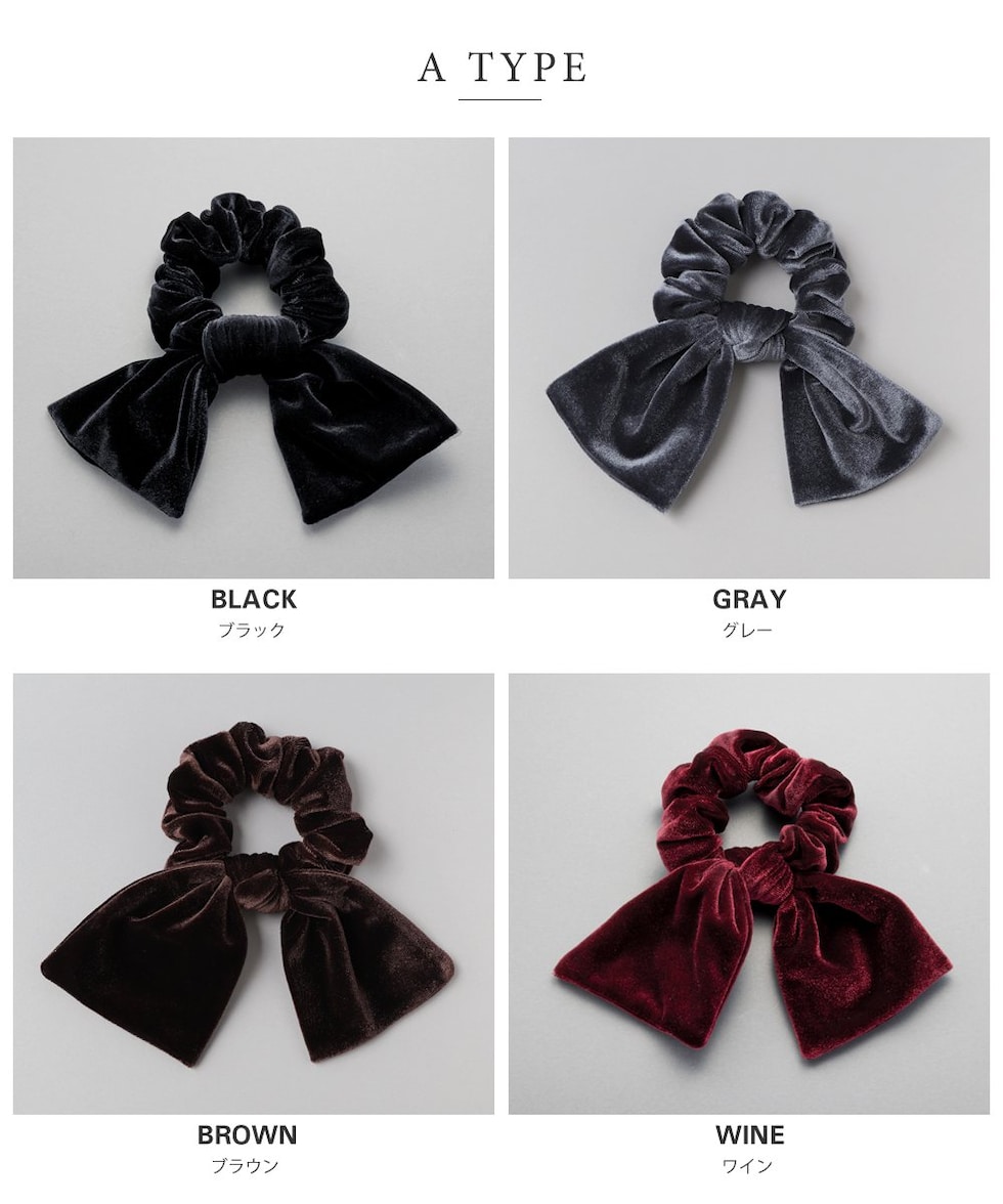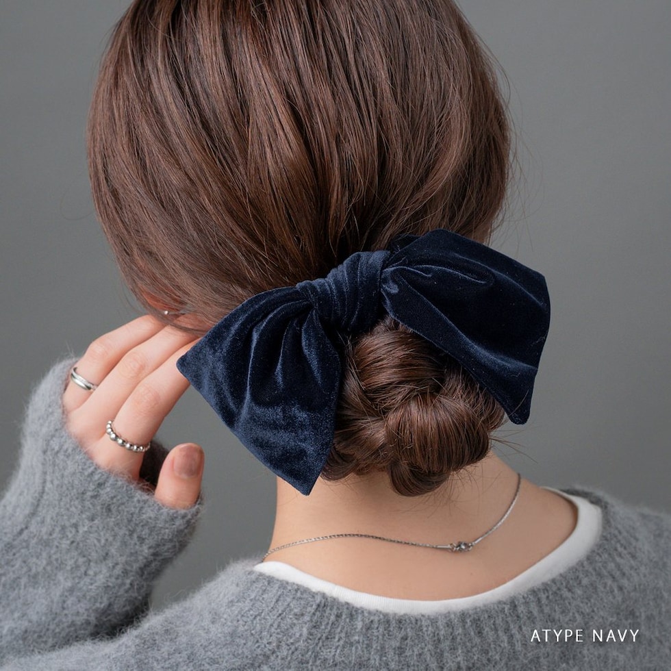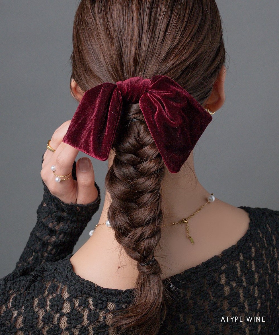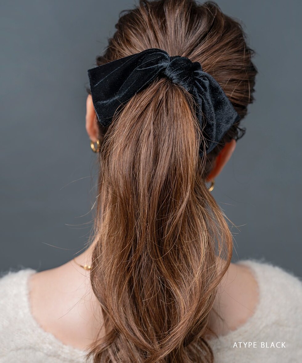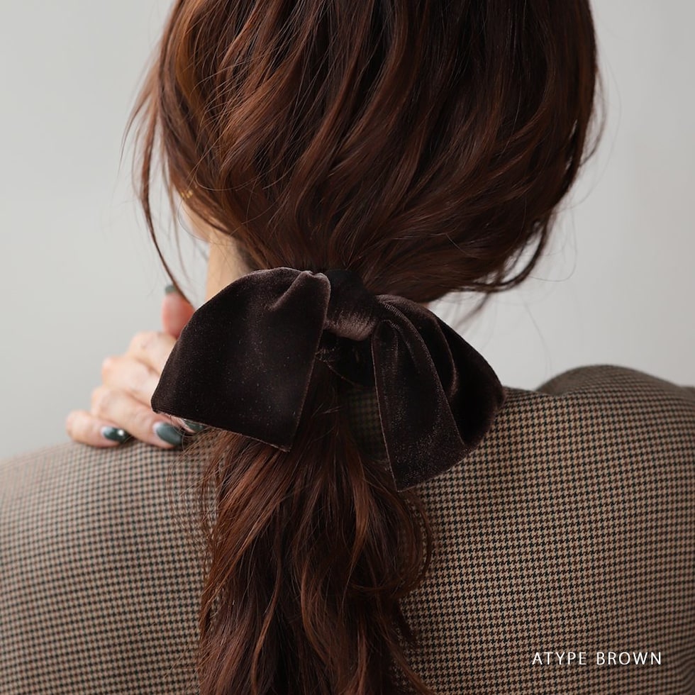 光沢感ある大きめベロアリボンのシュシュ。ポニーに沿って垂れるスクエア型リボンがアレンジをグッとオシャレな雰囲気に仕上げます。大人に似合うシックなカラーとサッと装着できるシュシュで普段使いしやすいアイテムです。