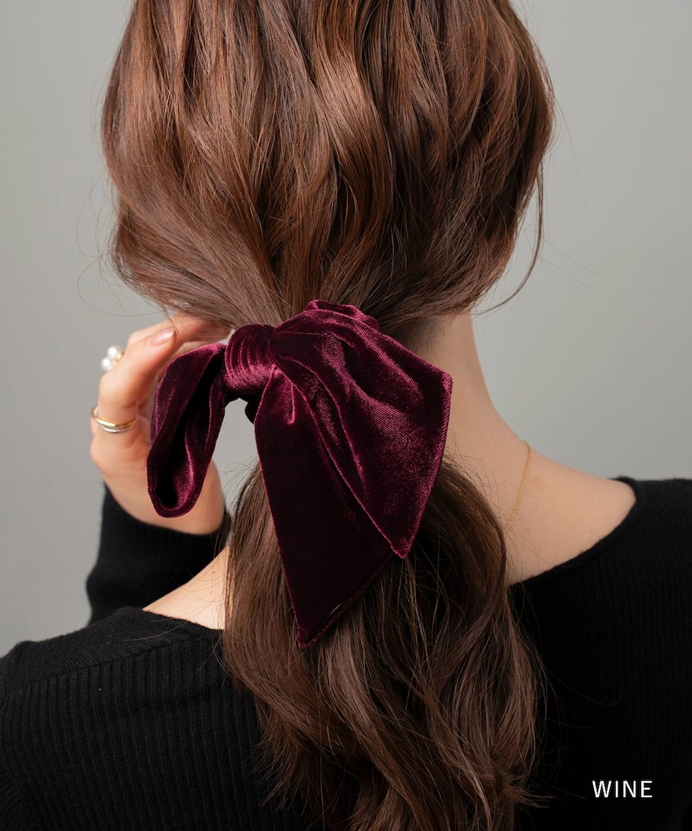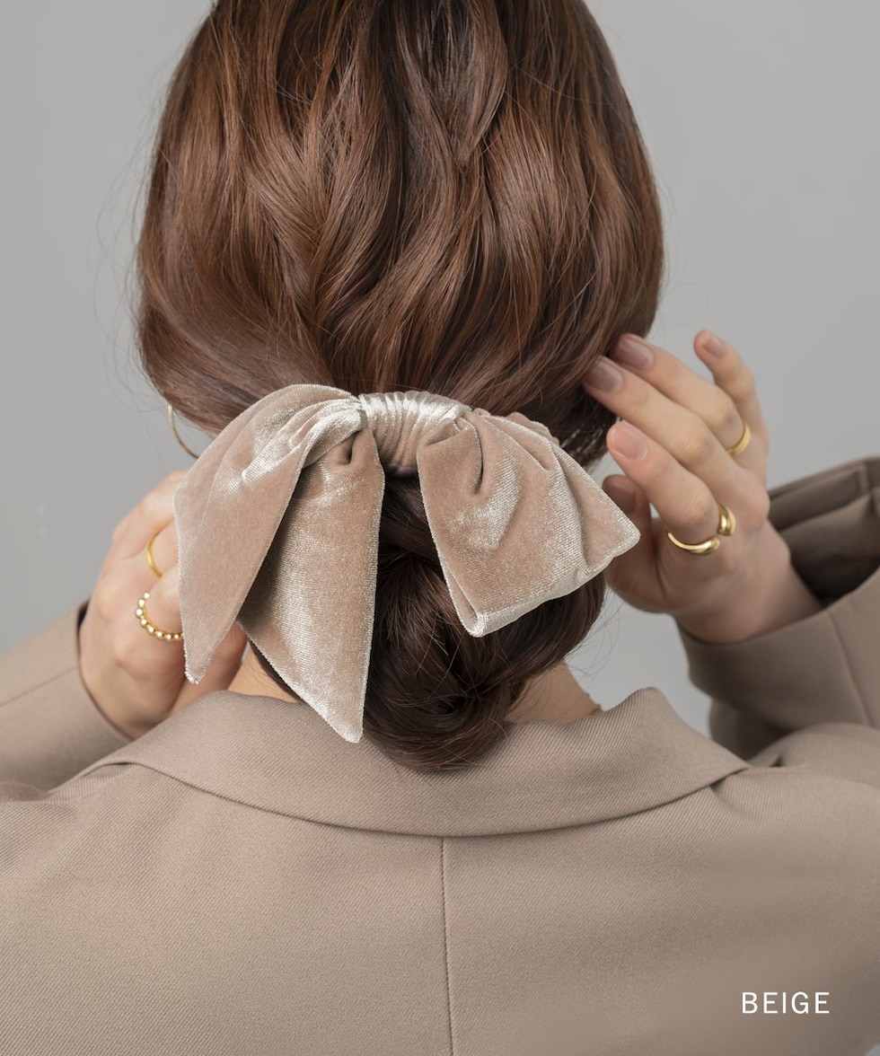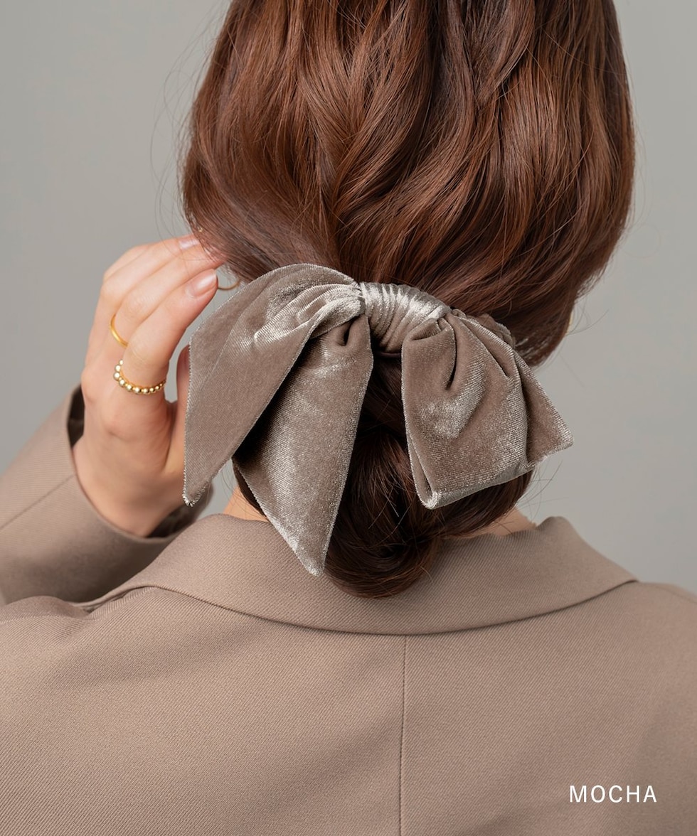 光沢感ある大きめベロアリボンのシュシュ。ラフな雰囲気のアシンメトリーなリボンがアレンジをグッとオシャレな雰囲気に仕上げます。大人に似合うシックなカラーとサッと装着できるシュシュで普段使いしやすいアイテムです。