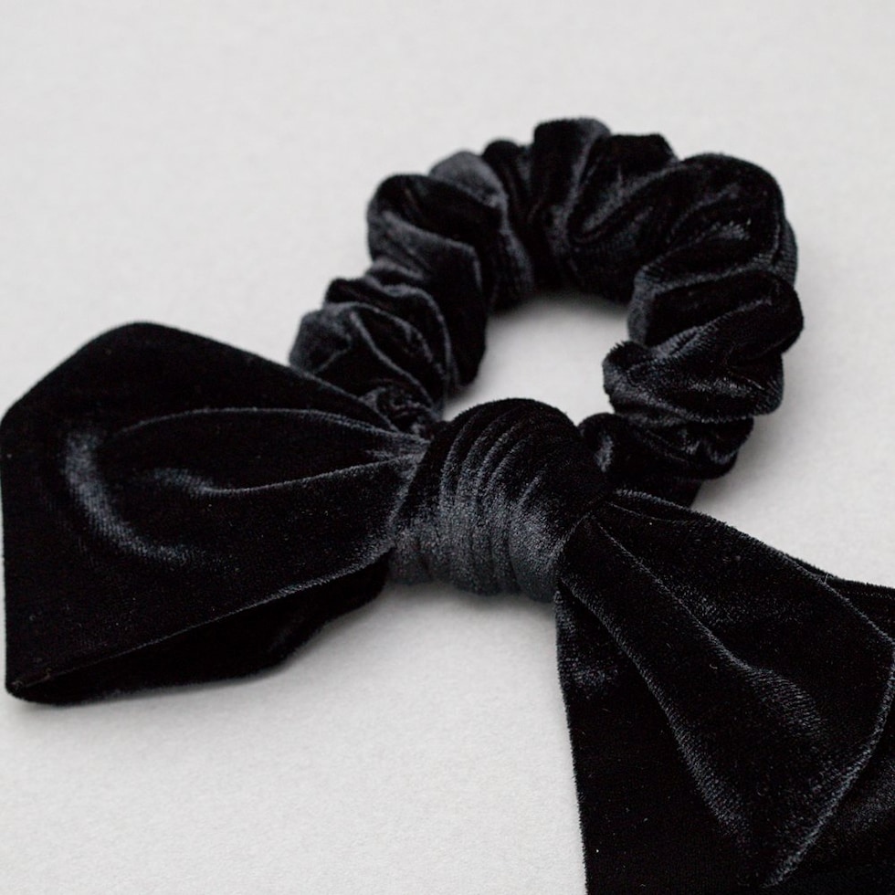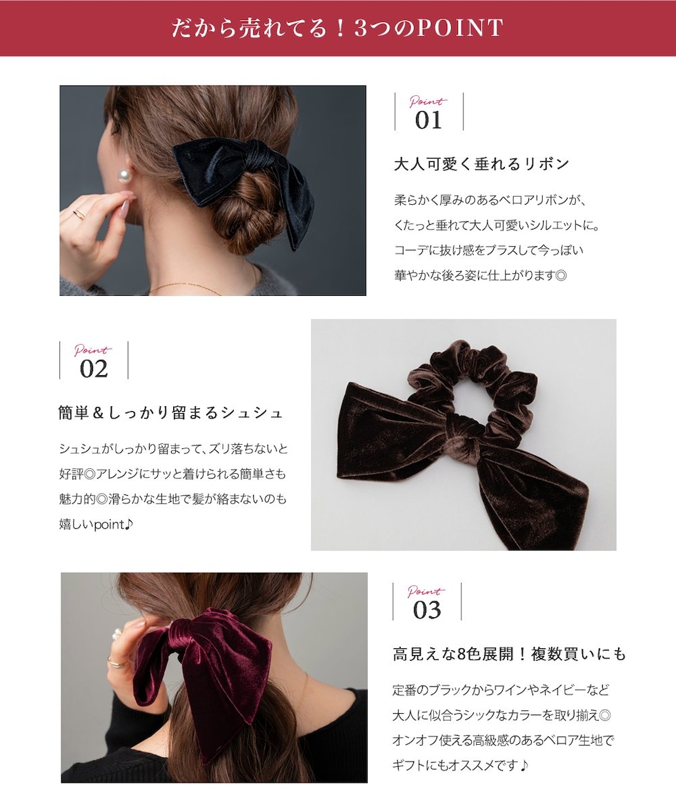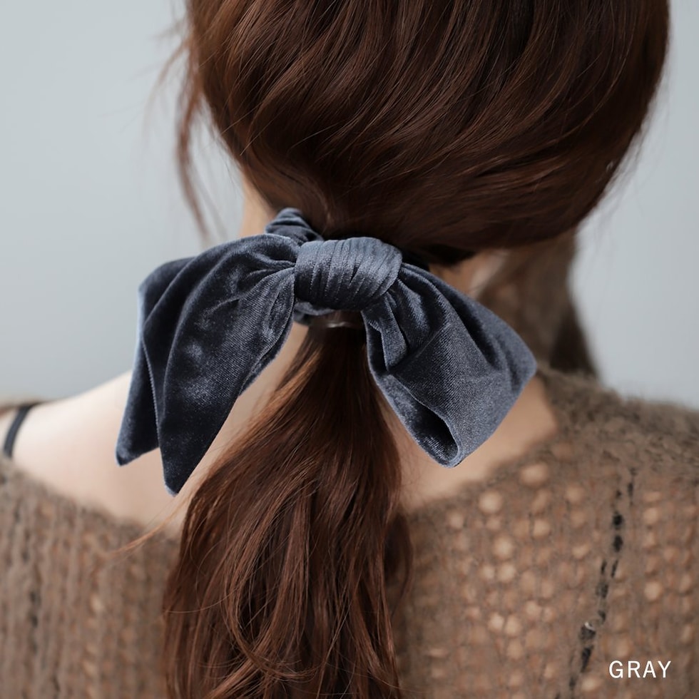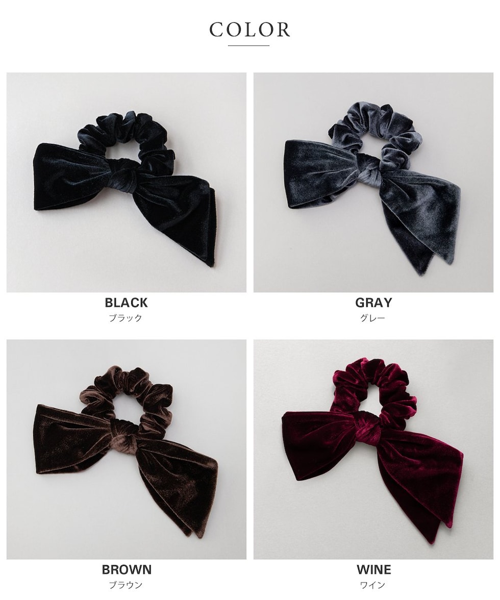 光沢感ある大きめベロアリボンのシュシュ。ラフな雰囲気のアシンメトリーなリボンがアレンジをグッとオシャレな雰囲気に仕上げます。大人に似合うシックなカラーとサッと装着できるシュシュで普段使いしやすいアイテムです。