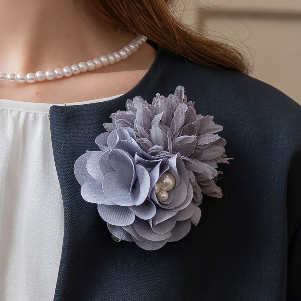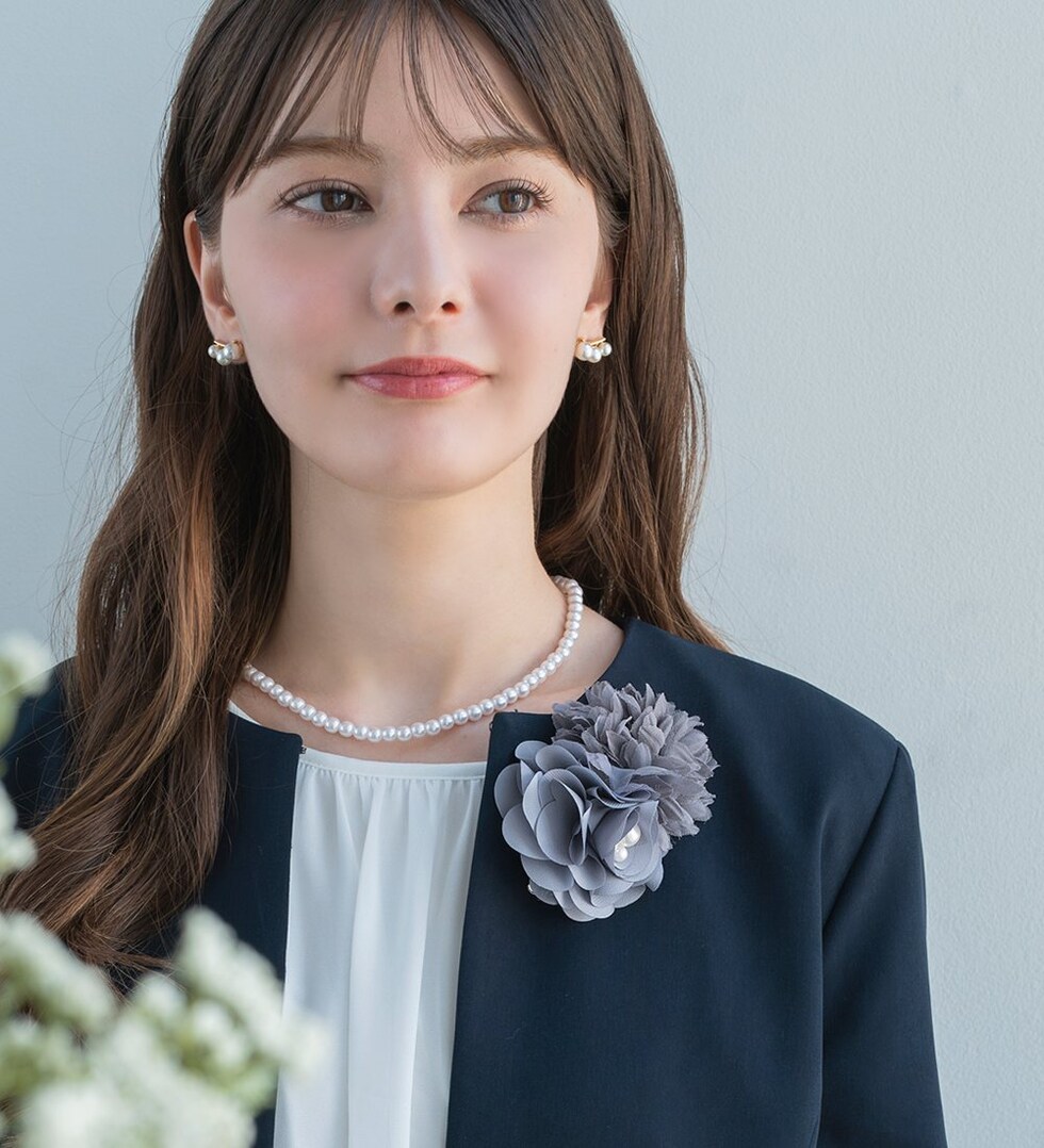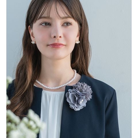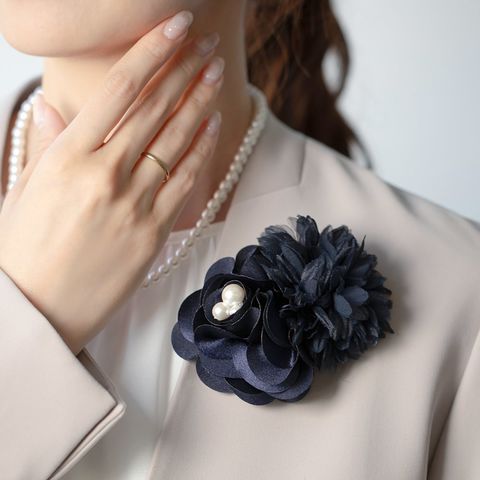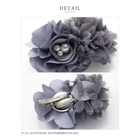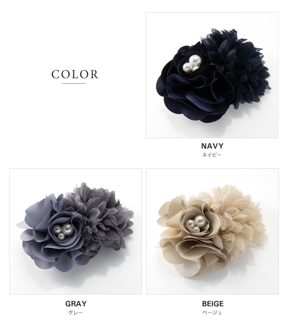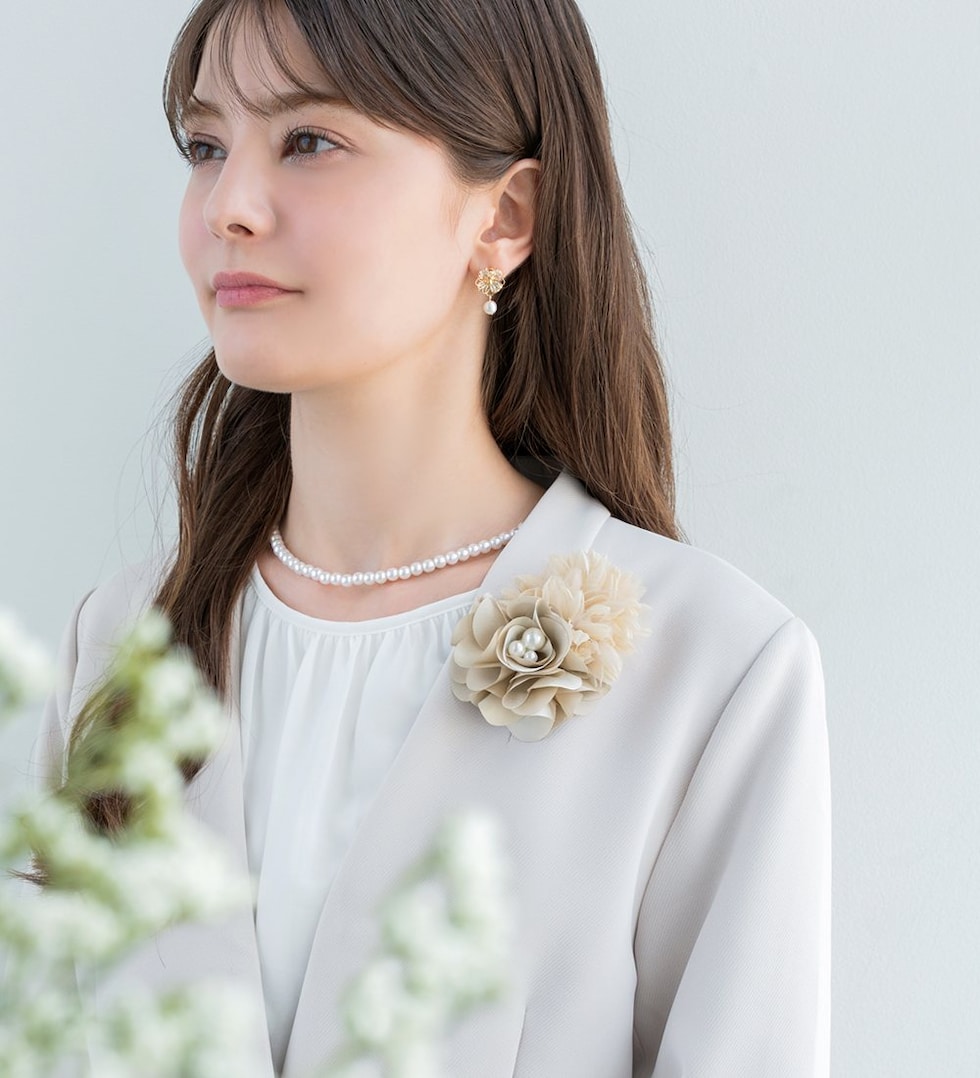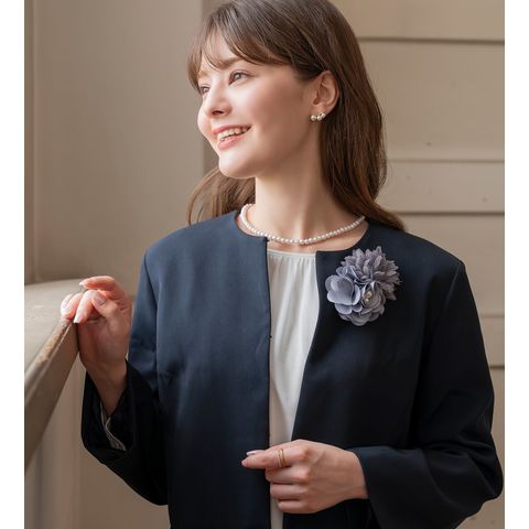 デザイン違いのフラワーを組み合わせたコサージュ。大人っぽくニュアンスのあるカラーリングで品よくスタイリングできます。フォーマルやパーティーシーンのスタイルのワンポイントに活躍間違いなし♪