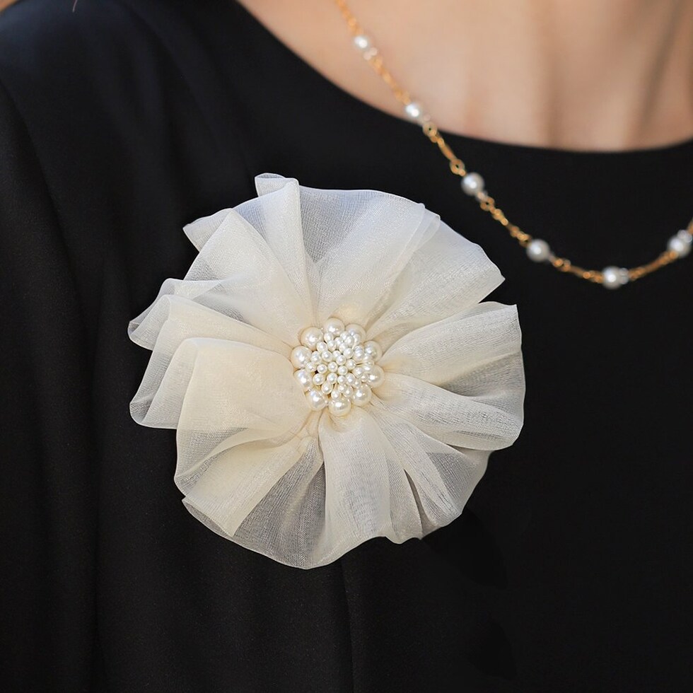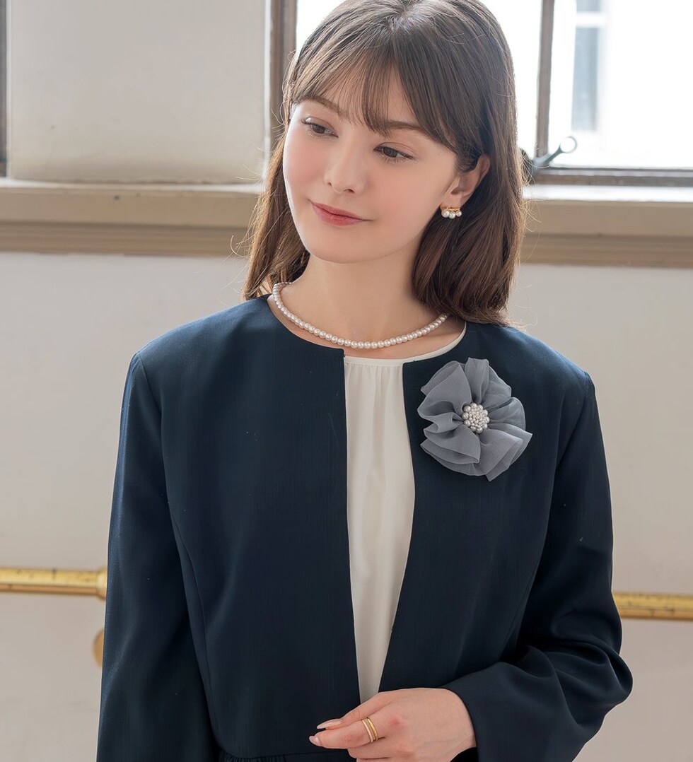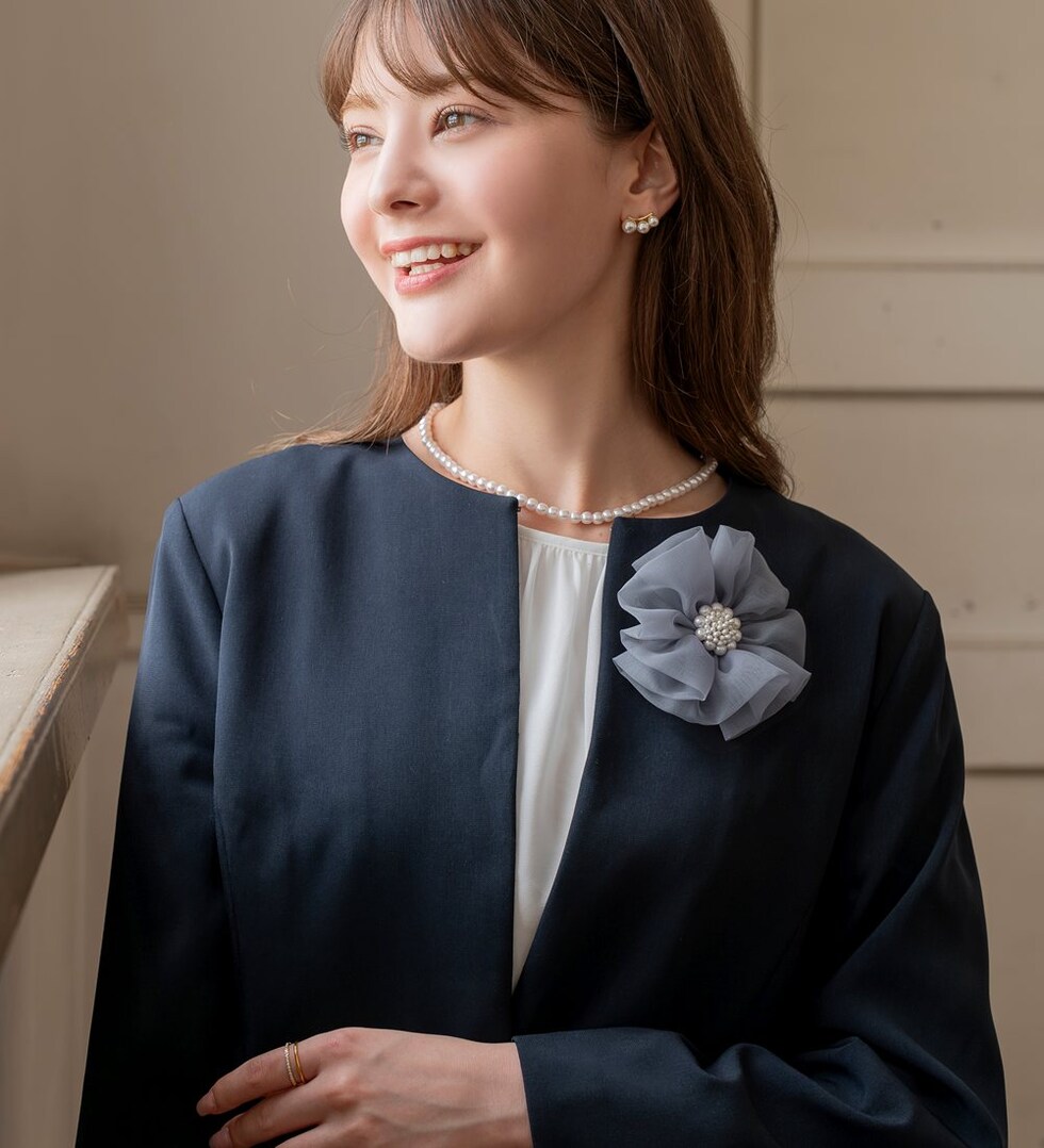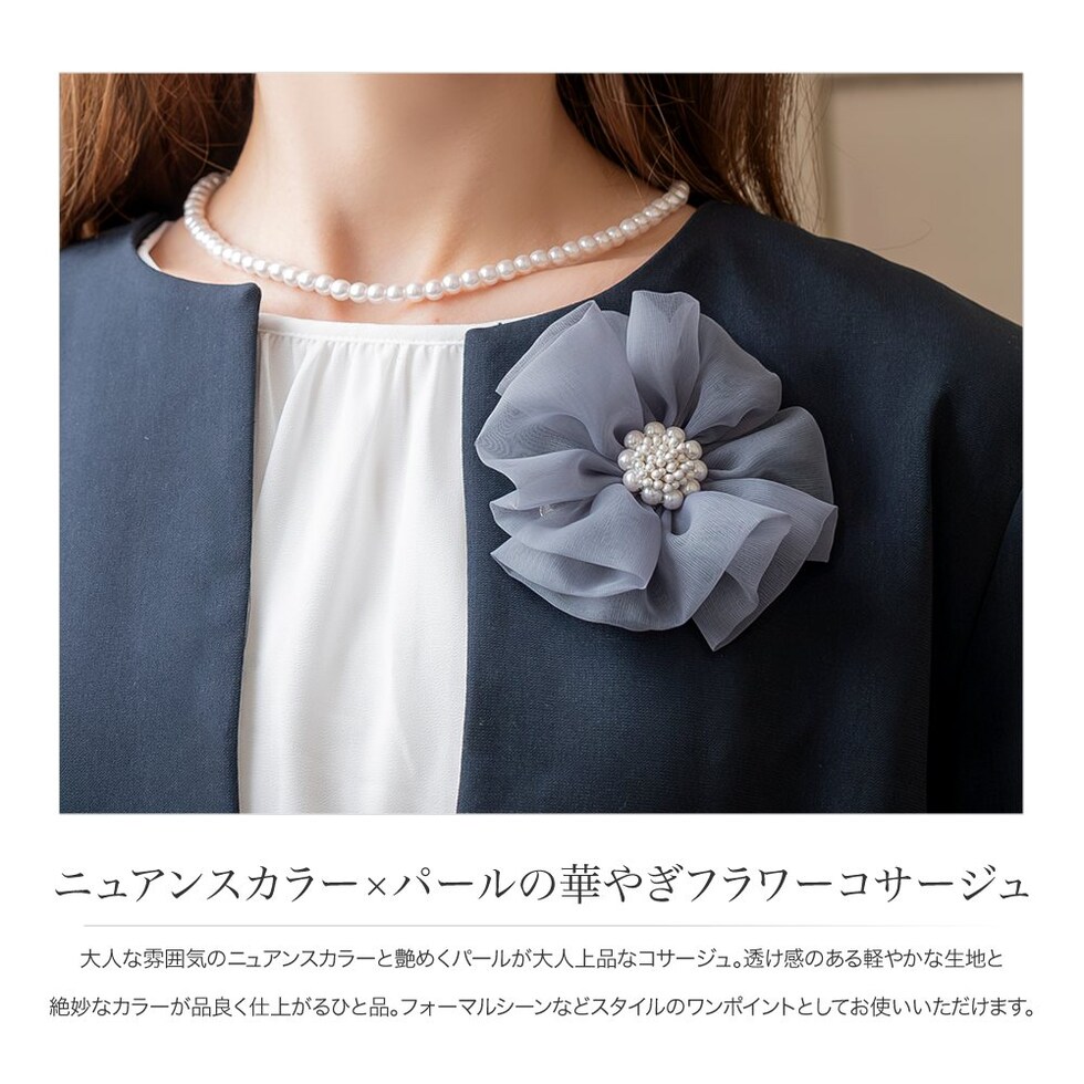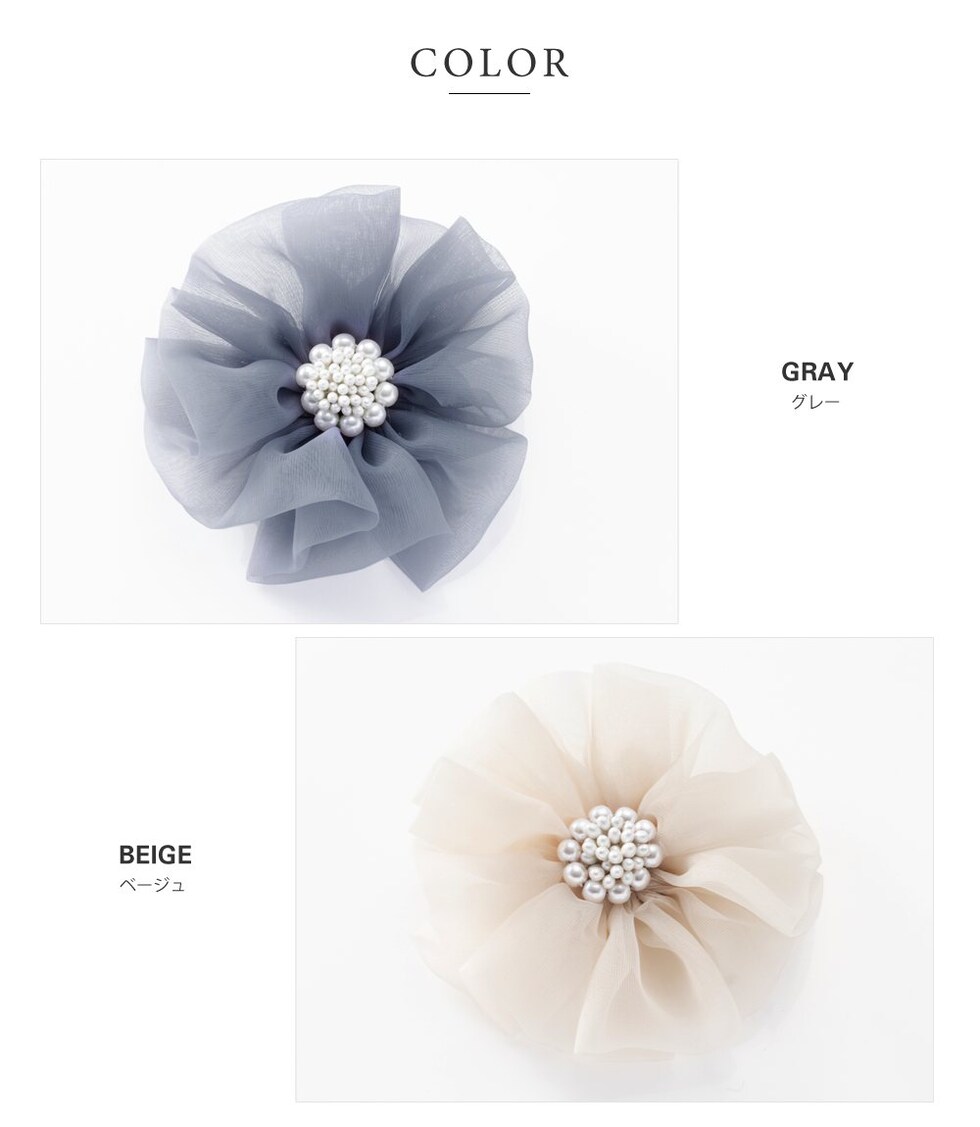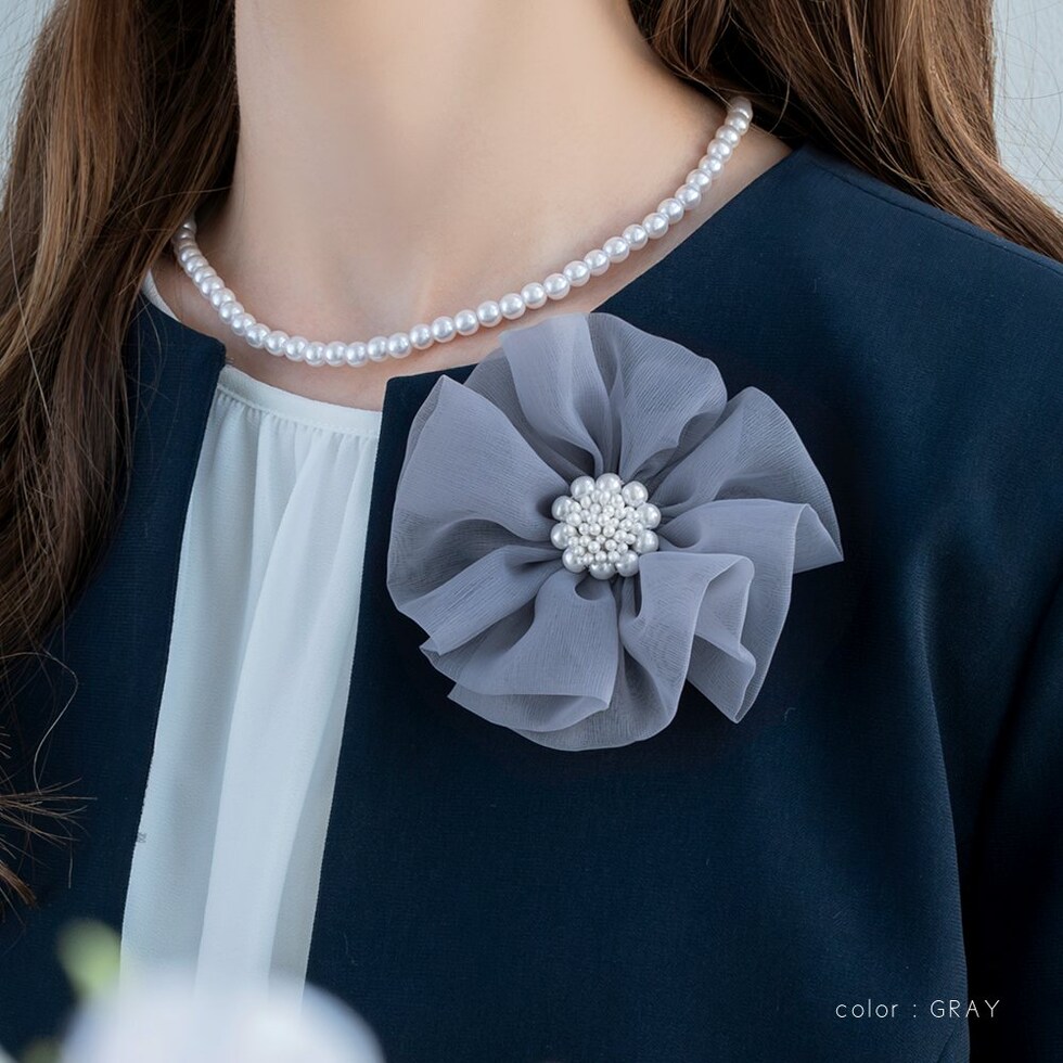大人な雰囲気のニュアンスカラーと艶めくパールが大人上品なコサージュ。透け感のある軽やかな生地と絶妙なカラーが品良く仕上がるひと品。フォーマルシーンなどスタイルのワンポイントとしてお使いいただけます。