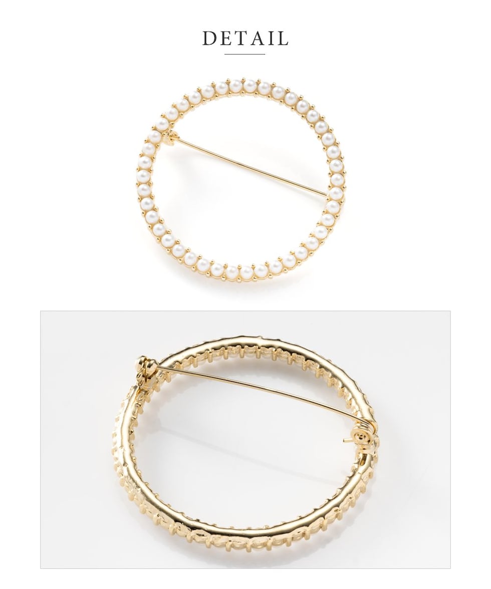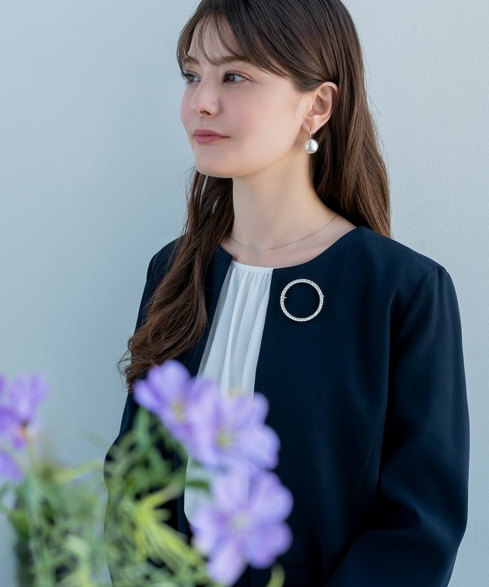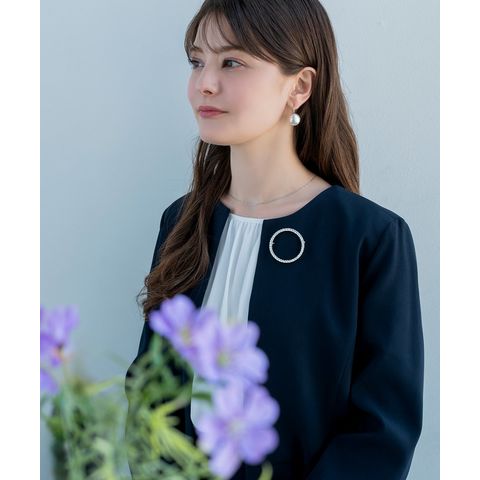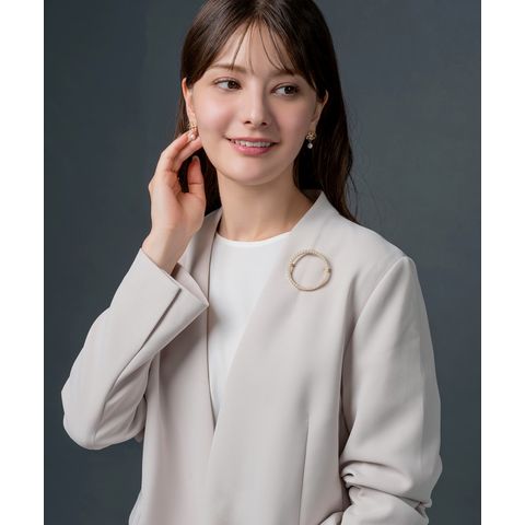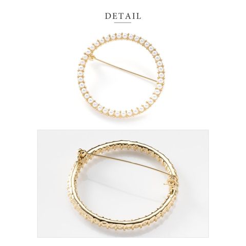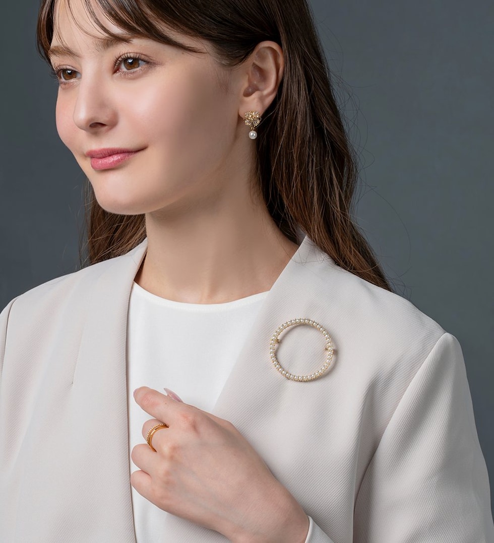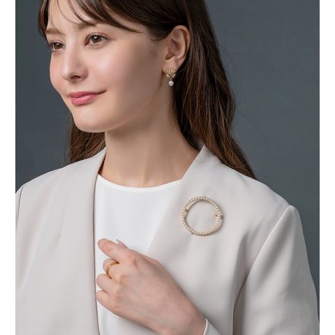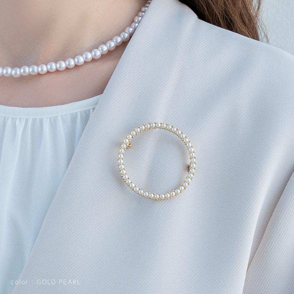 小粒なパール/ビジューの大人上品なブローチ。派手過ぎないシンプルなサークルデザインがこなれた印象を演出します。お祝いシーンなど華やかな装いのワンポイント使いにおすすめです。