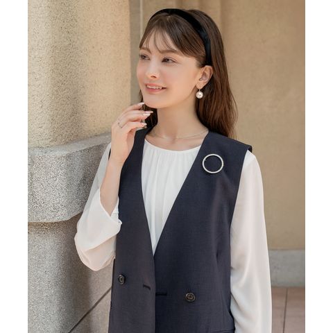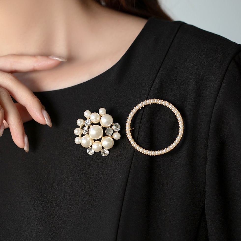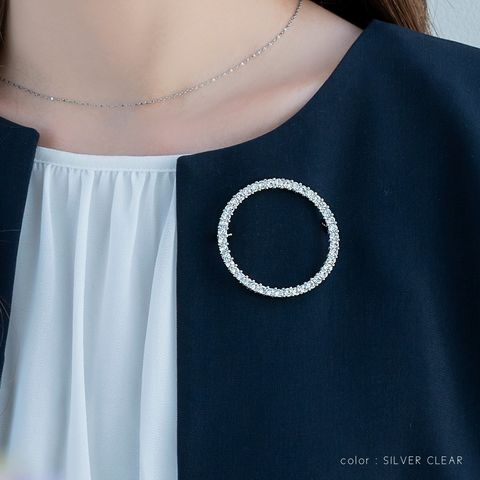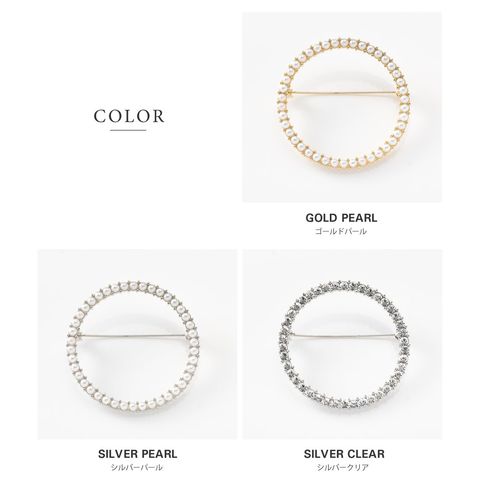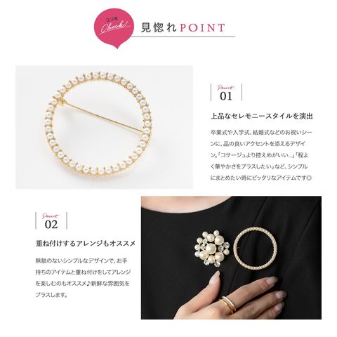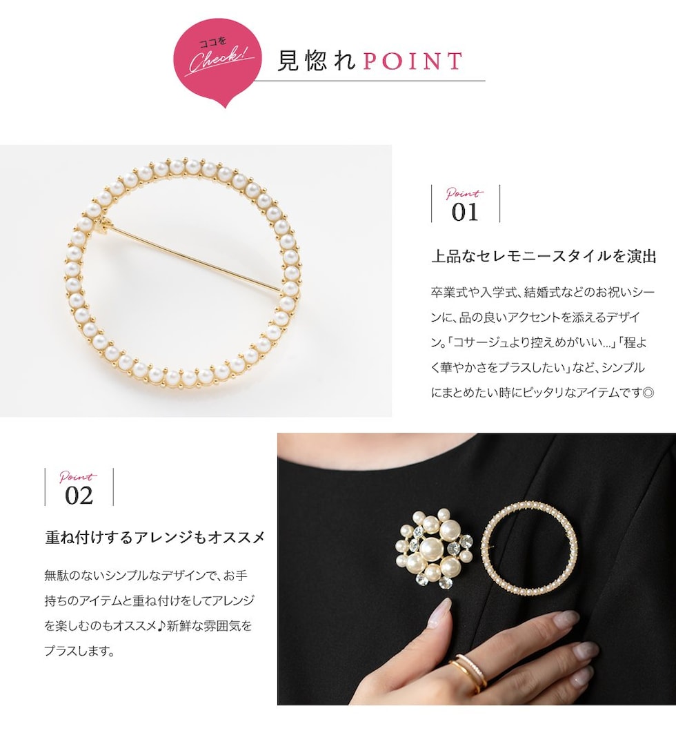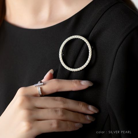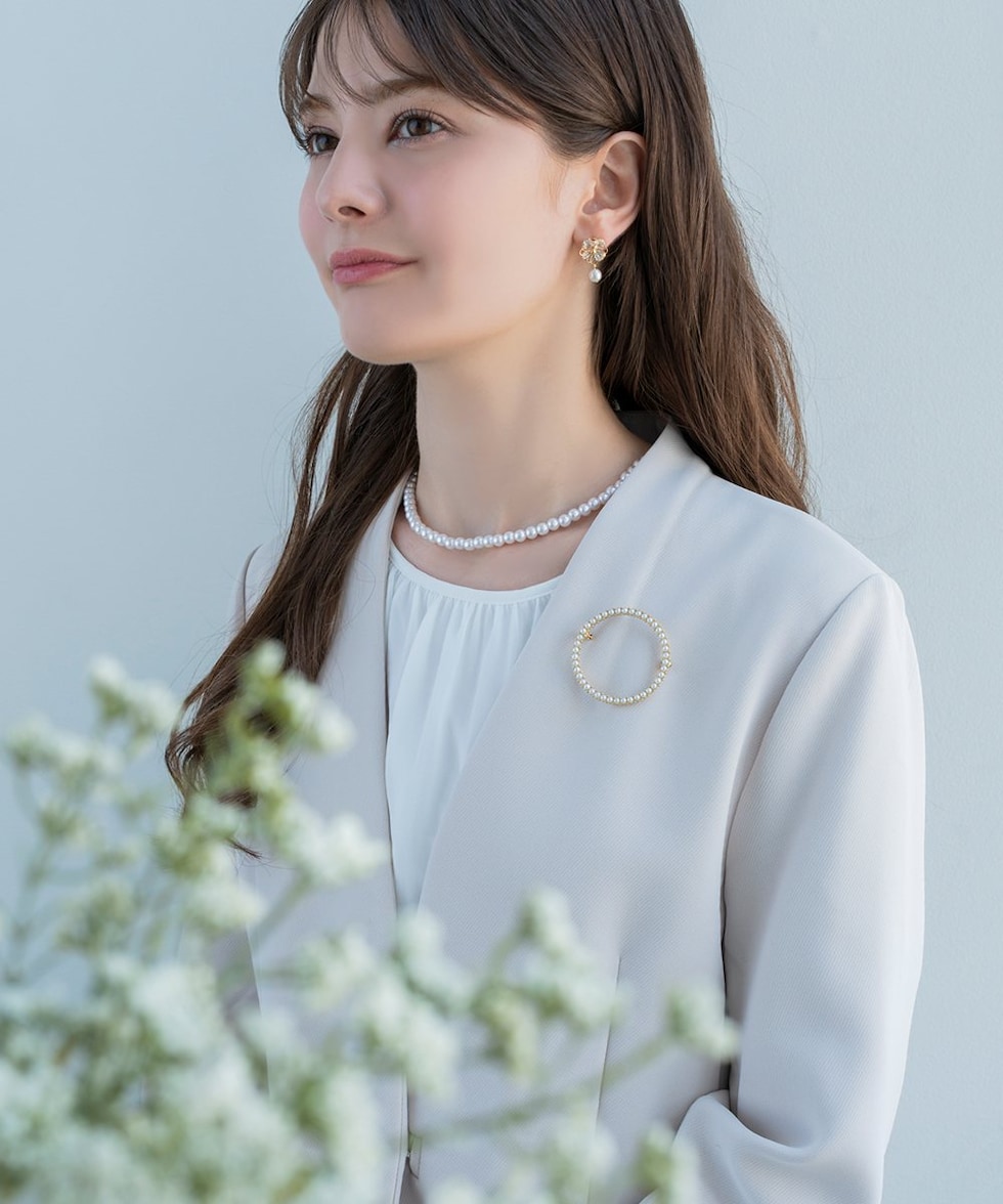 小粒なパール/ビジューの大人上品なブローチ。派手過ぎないシンプルなサークルデザインがこなれた印象を演出します。お祝いシーンなど華やかな装いのワンポイント使いにおすすめです。