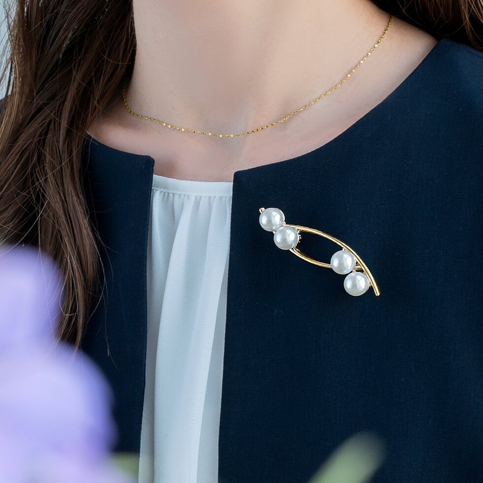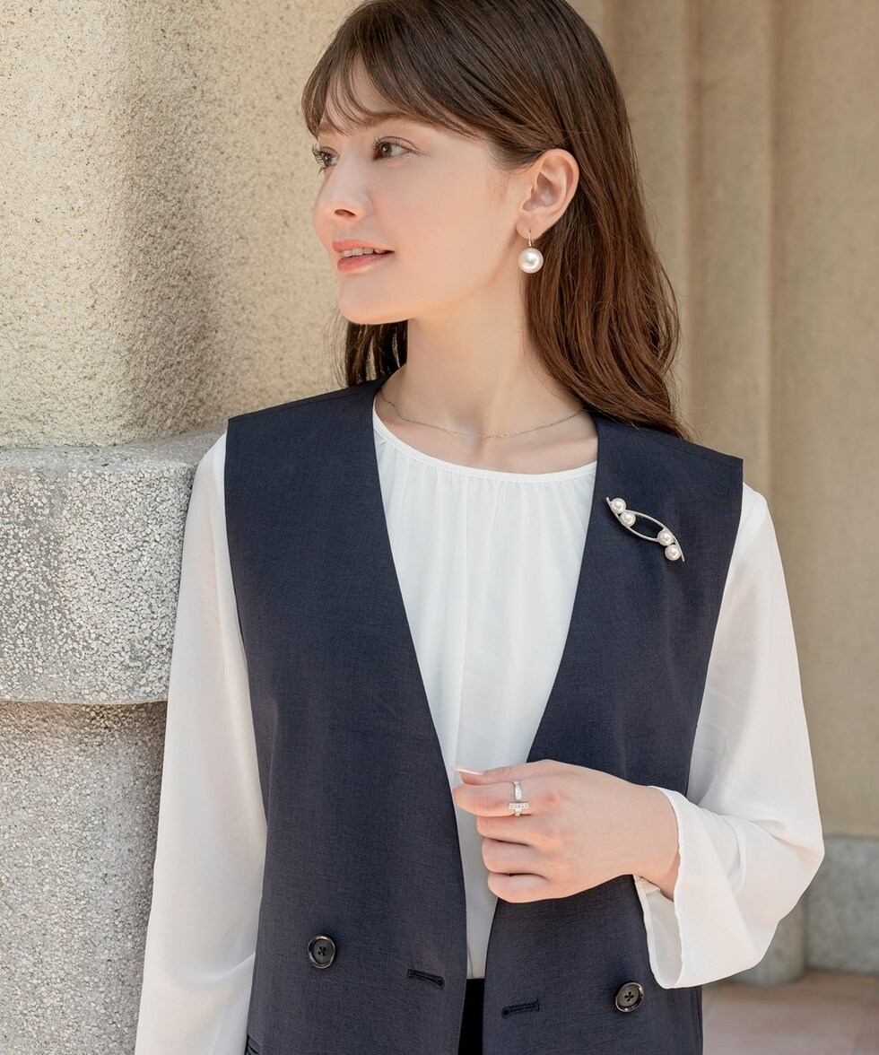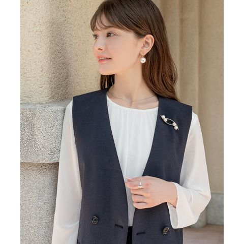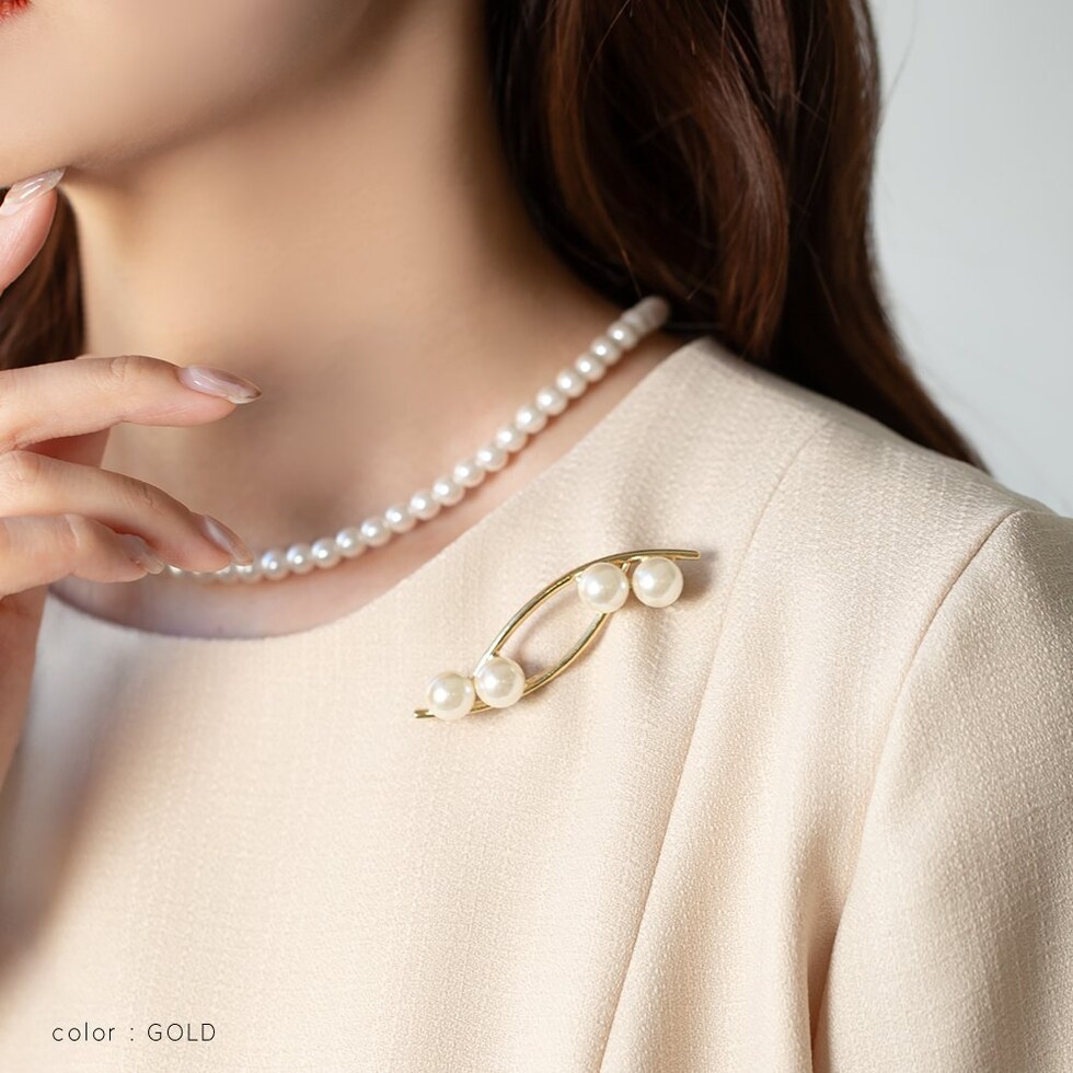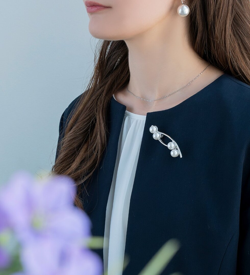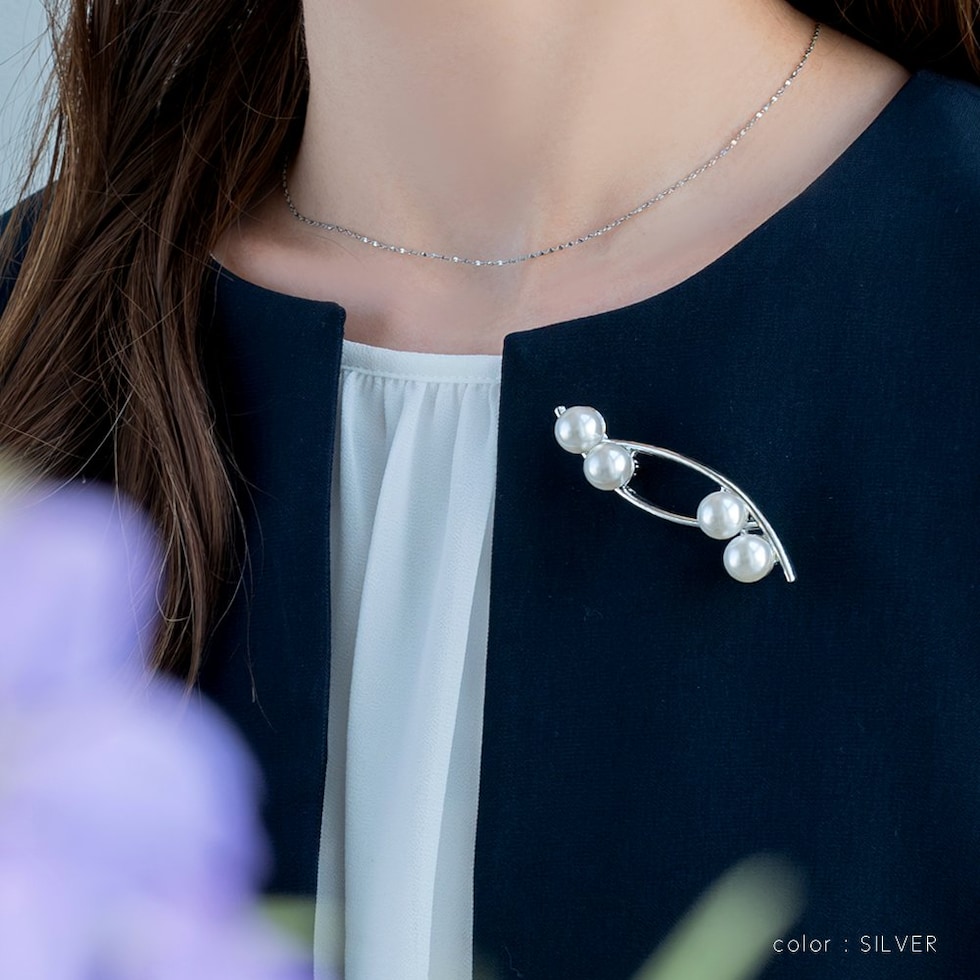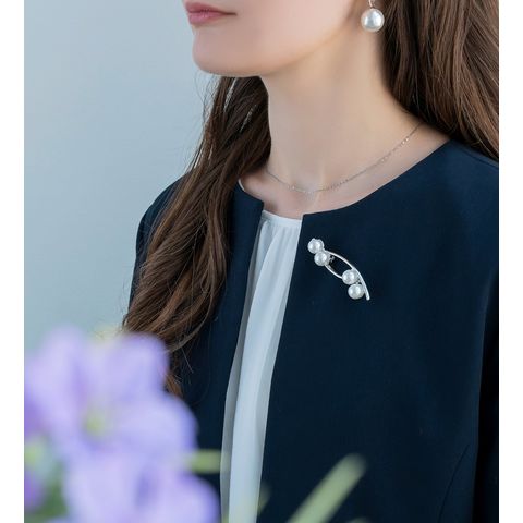 パールとクロスラインのメタルが大人上品なブローチ。柔らかで優美なデザインが品の良い印象を胸元に演出します。お祝いシーンなど華やかな装いのワンポイント使いにおすすめです。