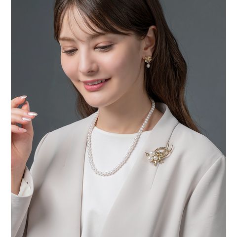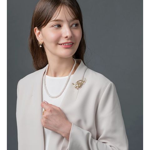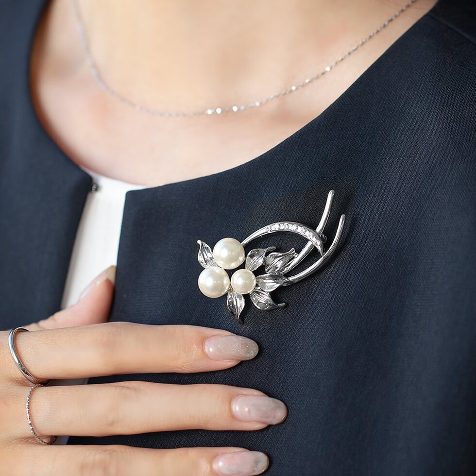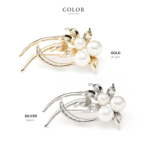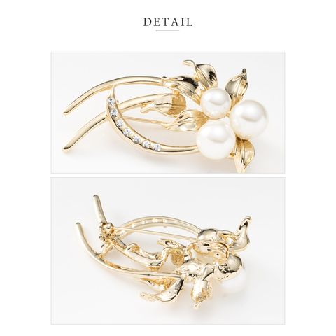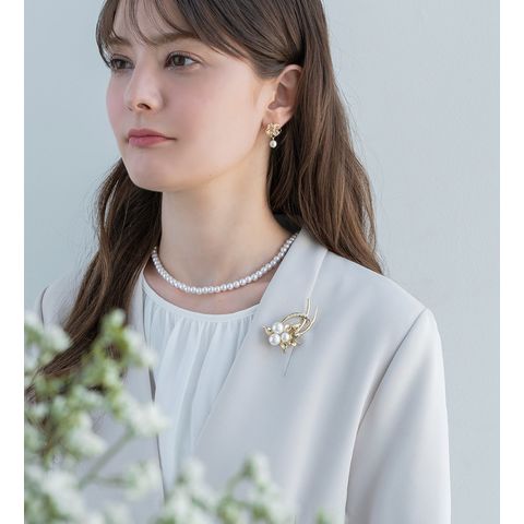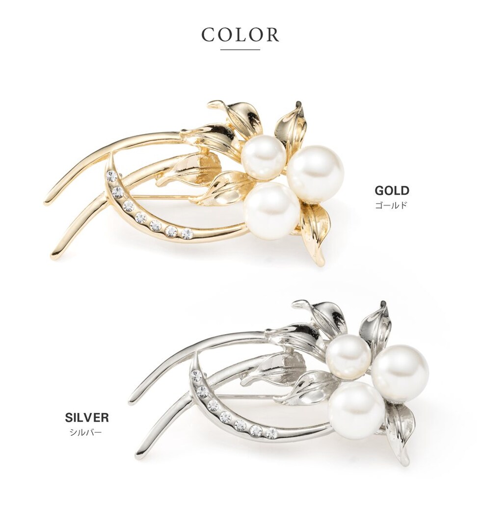 三粒のパールとリーフの組み合わせが上品なブローチ。煌めくビジューもワンポイントに♪程よい存在感を放ちコーデを品よくブラッシュアップしてくれます。お祝いシーンなど華やかな場での装いにオススメの一品です◎
