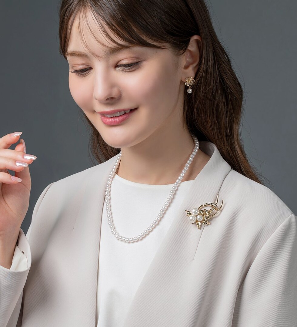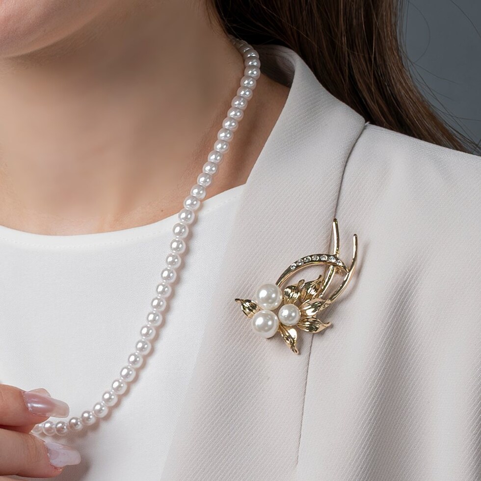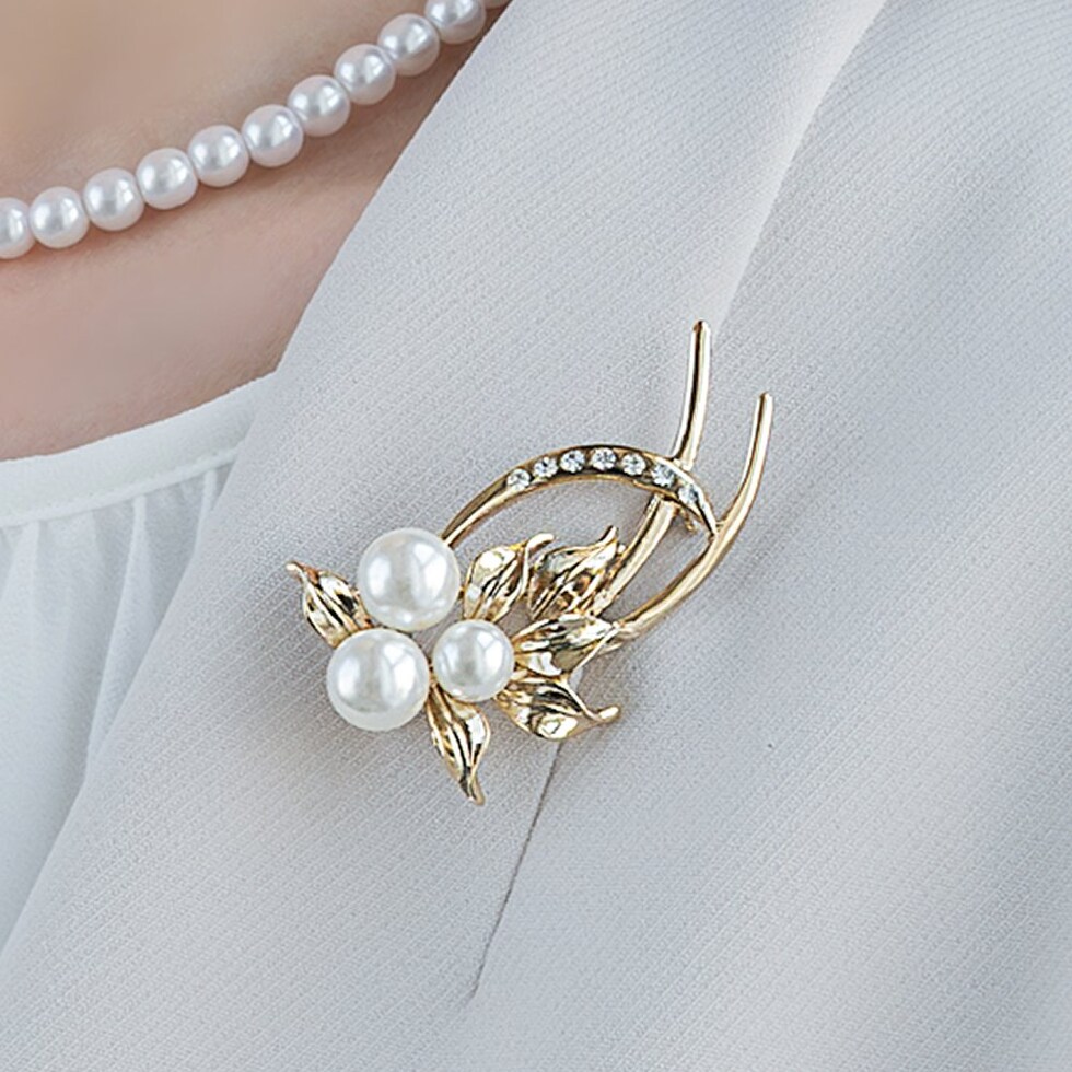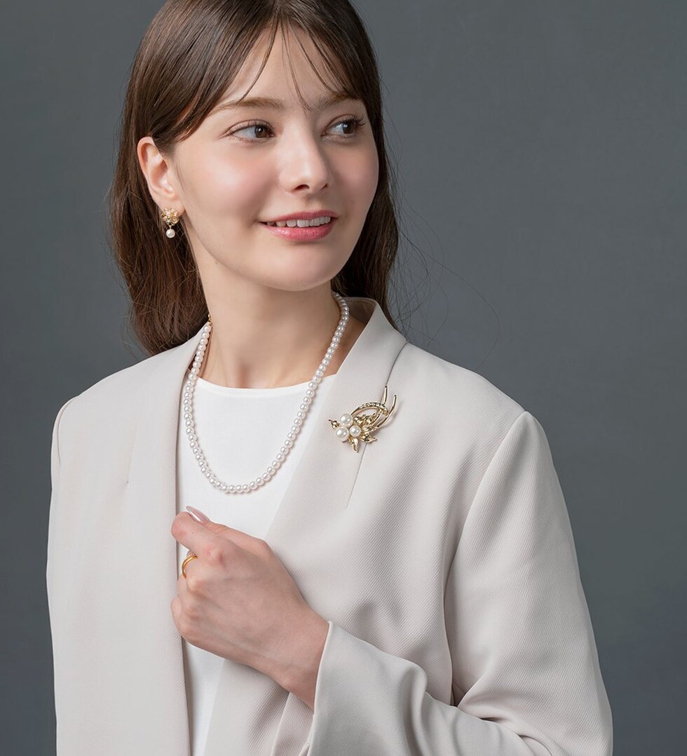 三粒のパールとリーフの組み合わせが上品なブローチ。煌めくビジューもワンポイントに♪程よい存在感を放ちコーデを品よくブラッシュアップしてくれます。お祝いシーンなど華やかな場での装いにオススメの一品です◎