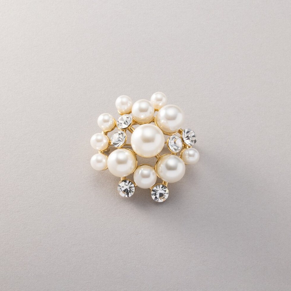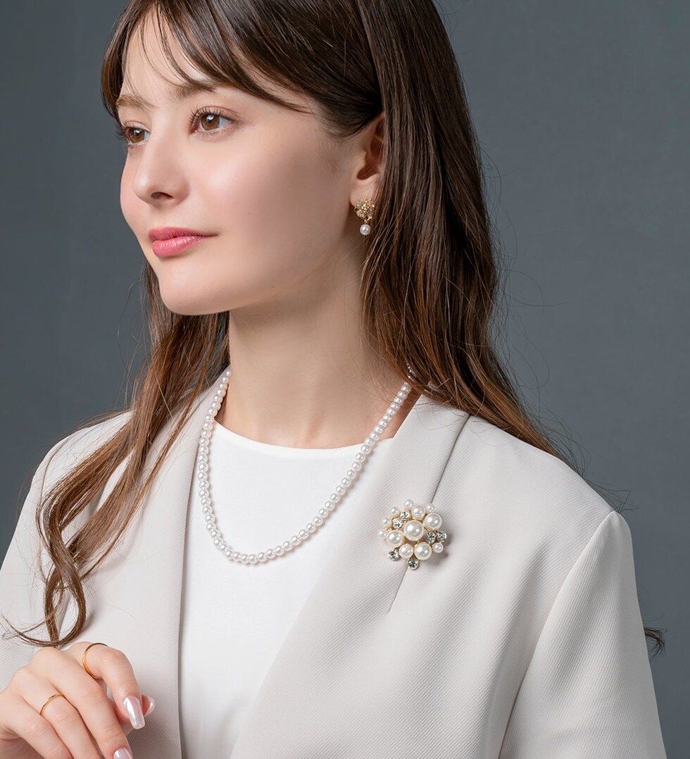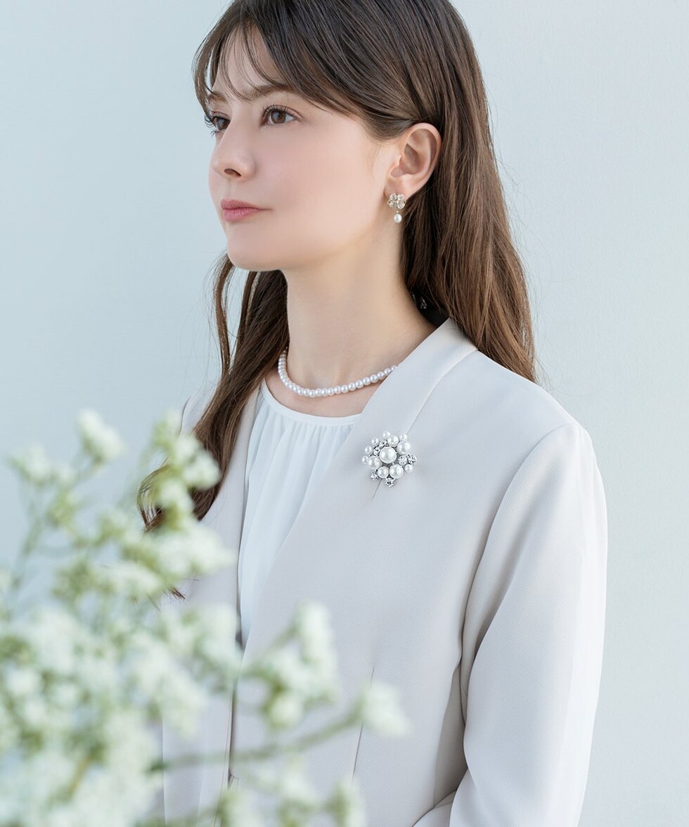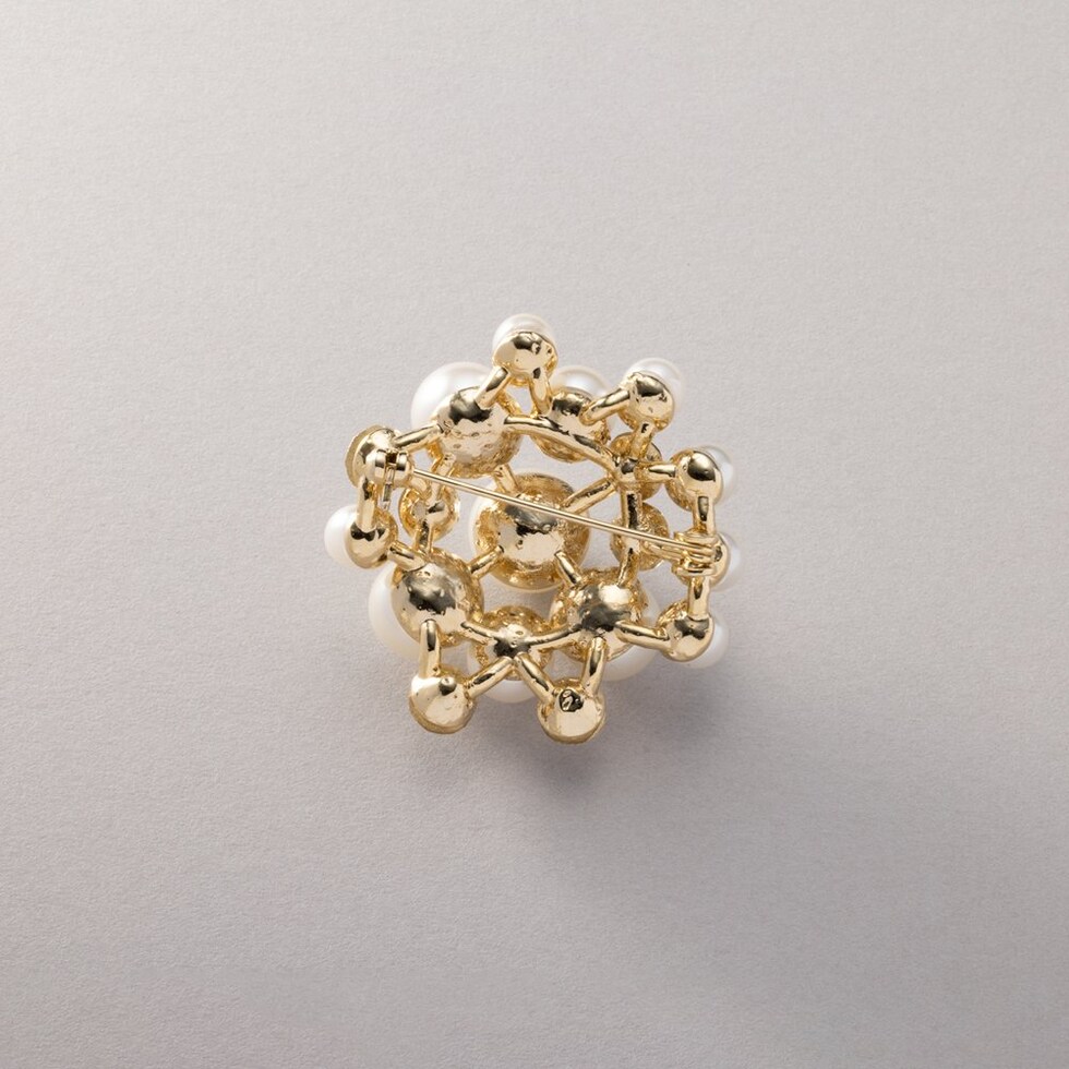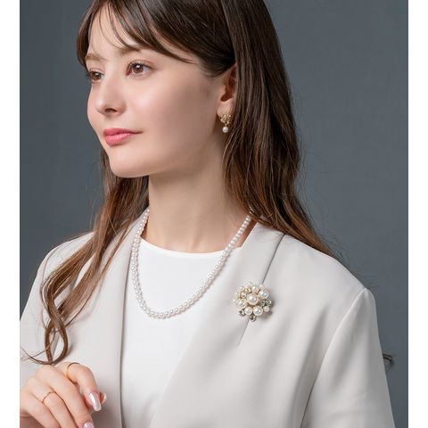 大きさの異なるパールとビジューの組み合わせが上品なブローチ。コンパクトなサイジングで程よい存在感を放ち、今っぽく仕上がる重ね付けにもオススメ◎お祝いシーンなど華やかな場での装いにぴったりな一品です。