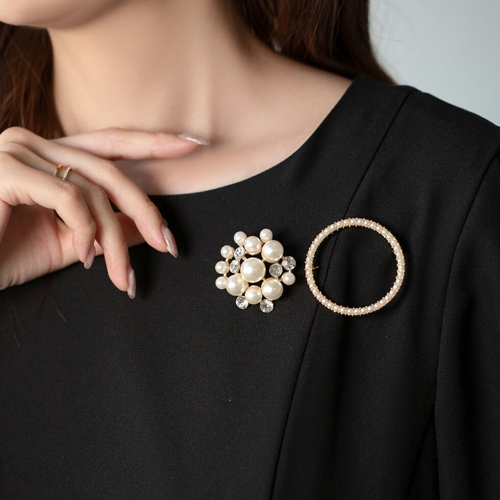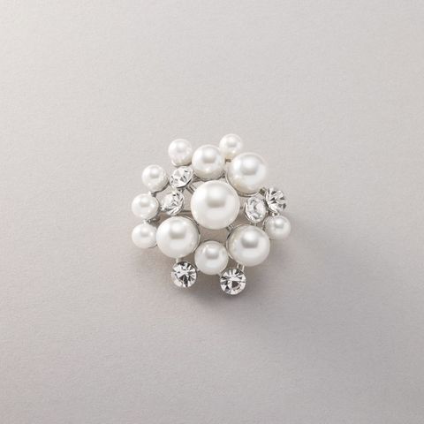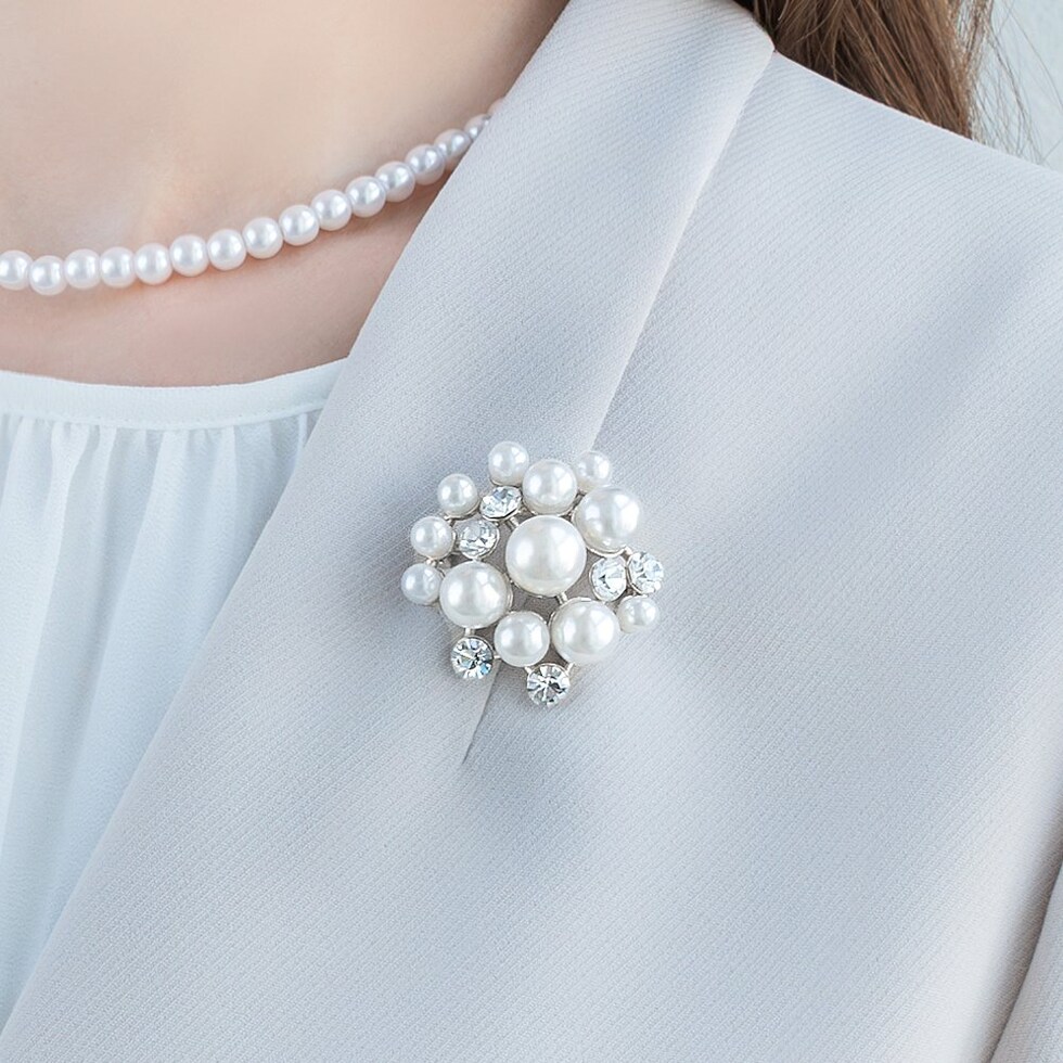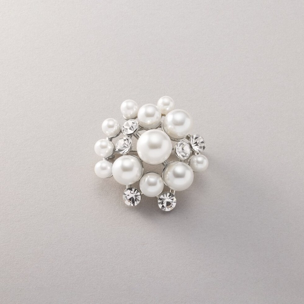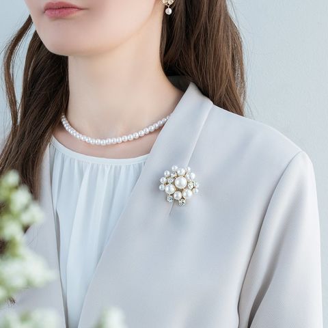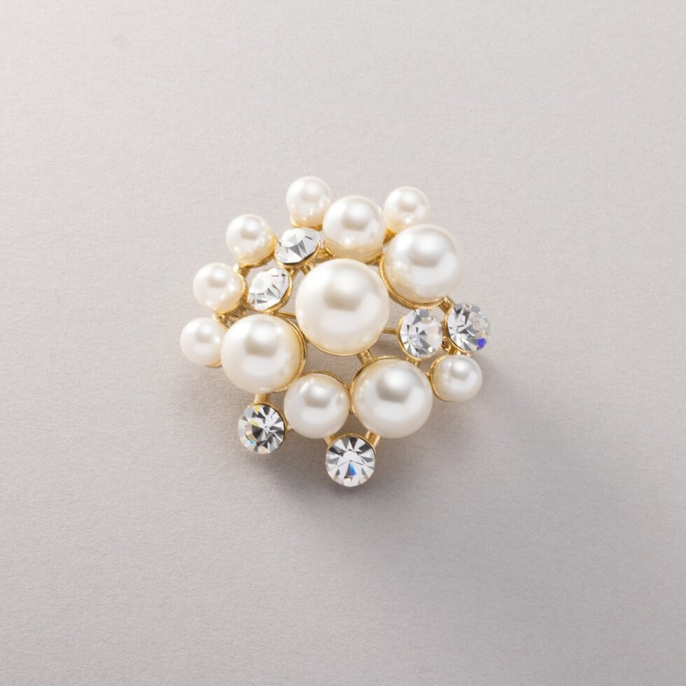 大きさの異なるパールとビジューの組み合わせが上品なブローチ。コンパクトなサイジングで程よい存在感を放ち、今っぽく仕上がる重ね付けにもオススメ◎お祝いシーンなど華やかな場での装いにぴったりな一品です。
