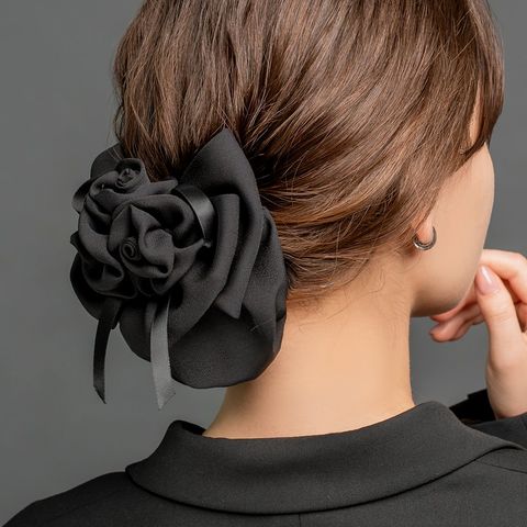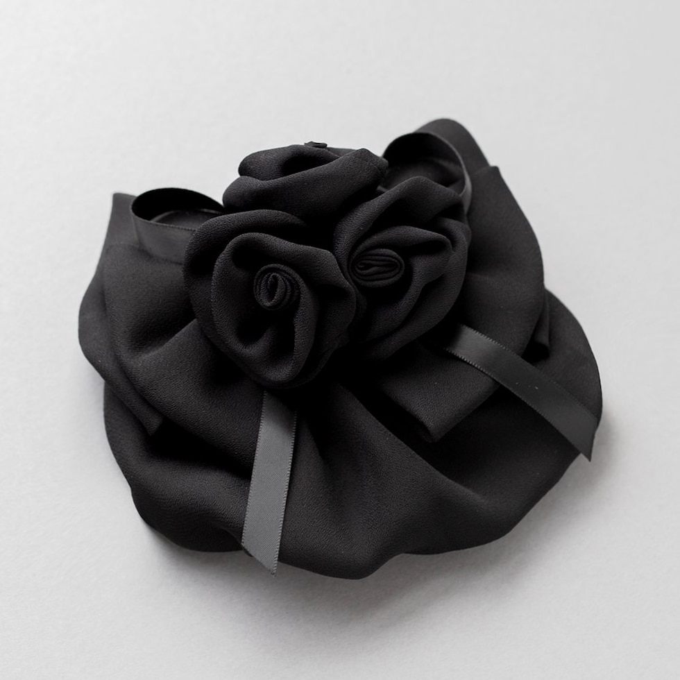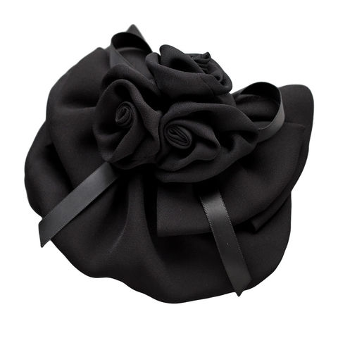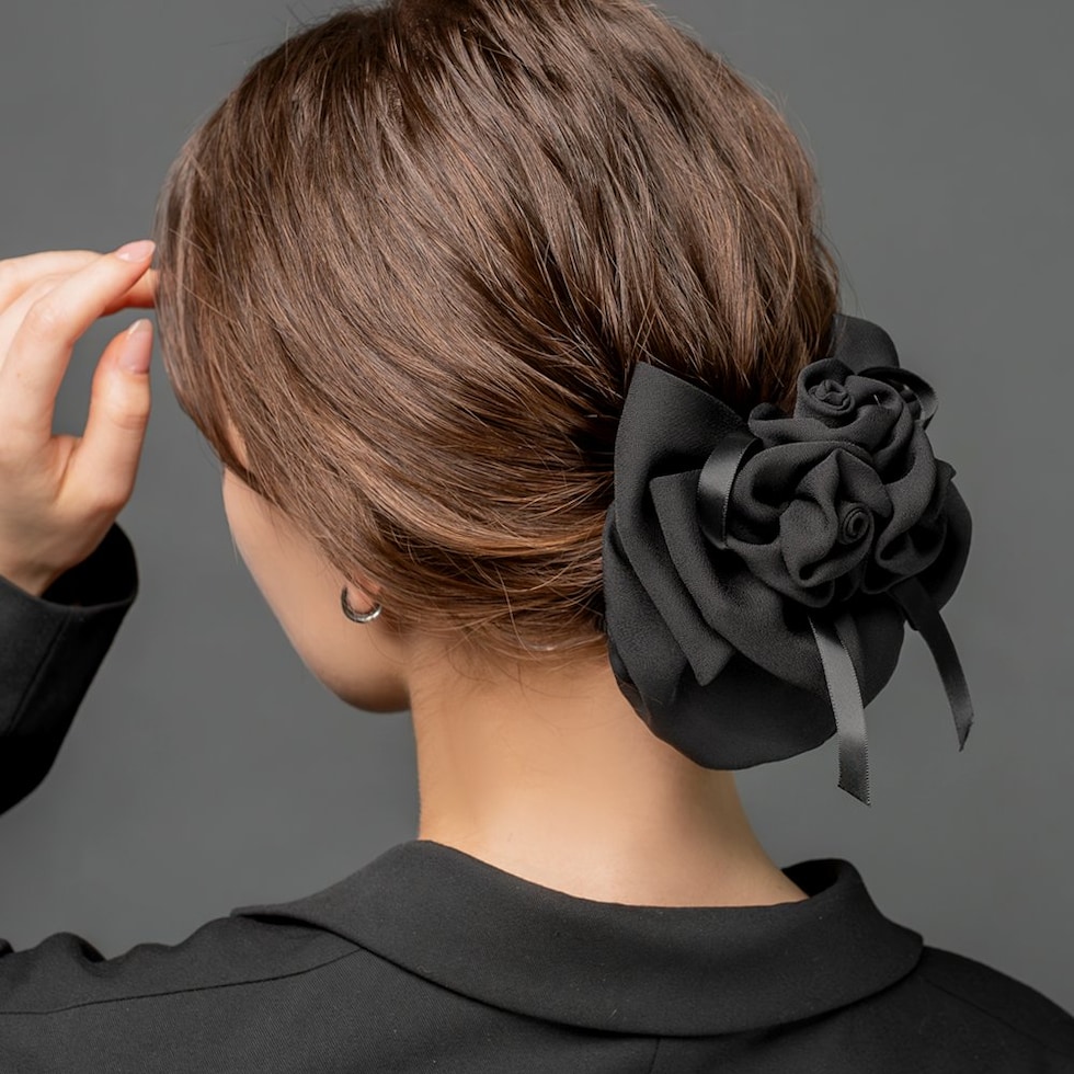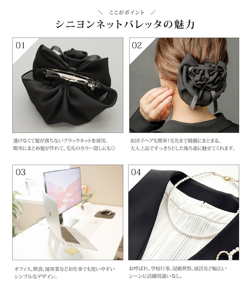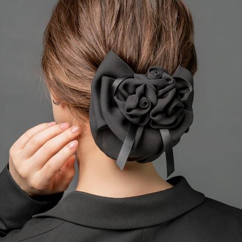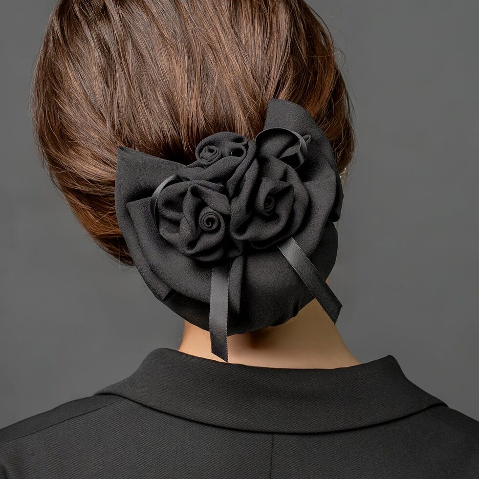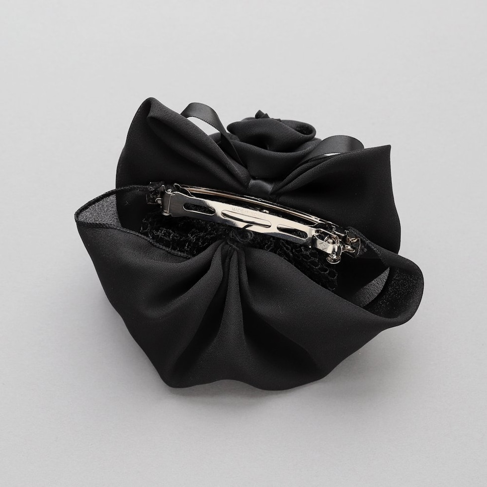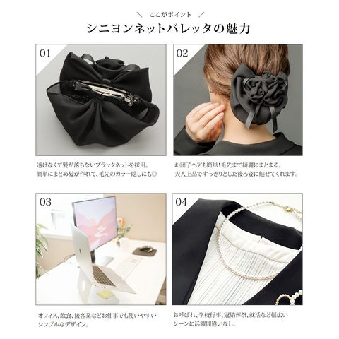 束ねたフラワーと重なりリボンが華やかな印象のシニヨンネット付きバレッタ。程よくボリュームのあるフラワーのデザインがシニヨンスタイルにアクセントを添えてくれるひと品。ブラックネットだから毛先のカラーも隠せて、オフィスや冠婚葬祭など幅広いシーンで活躍間違いなし◎