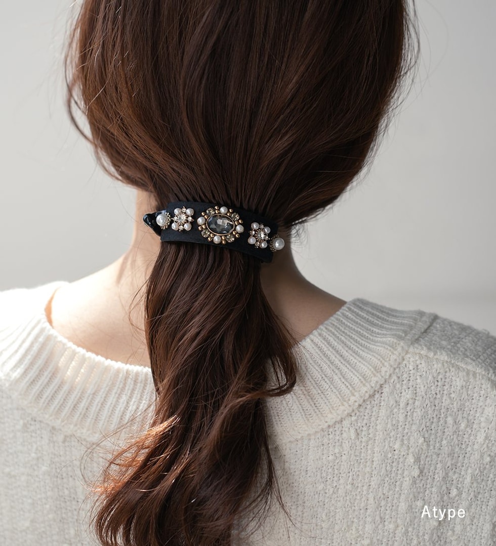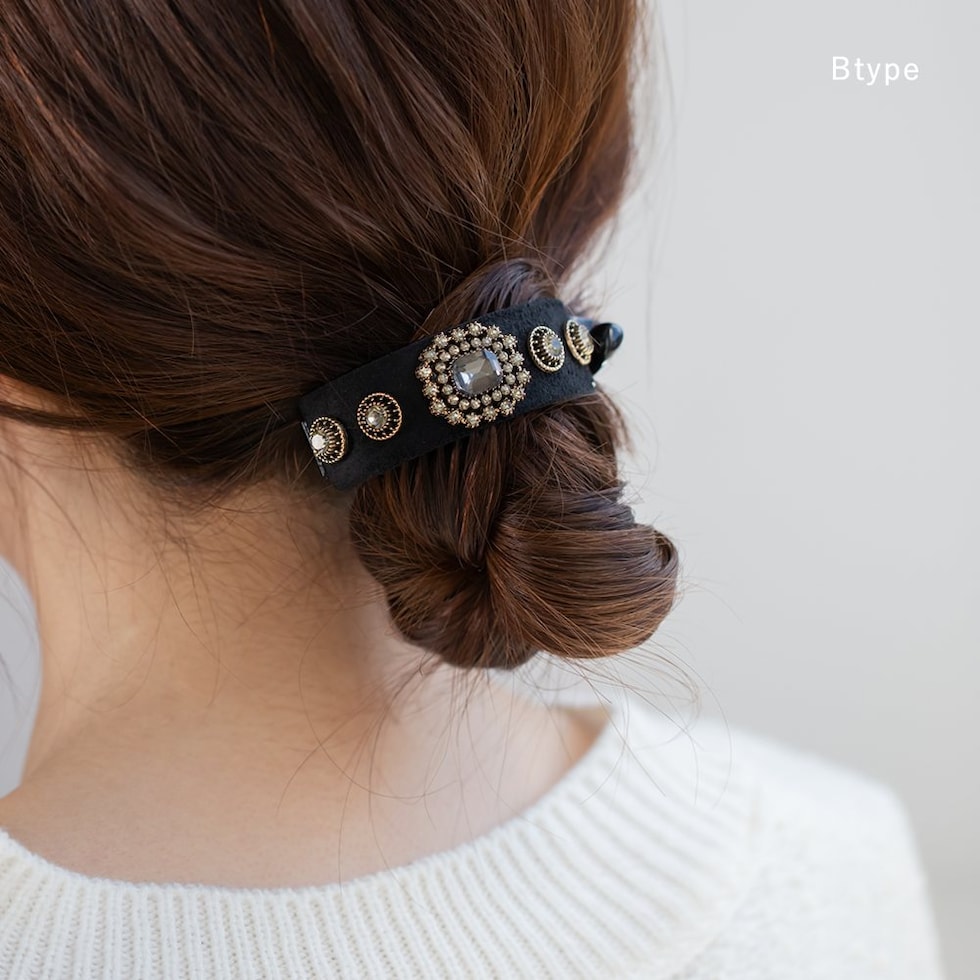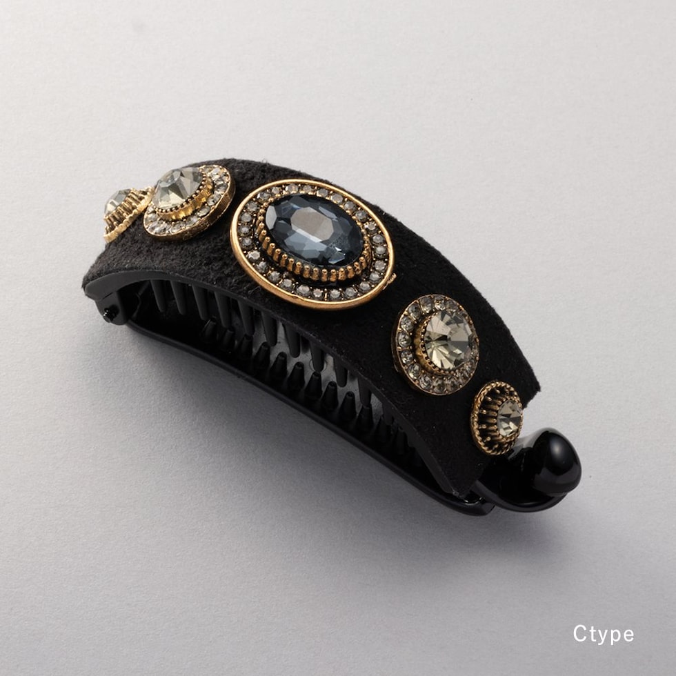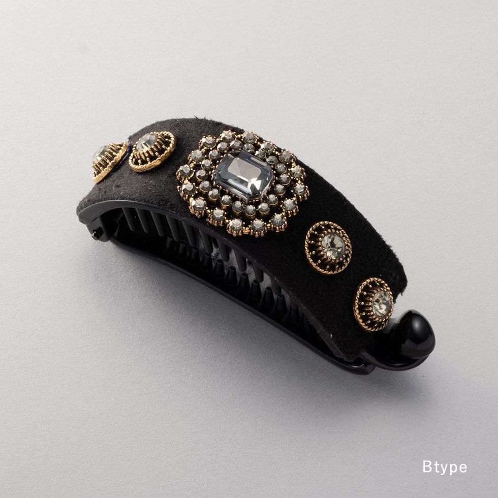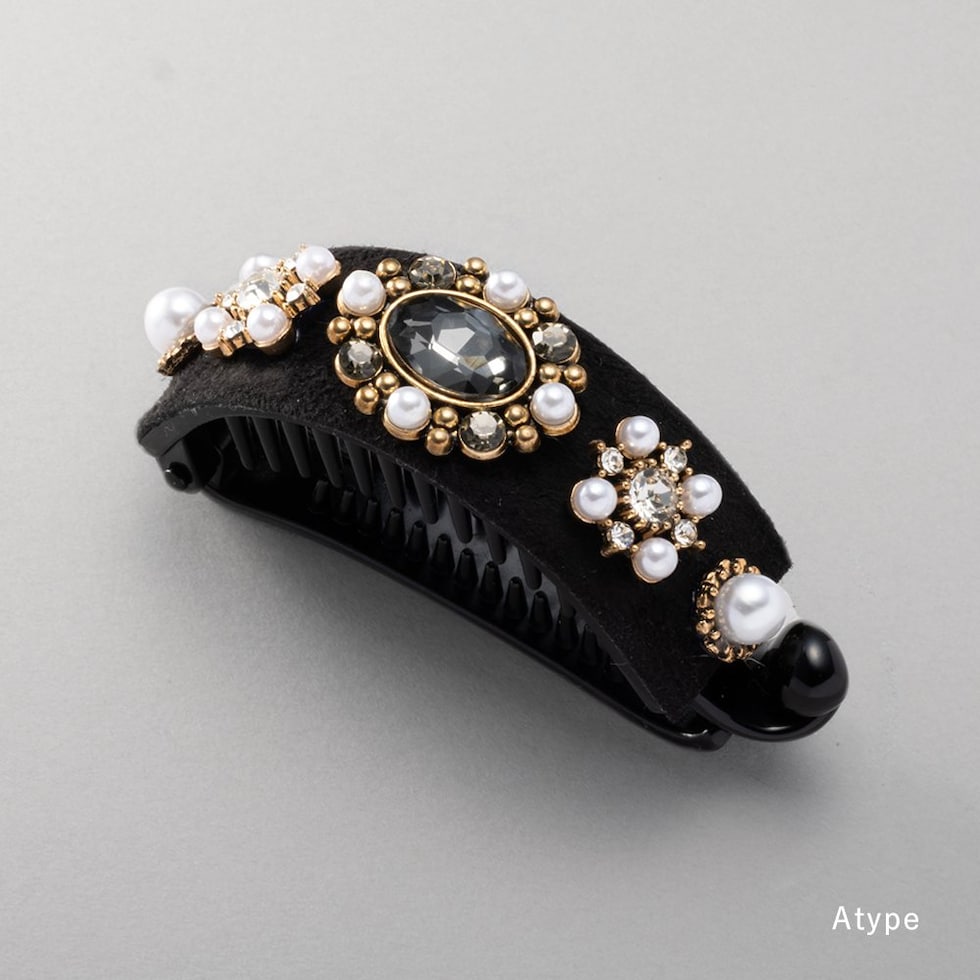 ビジューやパールを贅沢に飾ったデコラティブなヘアクリップ。スエード調生地をベースにすることで、華やかすぎずシックで大人な雰囲気に◎アーチ型でバネ付きタイプなので束ねた髪にさっと挟むだけの簡単装着が嬉しいポイント。デイリーからパーティーまで幅広く活躍するデザインです。