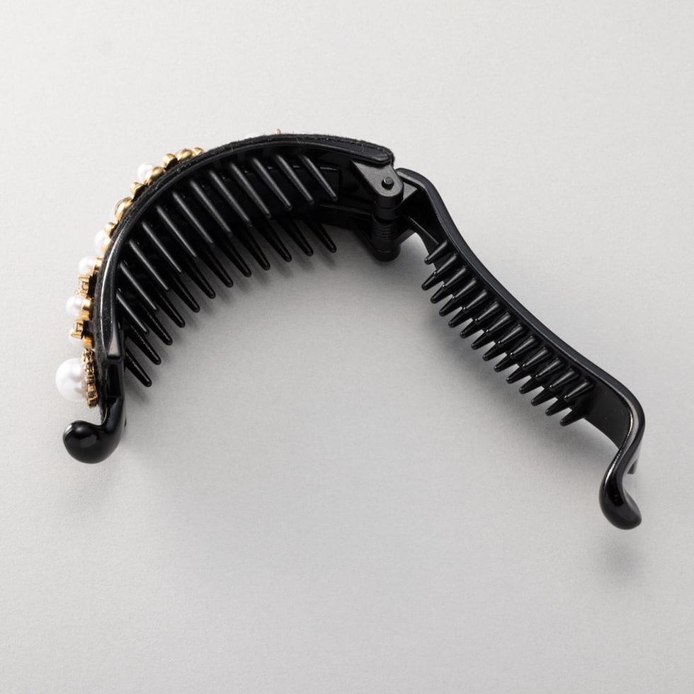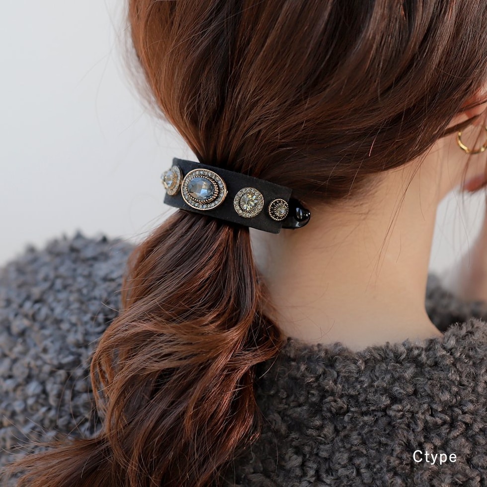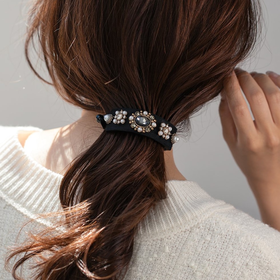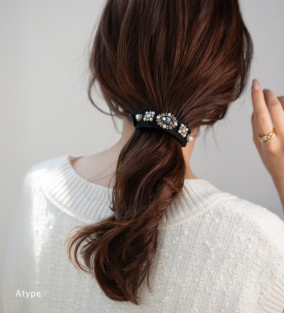 ビジューやパールを贅沢に飾ったデコラティブなヘアクリップ。スエード調生地をベースにすることで、華やかすぎずシックで大人な雰囲気に◎アーチ型でバネ付きタイプなので束ねた髪にさっと挟むだけの簡単装着が嬉しいポイント。デイリーからパーティーまで幅広く活躍するデザインです。