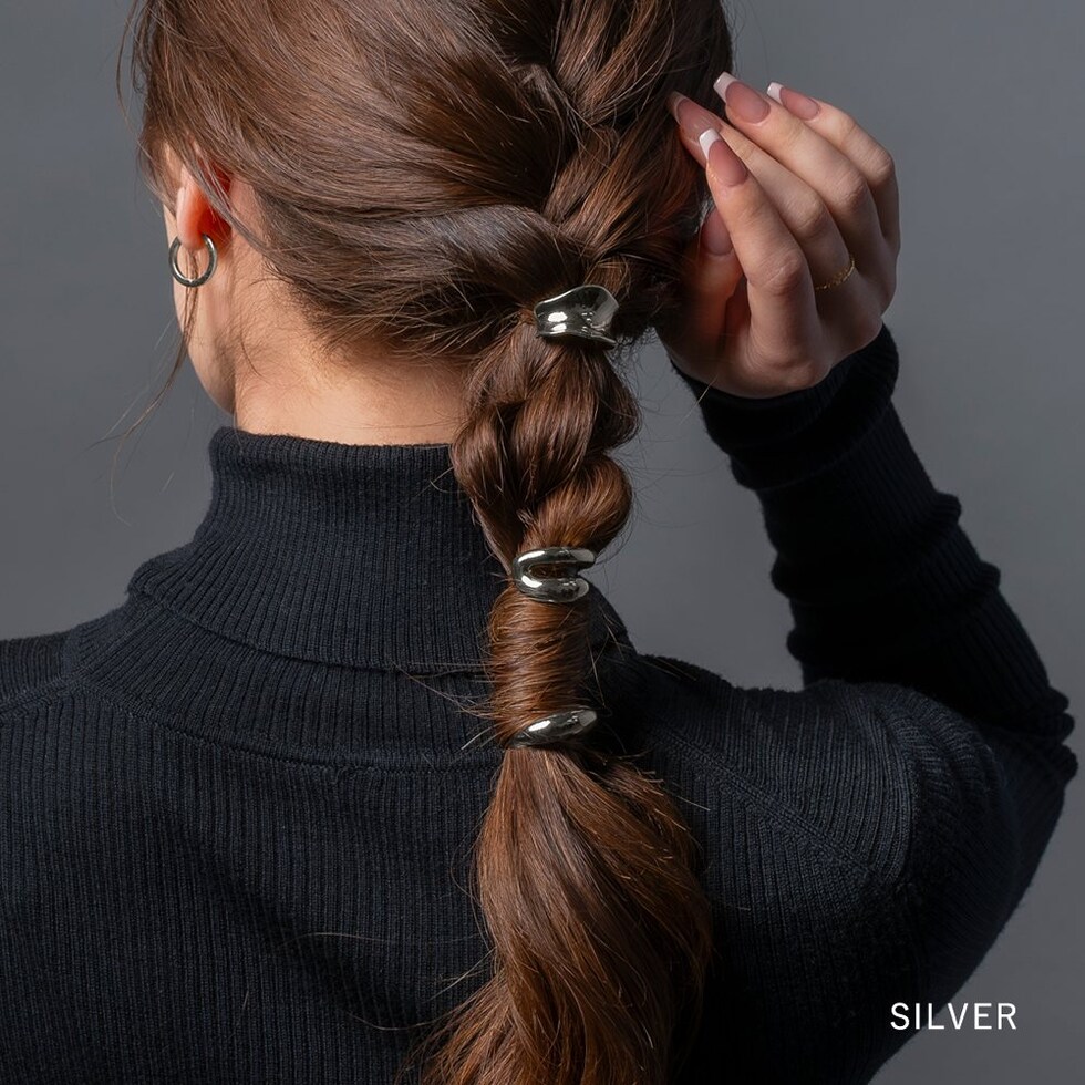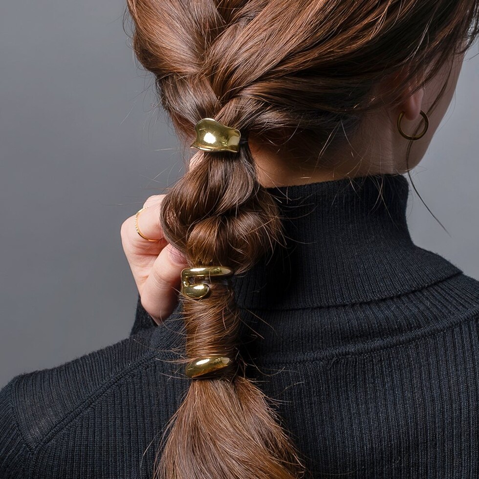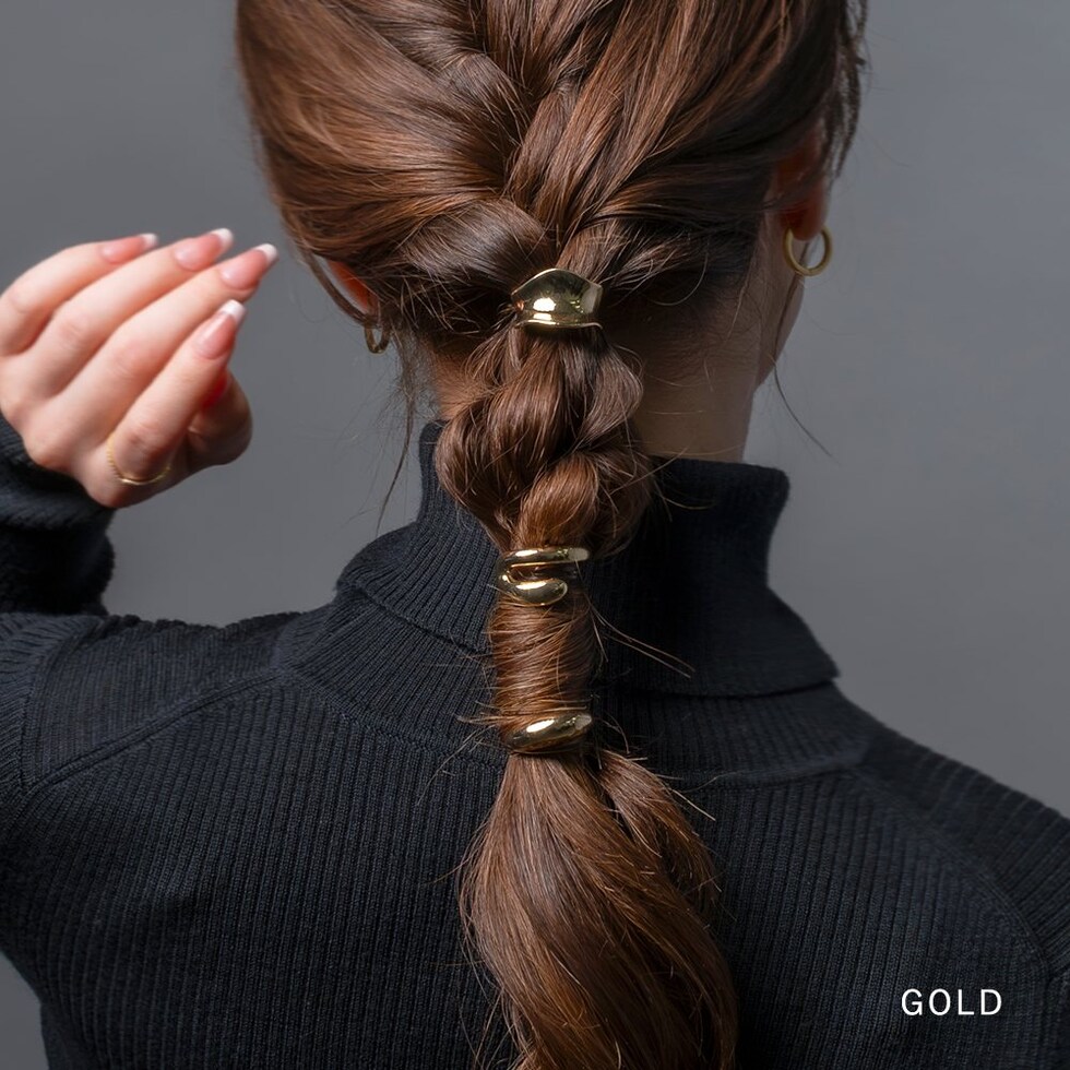 それぞれニュアンスのある3デザインがセットになったメタルポニーフック。編み下ろしや玉ねぎアレンジに飾るだけで旬のヘアが完成します。これひとつでぐっとコーデの幅が広がりそう◎