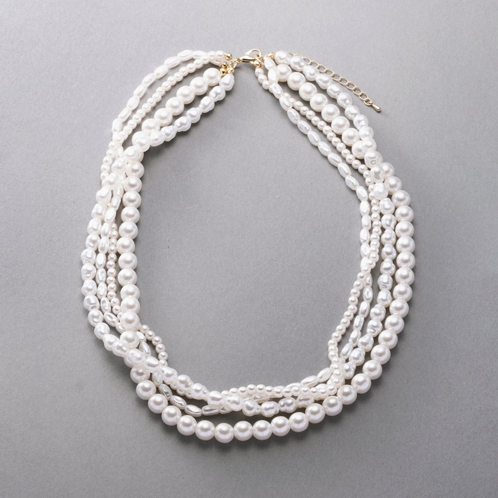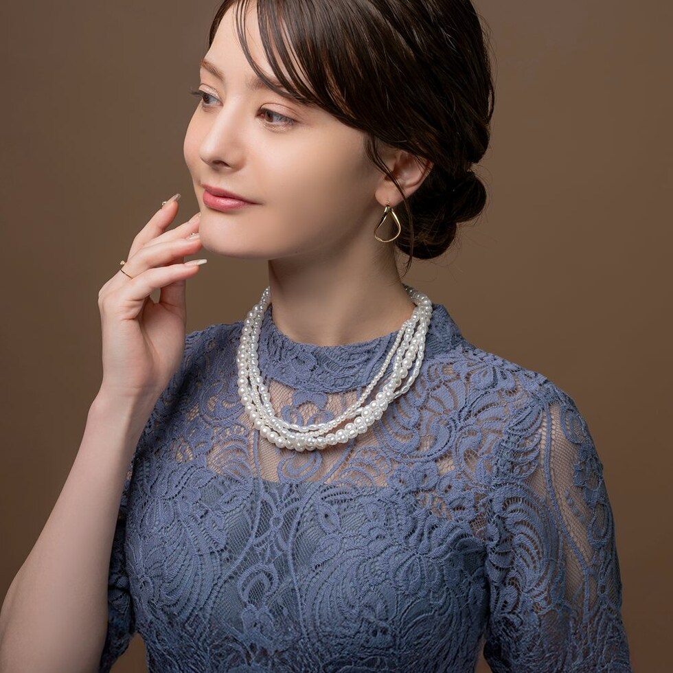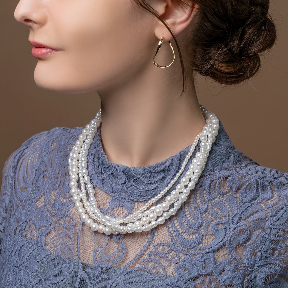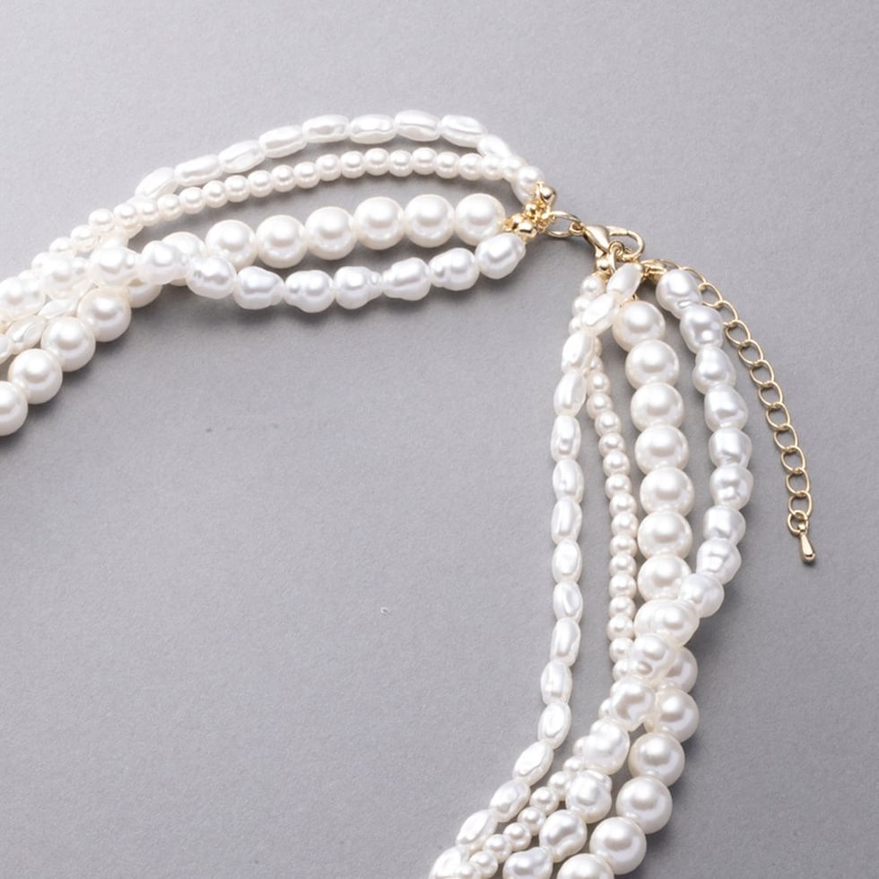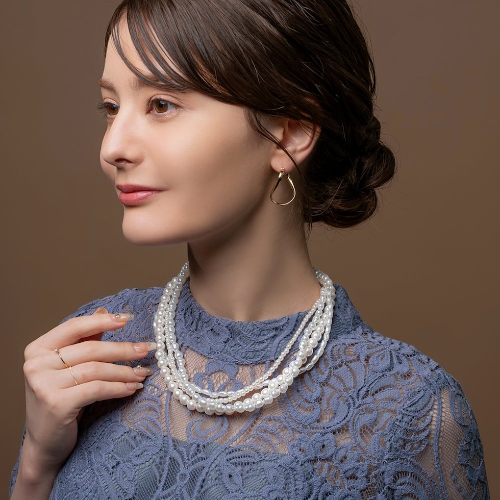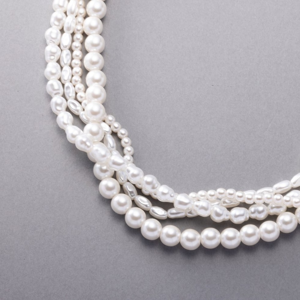 大きさや形の異なるパールをMIXした4連ネックレス。存在感を放つボリュームと品の良い艶めきが特別な日の装いにピッタリなひと品。華やかさを添えコーデを格上げしてくれるオススメのアイテムです。