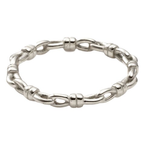 ノットデザインのステンレス製リング。オーバルチェーンをひとつひとつ結んだような個性的なフォルムのアイテム。手元に何か物足りないときにこれひとつプラスしてみて◎
