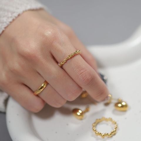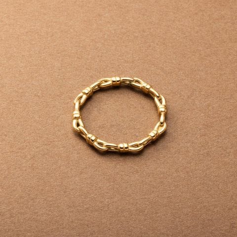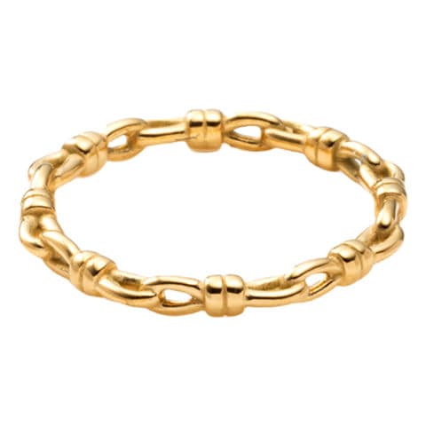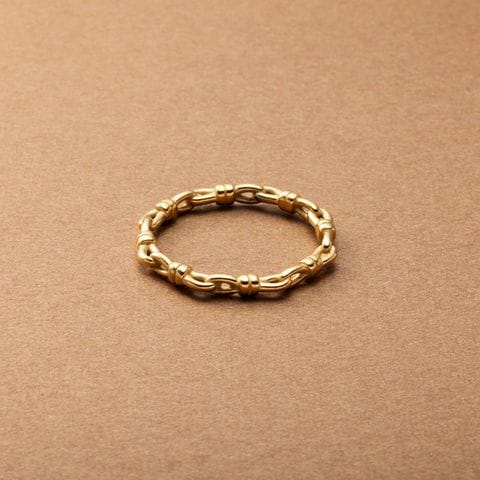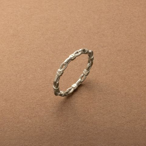 ノットデザインのステンレス製リング。オーバルチェーンをひとつひとつ結んだような個性的なフォルムのアイテム。手元に何か物足りないときにこれひとつプラスしてみて◎