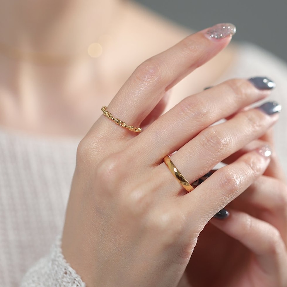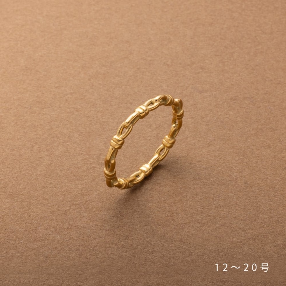 ノットデザインのステンレス製リング。オーバルチェーンをひとつひとつ結んだような個性的なフォルムのアイテム。手元に何か物足りないときにこれひとつプラスしてみて◎