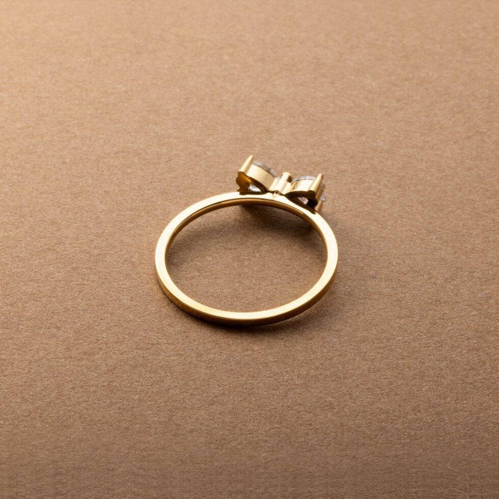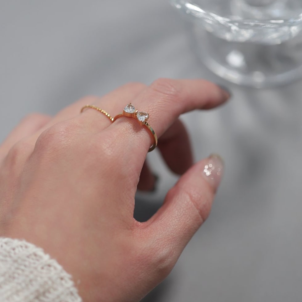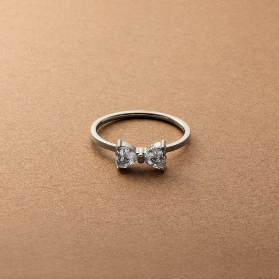 煌めくリボンのステンレス製リング。ハート型にカットした2粒のビジューをリボンモチーフにデザインした最高に可愛いレディアイテム。繊細に煌めくビジューとシンプルなリングが子供っぽくならずさりげなく気分を上げてくれそう◎