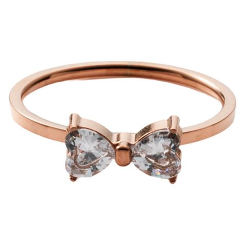 煌めくリボンのステンレス製リング。ハート型にカットした2粒のビジューをリボンモチーフにデザインした最高に可愛いレディアイテム。繊細に煌めくビジューとシンプルなリングが子供っぽくならずさりげなく気分を上げてくれそう◎