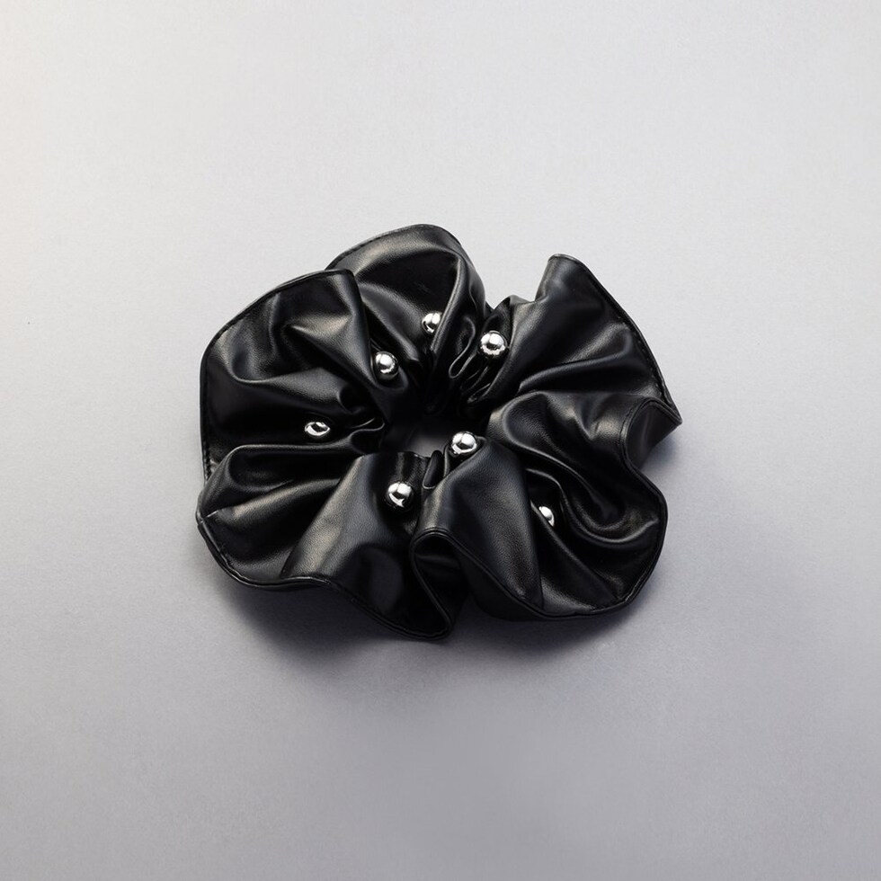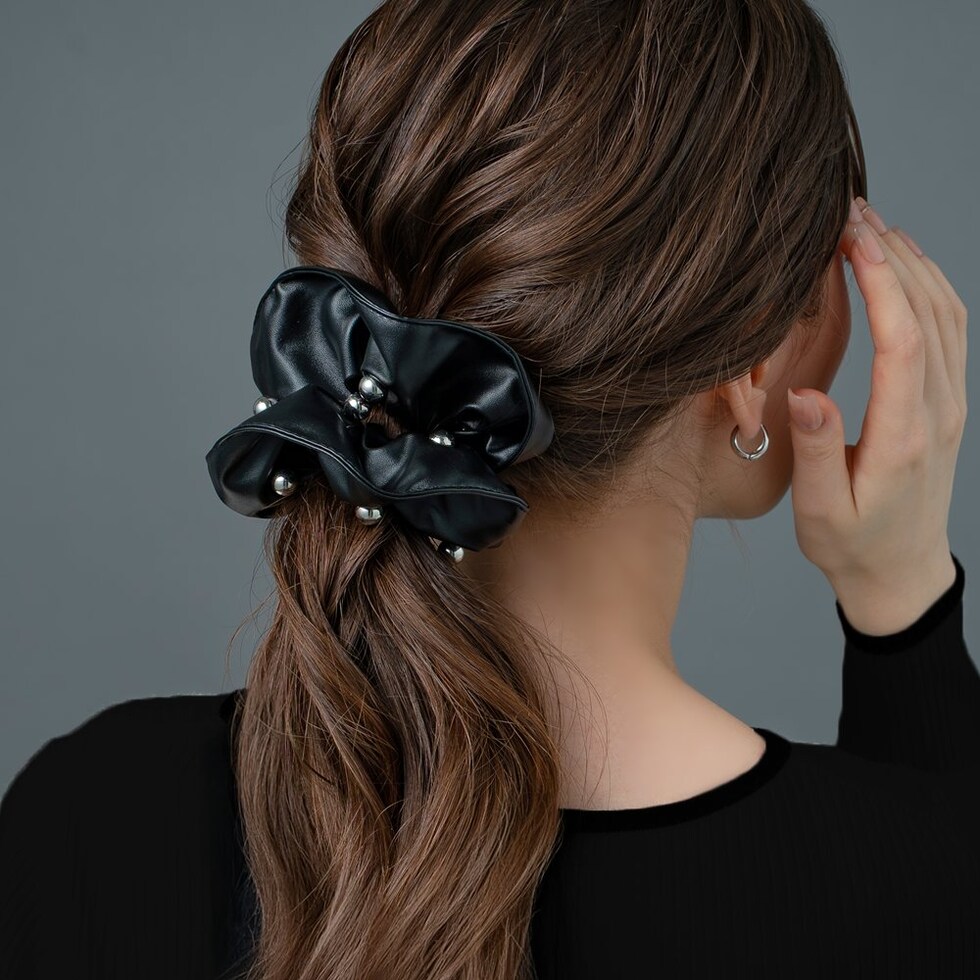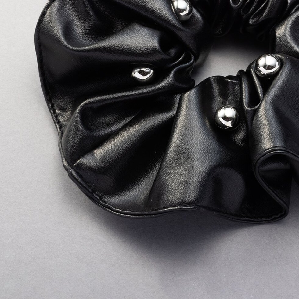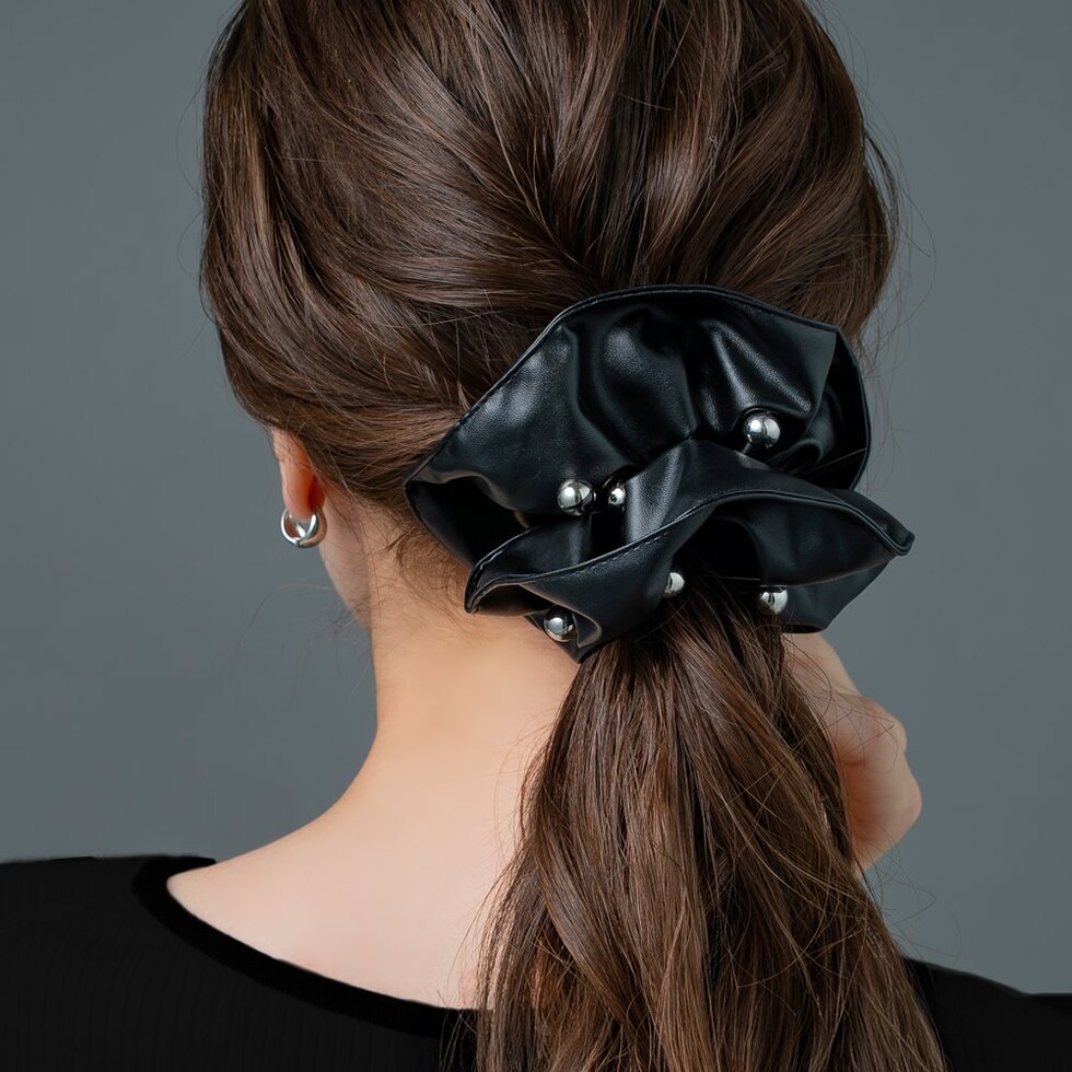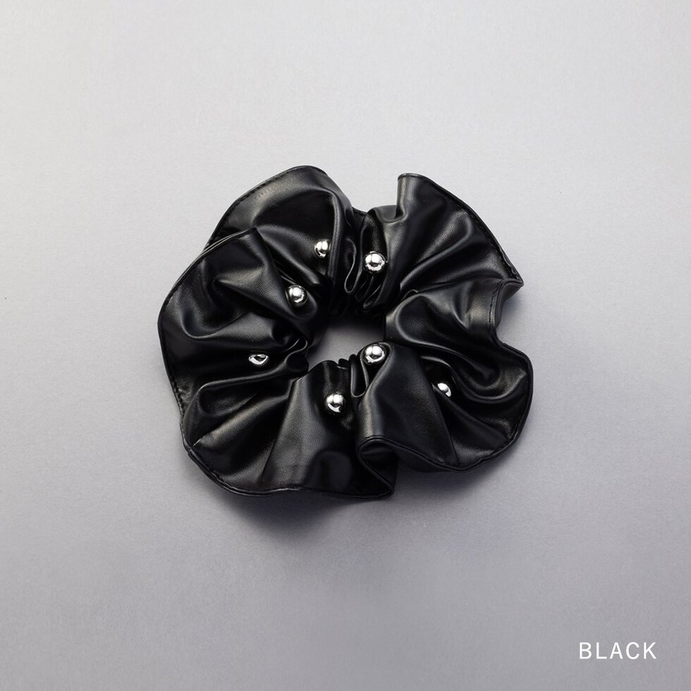レザー調の高見え生地にメタルボールをランダムに配したシュシュ。煌めくメタルボールと存在感あるボリュームが後ろ姿を格上げする大人顔アイテム◎簡単アレンジも今っぽく仕上がるオススメのひと品です。