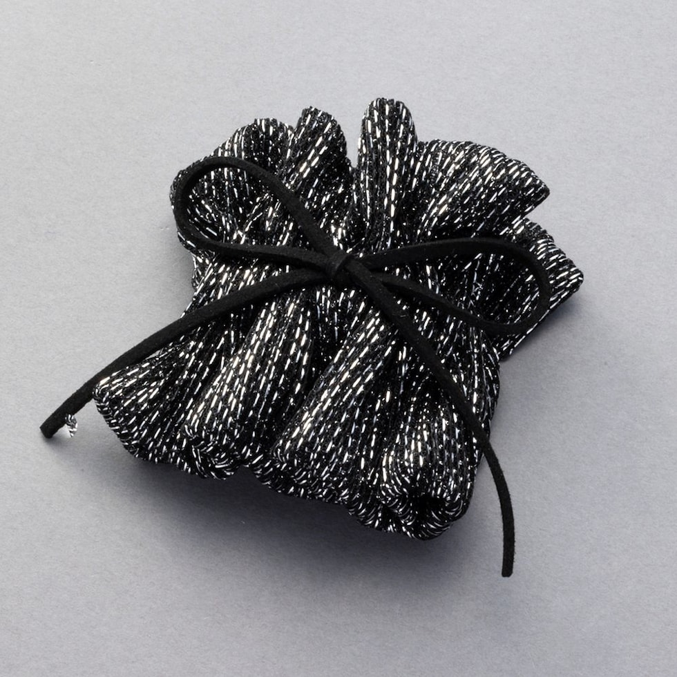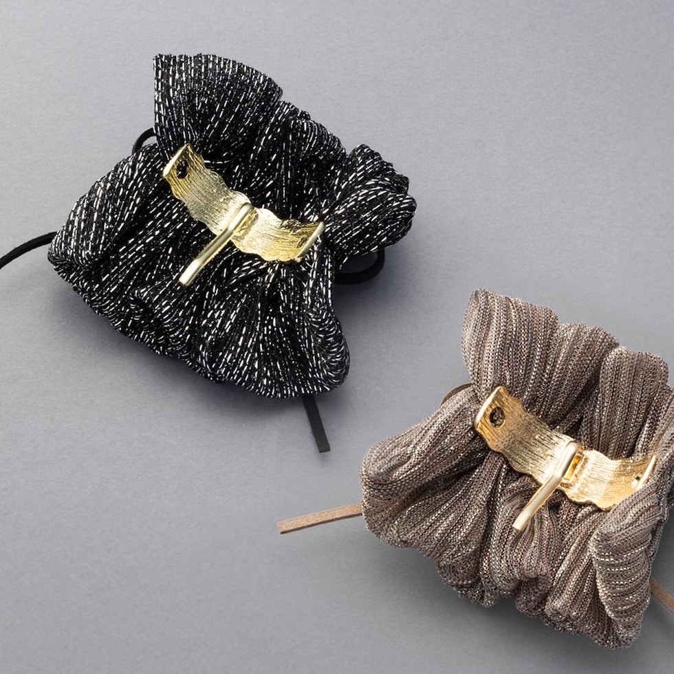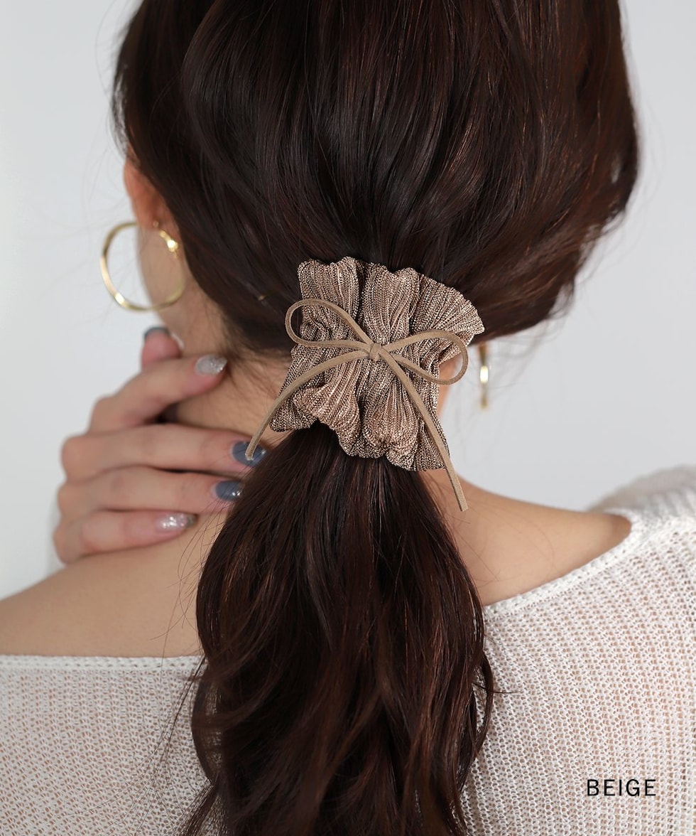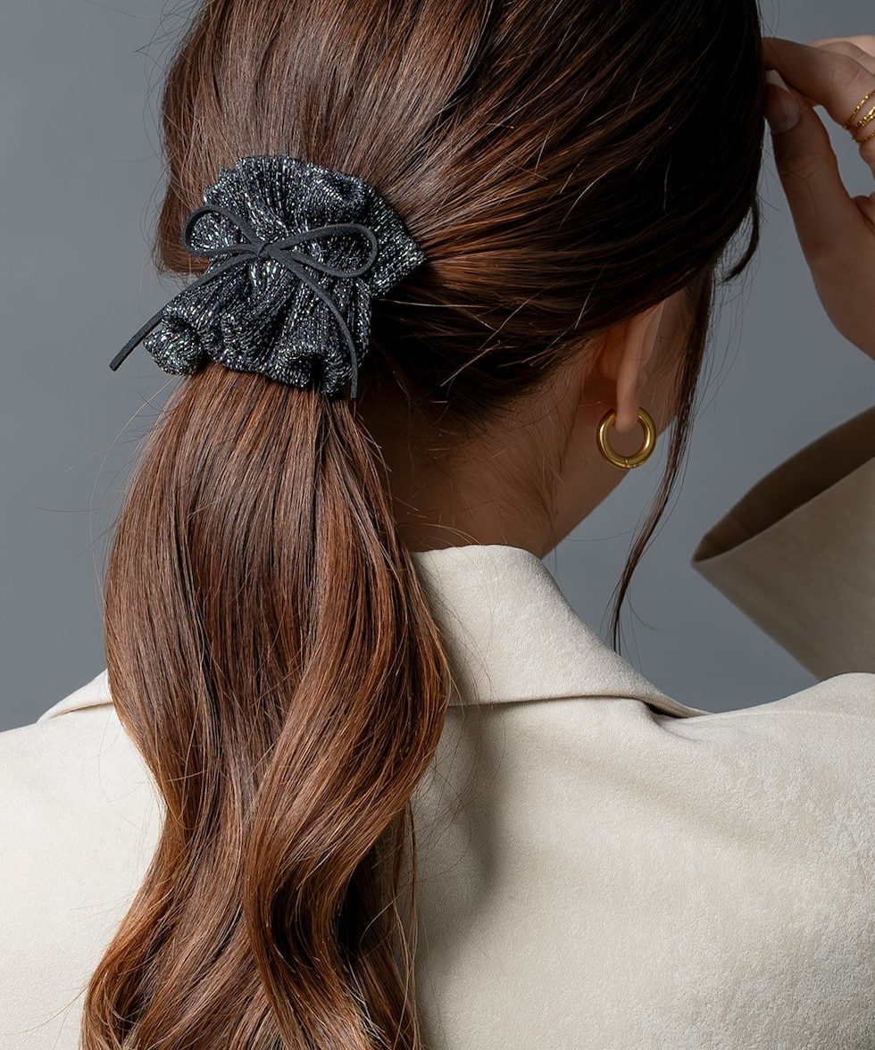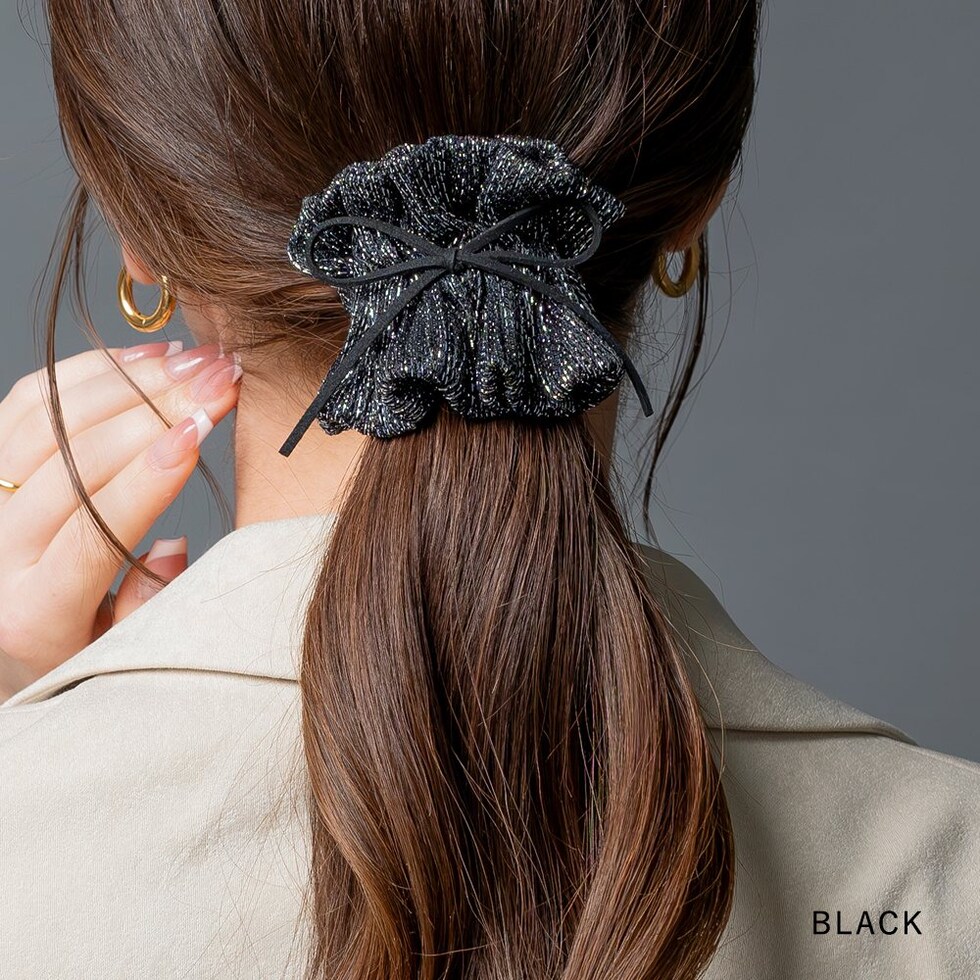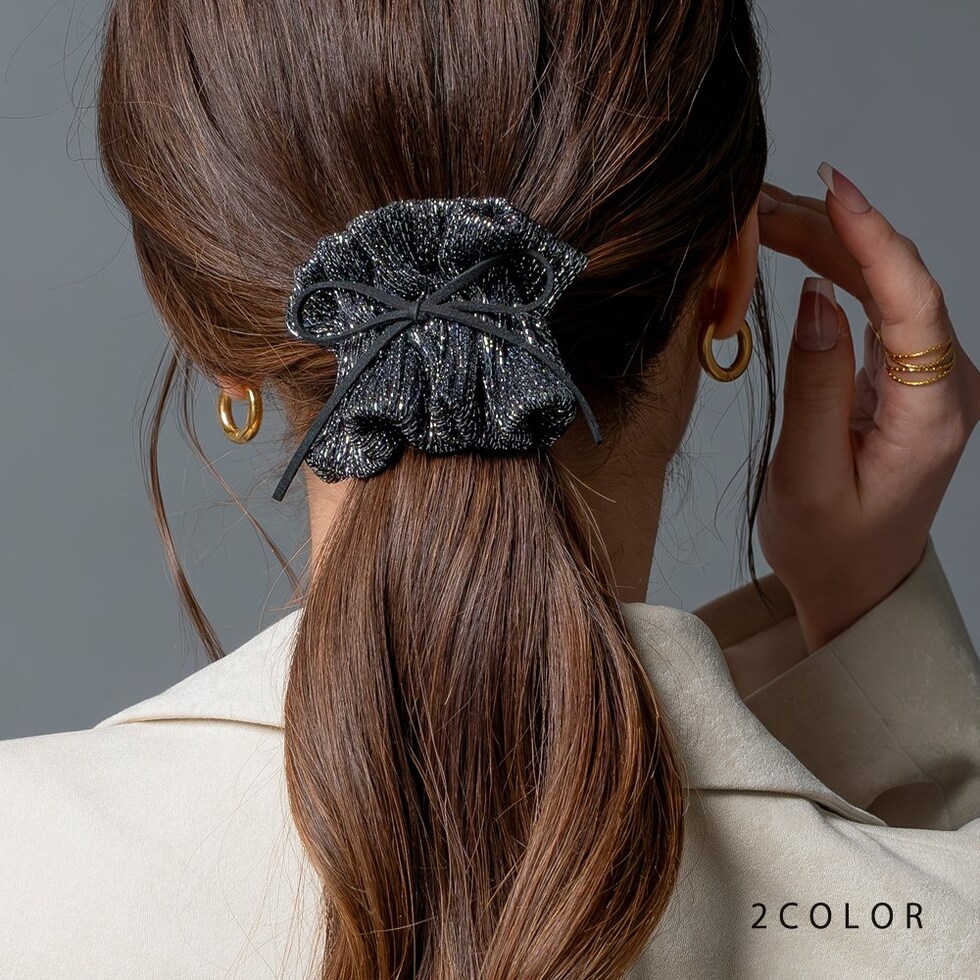 ラメ入りギャザーが大人可愛い、スエード調リボン付ポニーフック。程よく広がったラメ入りギャザーが上品で大人可愛いデザイン。髪の毛にサッと差し込むだけで簡単に華やかなヘアスタイルに仕上がります。