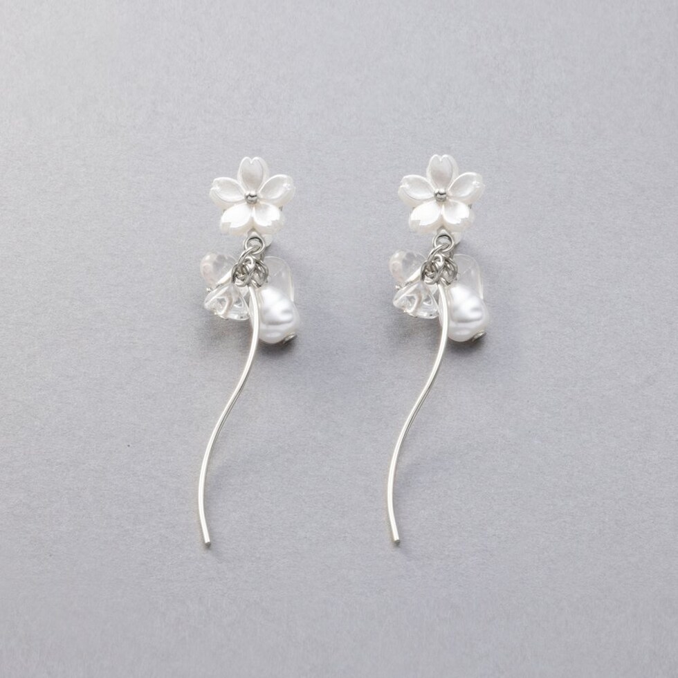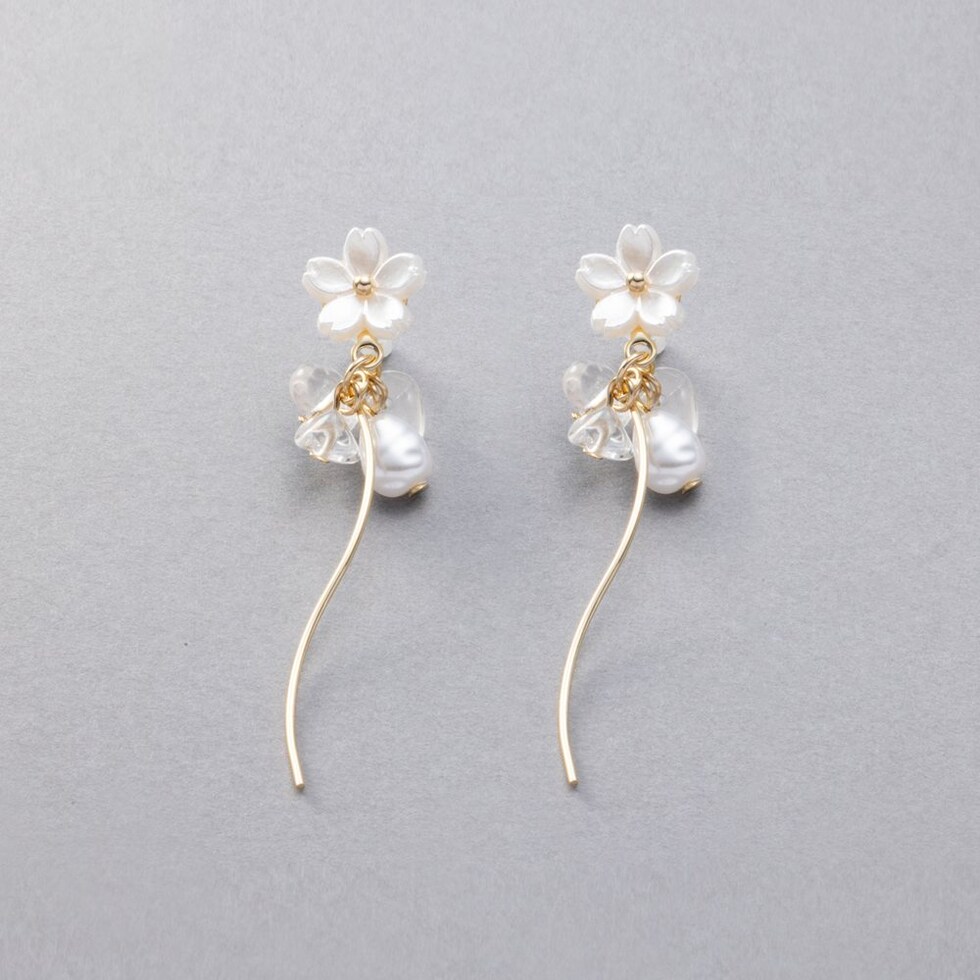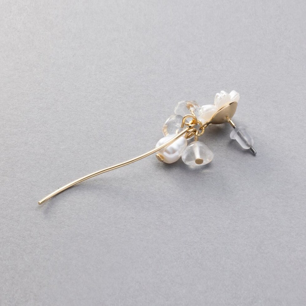 ホワイトフラワーと淡水パールモチーフやウェーブメタルを組み合わせたピアス。パールとクリアビーズやメタルラインが揺れるスイングデザインで気分上がりそう◎軽やかな揺れ感がお顔周りに華やかさと上品な印象をプラスしてくれます。低アレルギーのチタンポストを使用しているので、長時間の着用も安心です。