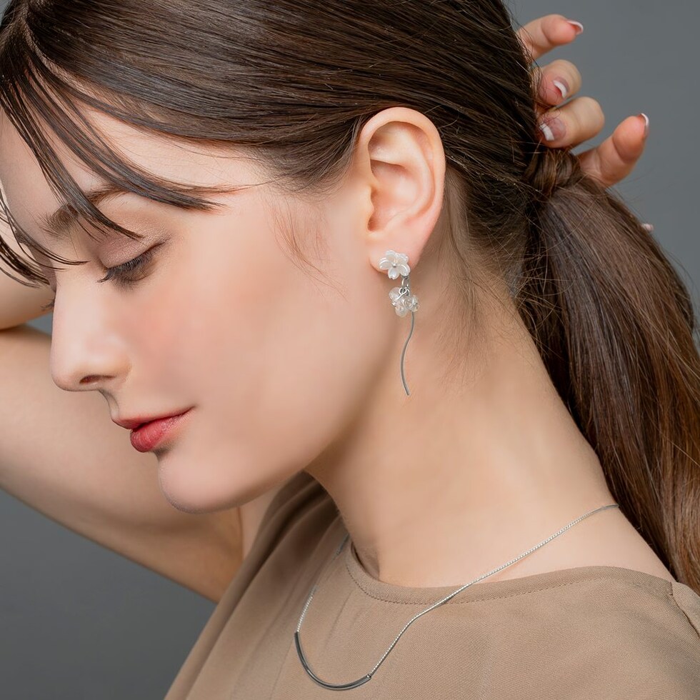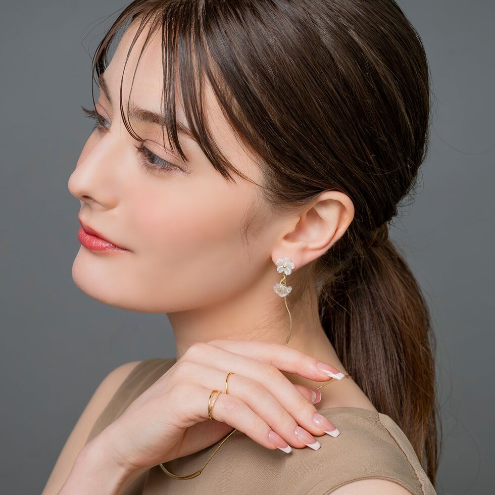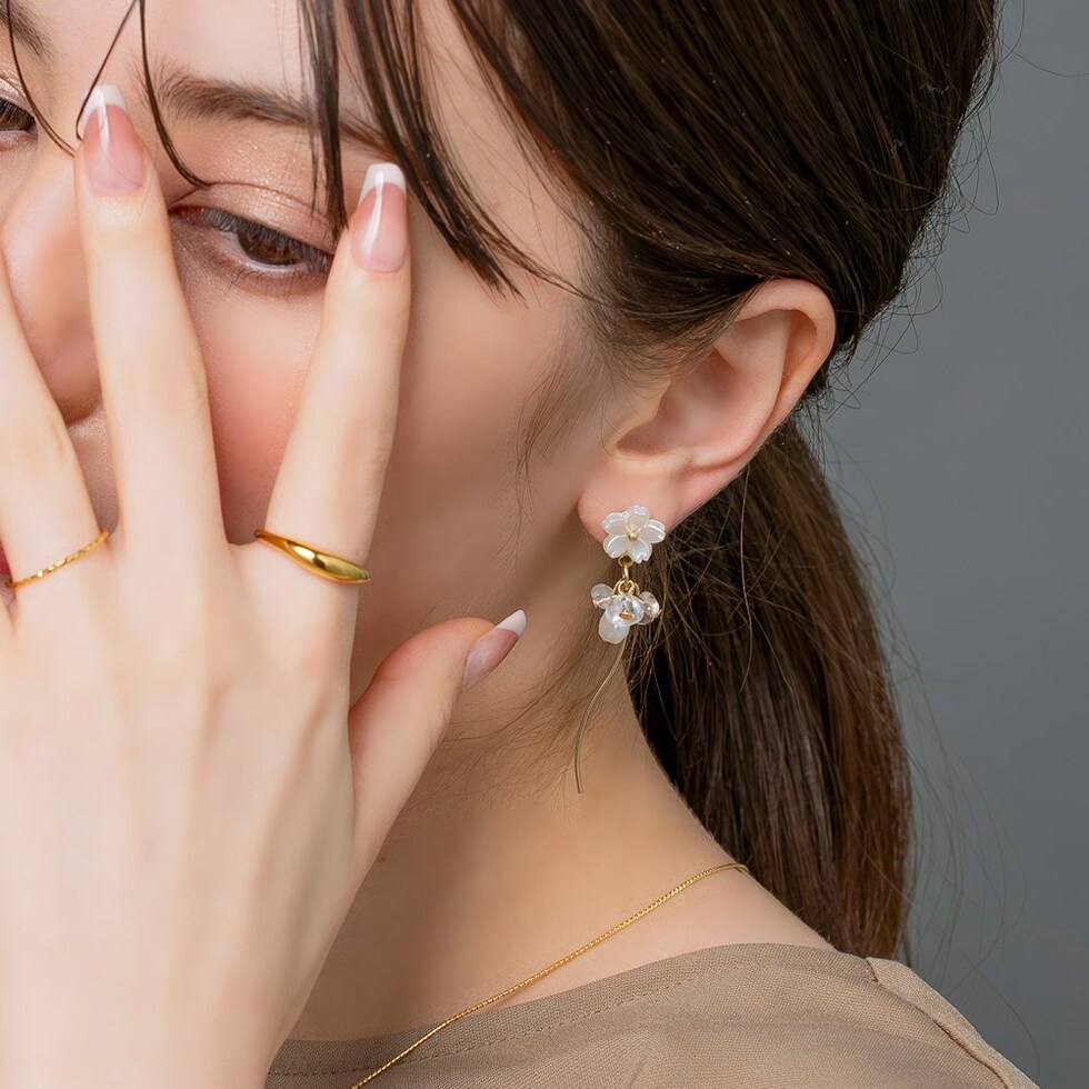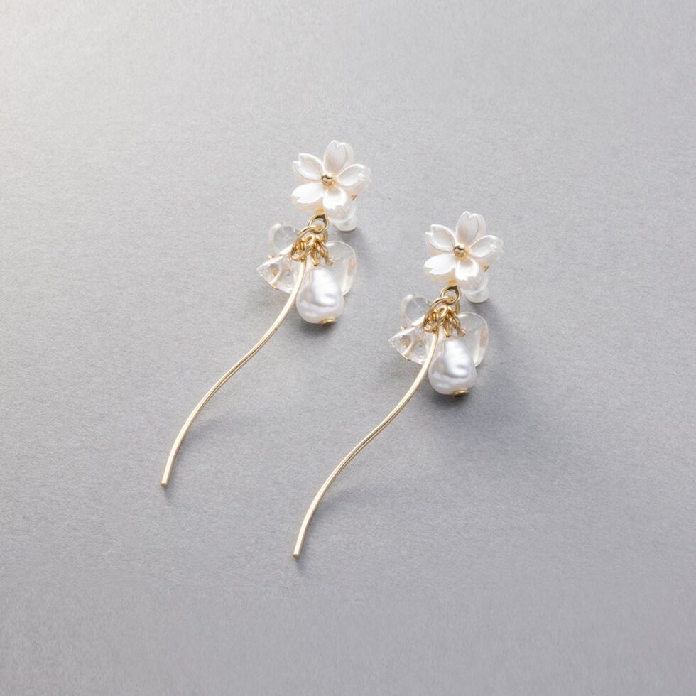 ホワイトフラワーと淡水パールモチーフやウェーブメタルを組み合わせたピアス。パールとクリアビーズやメタルラインが揺れるスイングデザインで気分上がりそう◎軽やかな揺れ感がお顔周りに華やかさと上品な印象をプラスしてくれます。低アレルギーのチタンポストを使用しているので、長時間の着用も安心です。