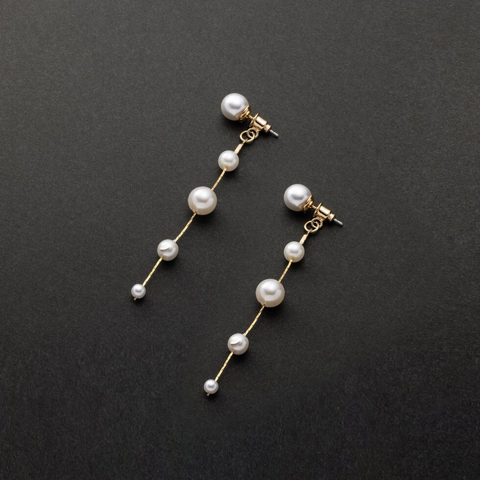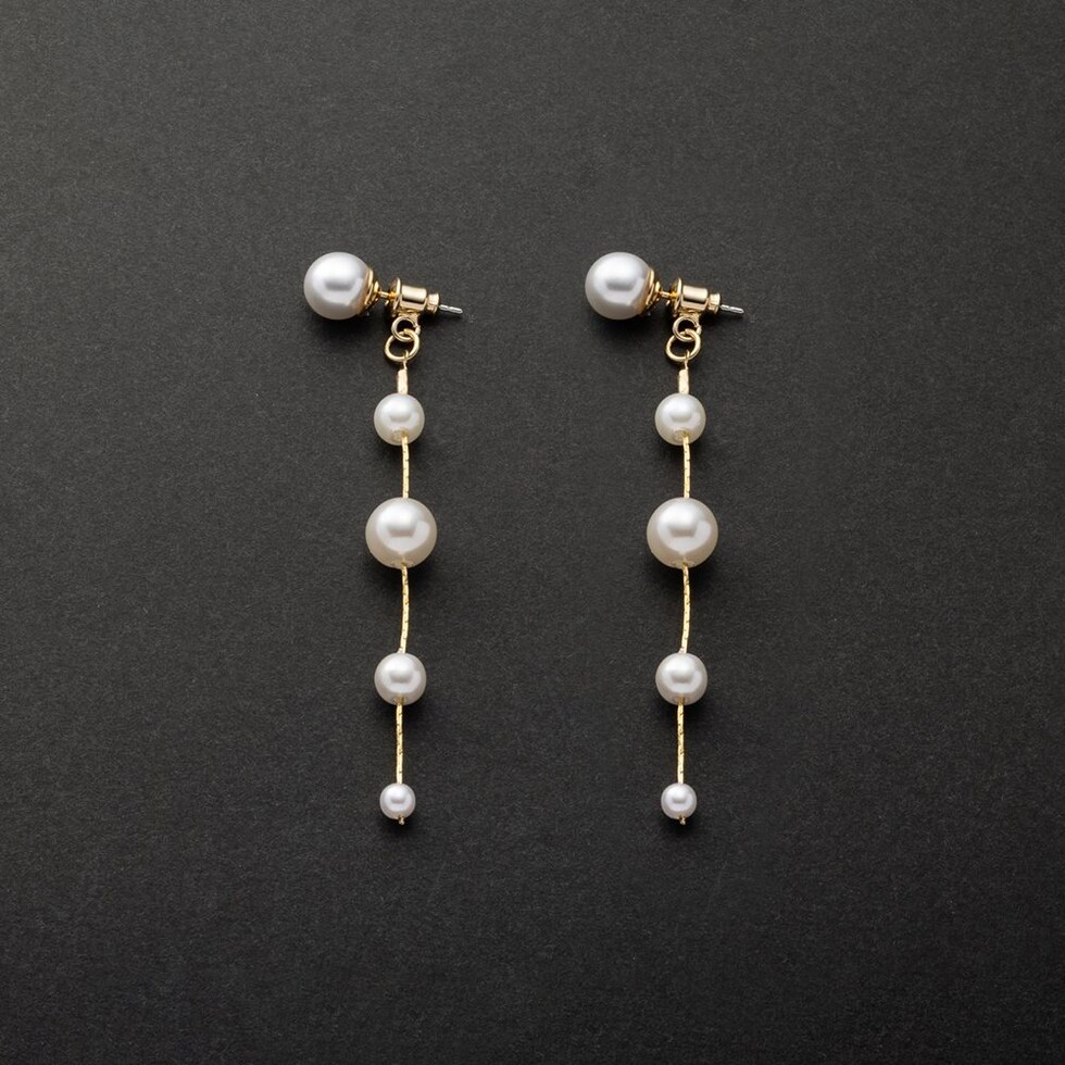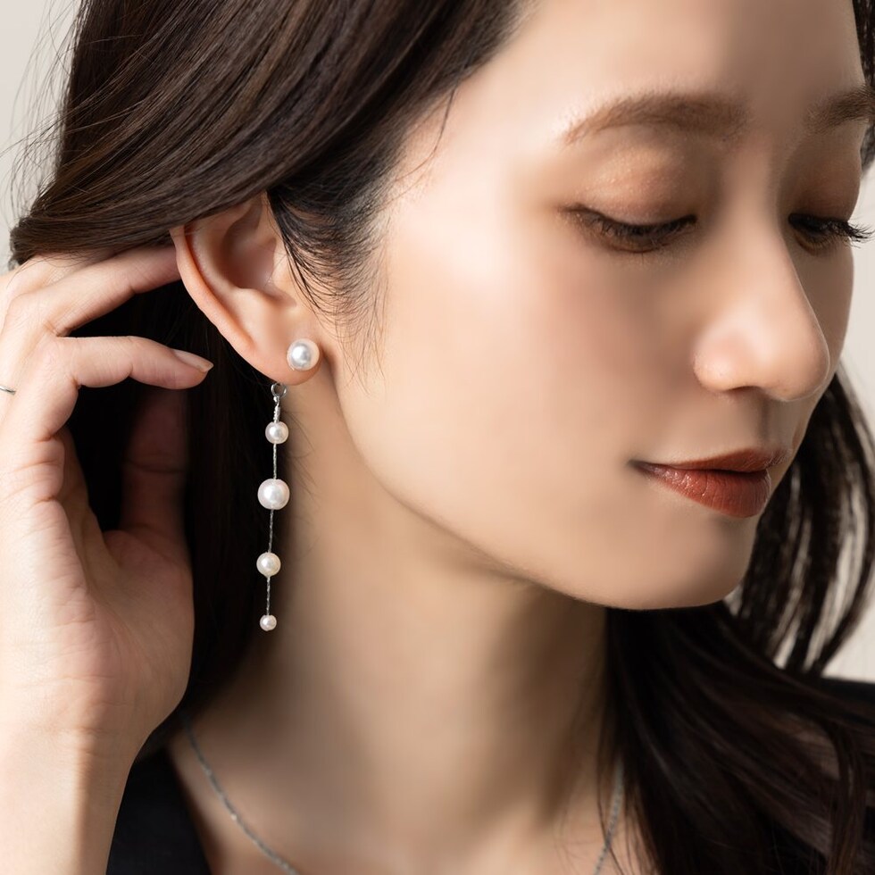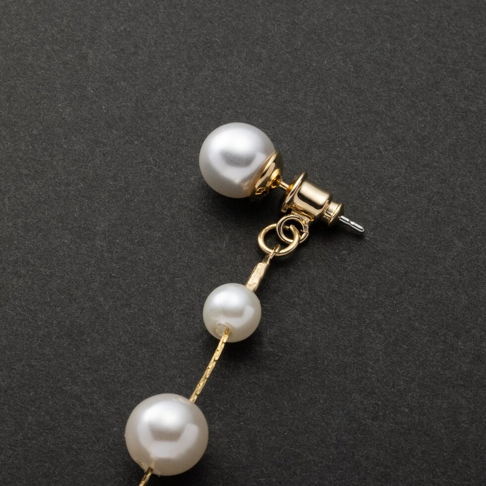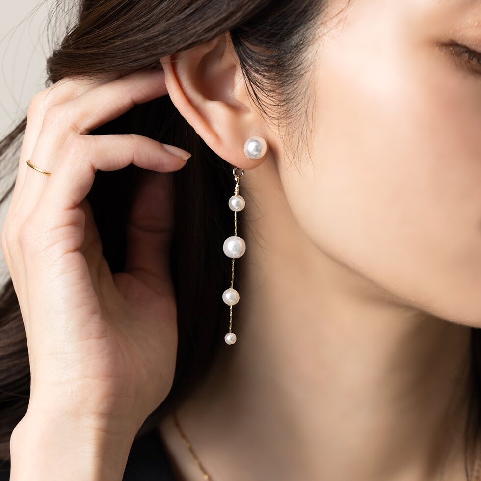 華奢なチェーンと大きさの異なる艶めくパールを組み合わせたバックキャッチピアス。耳裏でさりげなく揺れるデザインが、品よく身につけられるアイテム◎シンプルな一粒パールピアスとしてもお使いいただけます。低アレルギーのチタンポストを使用しているので、長時間の着用も安心です。
