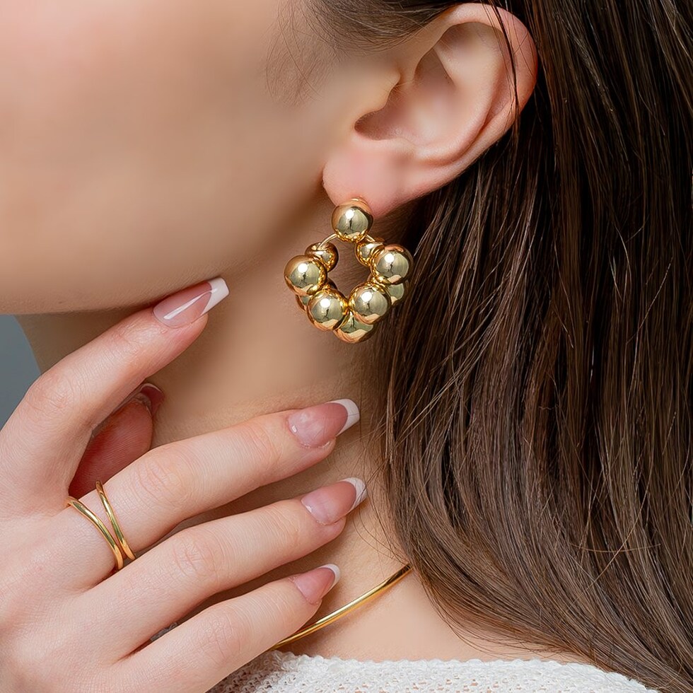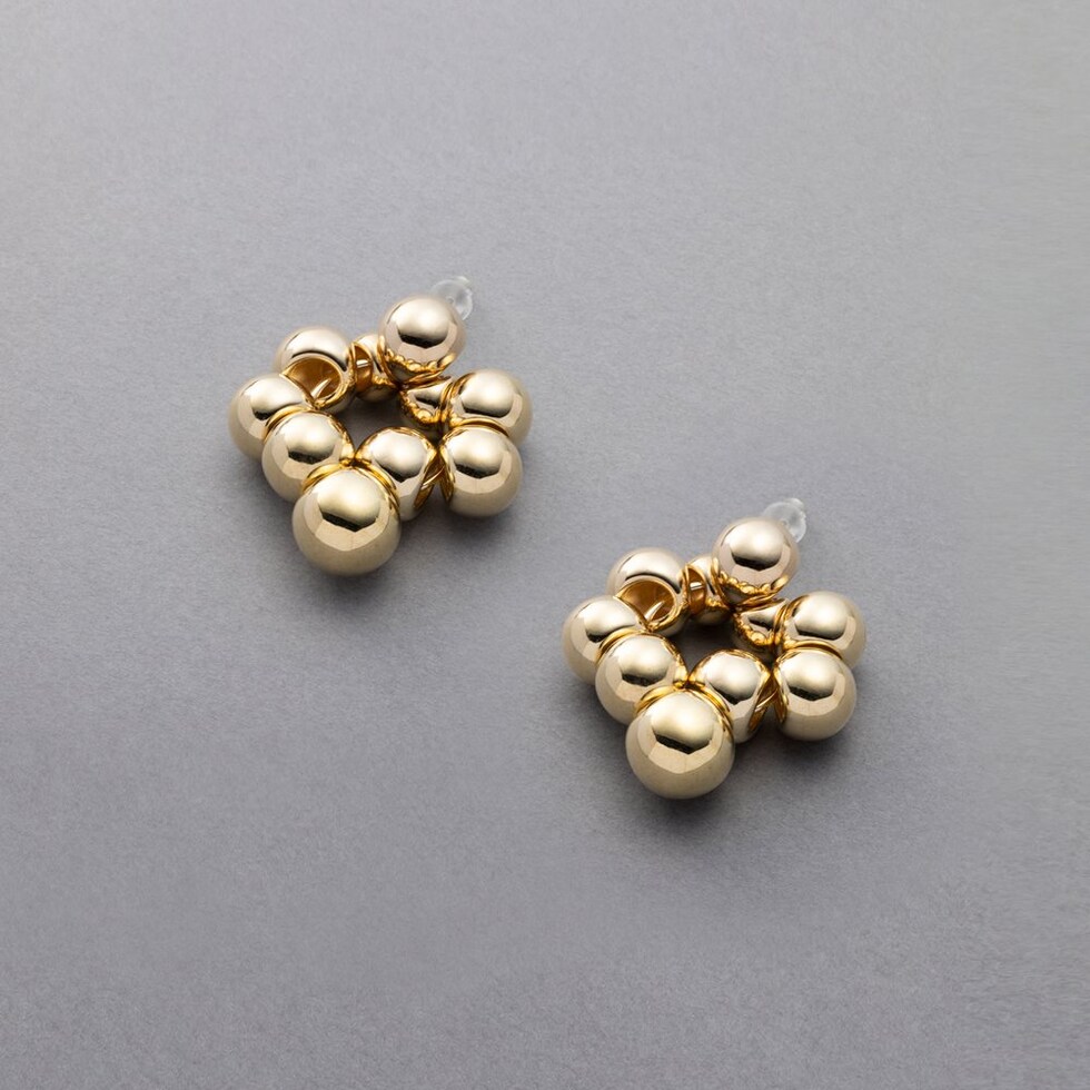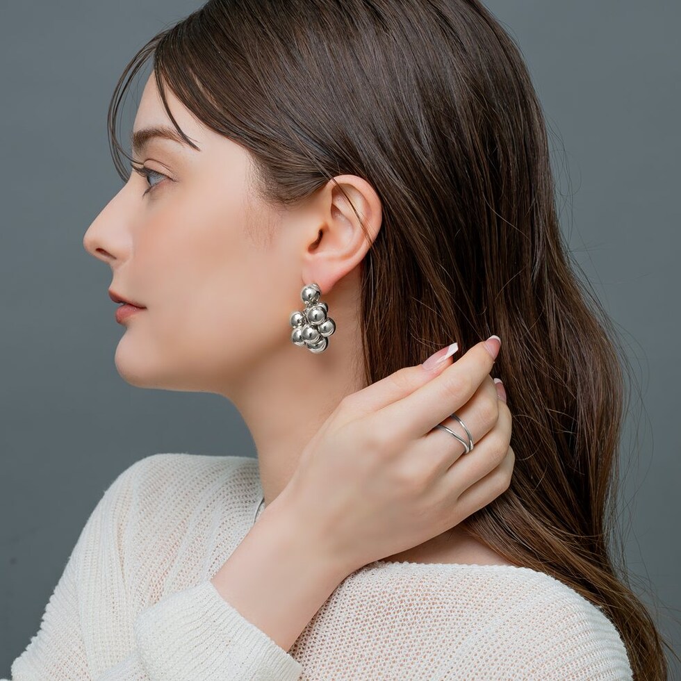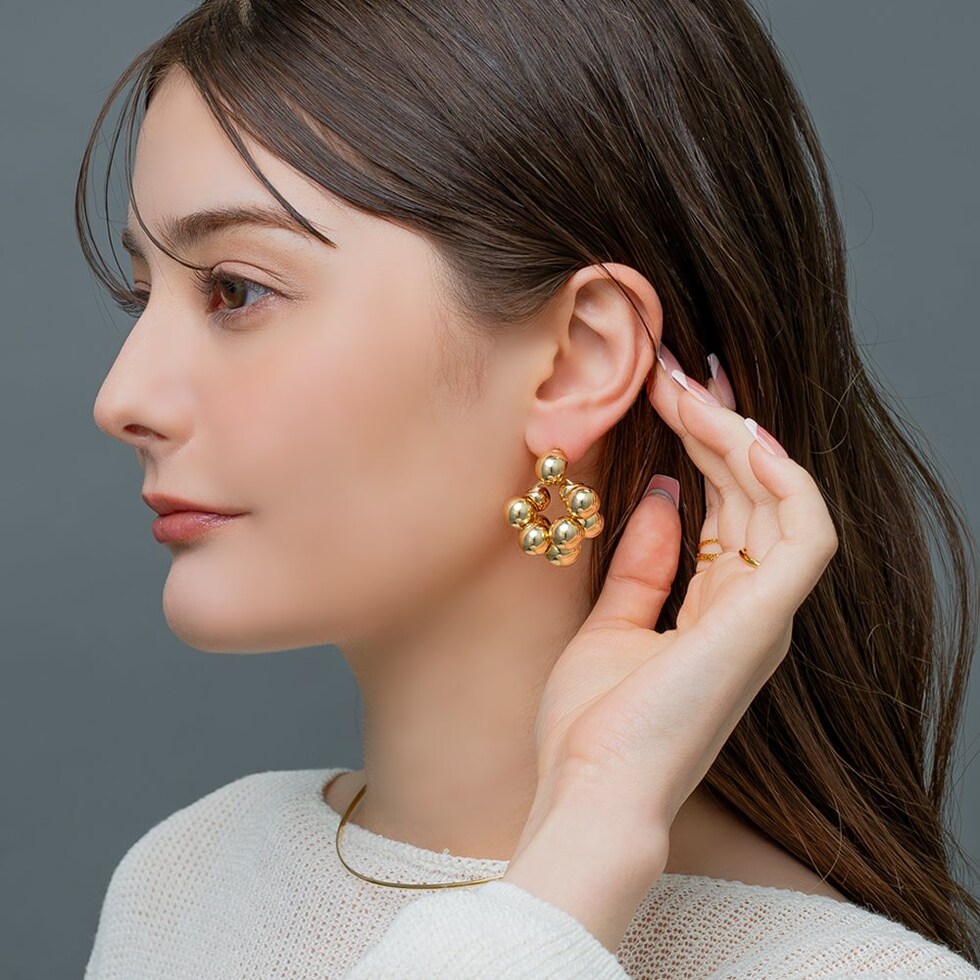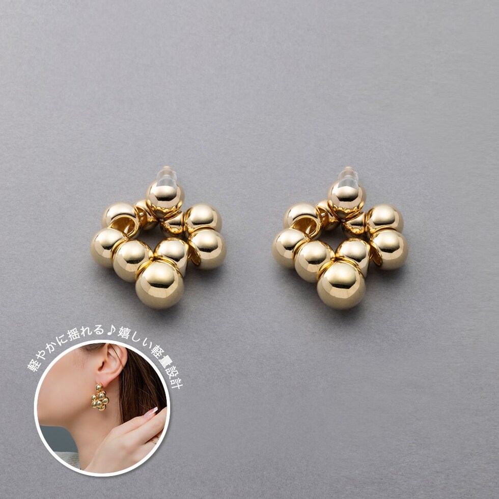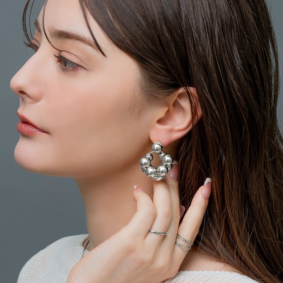 動くたびにメタルボールが揺らめきながら煌めく、バブルモチーフピアス。洗練されたシルエットと大きめのサイジングが、コーデのワンポイントにぴったり◎見た目より軽い軽量設計も嬉しいポイントです。低アレルギーのチタンポストを使用しているので、長時間の着用も安心です。