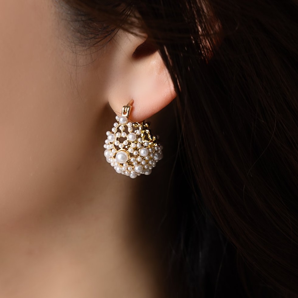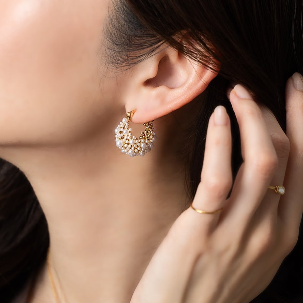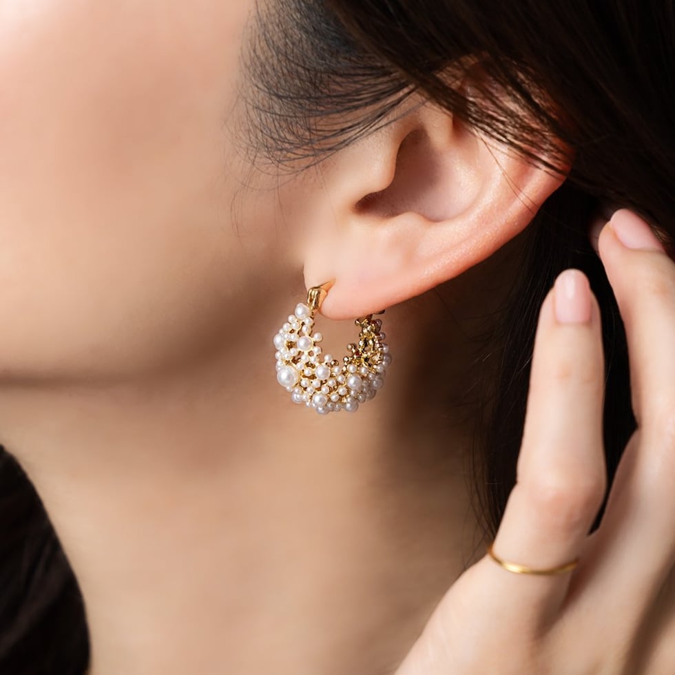 小粒パールをふんだんに使用した透かしパヴェのキャッチレスフープピアス。優美で品のある煌めきが、華やかな印象に仕上げてくれます。セレモニーからデイリーコーデのクラスアップアイテムにオススメ◎