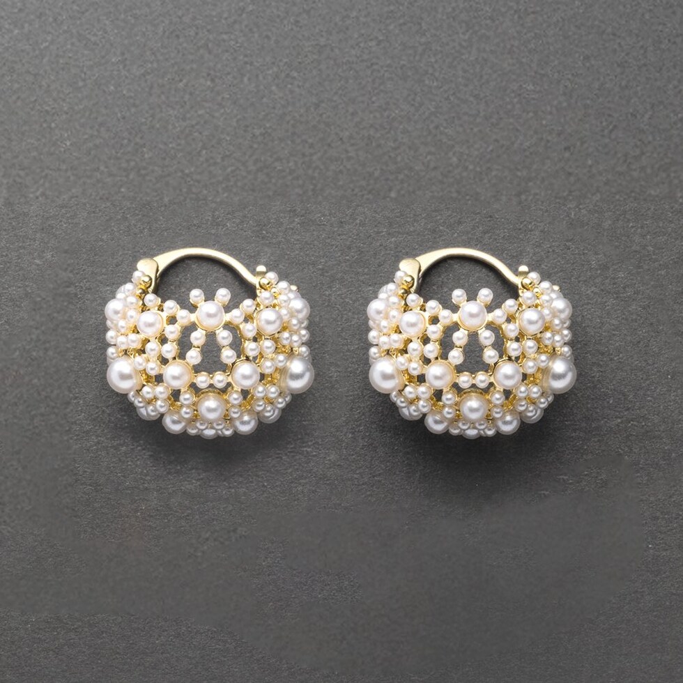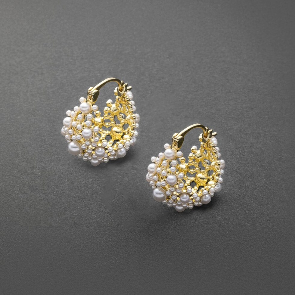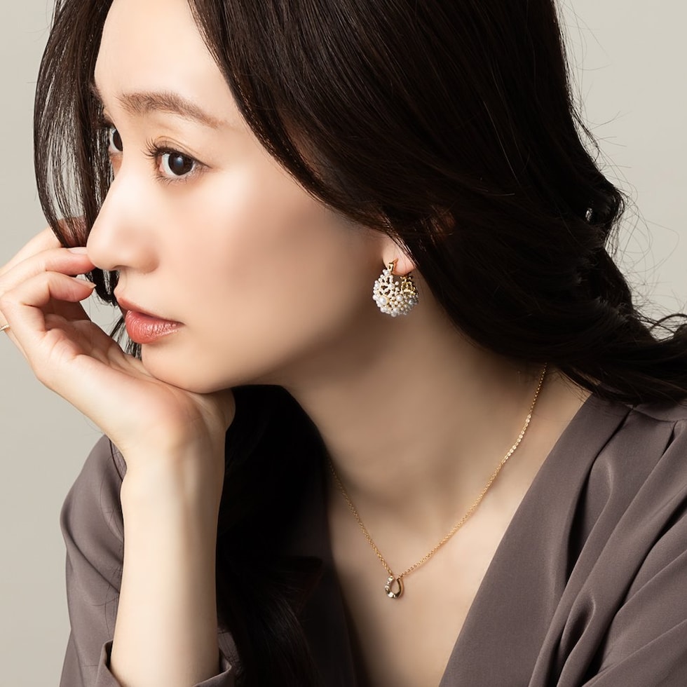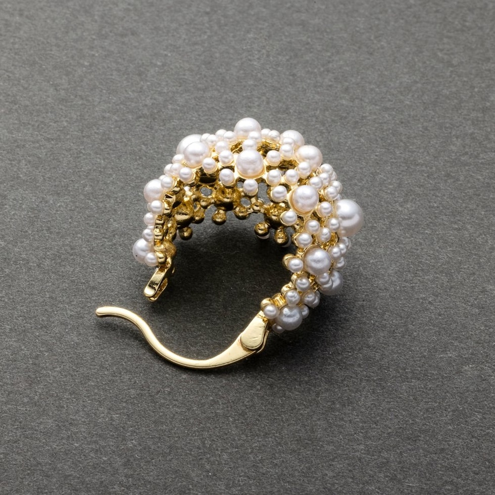 小粒パールをふんだんに使用した透かしパヴェのキャッチレスフープピアス。優美で品のある煌めきが、華やかな印象に仕上げてくれます。セレモニーからデイリーコーデのクラスアップアイテムにオススメ◎