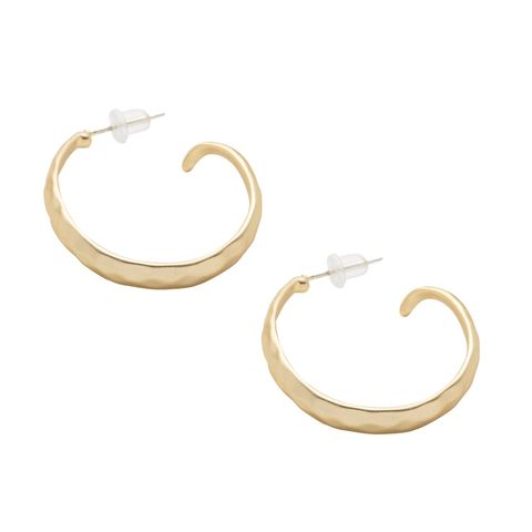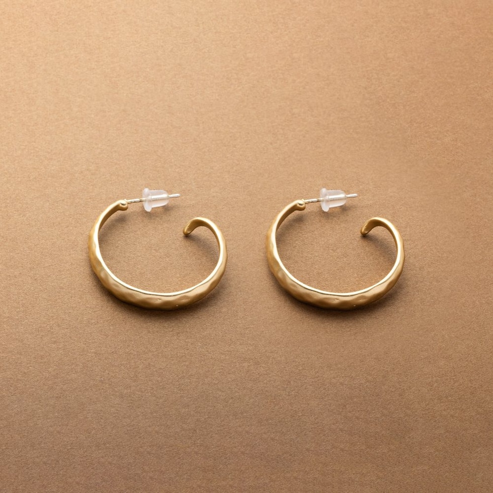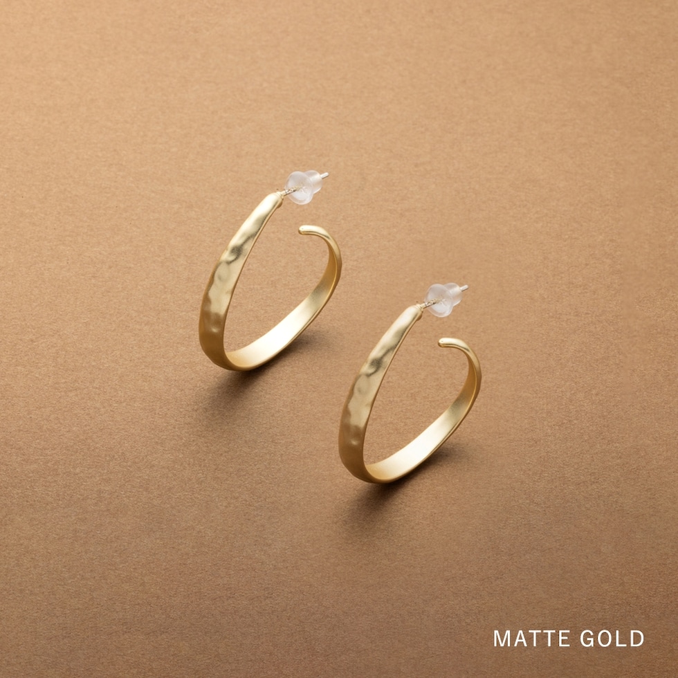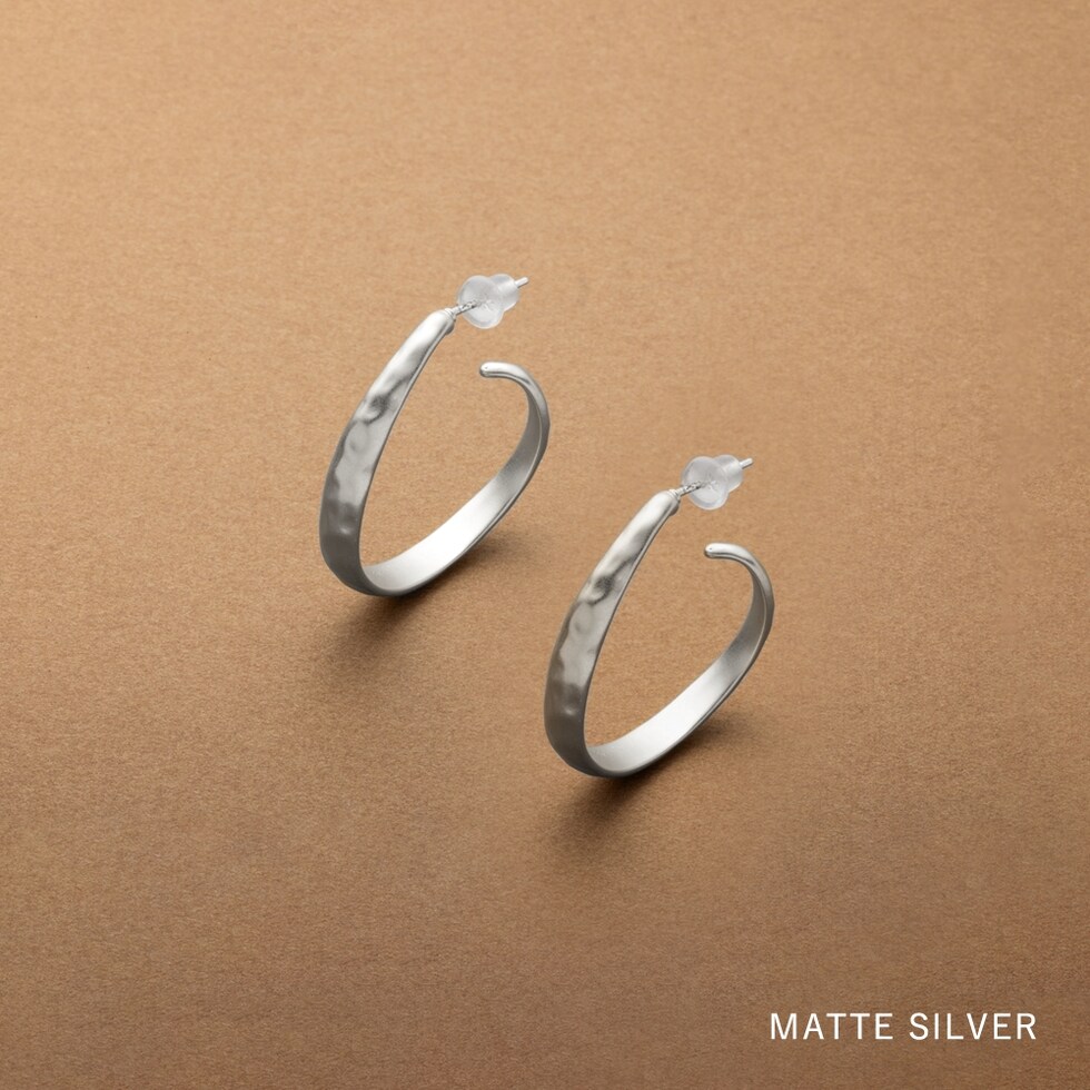 表面にたたき加工を施したマットな質感のフープピアス。緩やかに幅の変わるシェイプラインが女性らしい印象で、さりげなくお顔周りを華やかに演出します。シンプルなフォルムだからいつものコーデにプラスしやすいアイテム◎低アレルギーのシルバー925ポストを使用しているので、長時間の着用も安心です。
