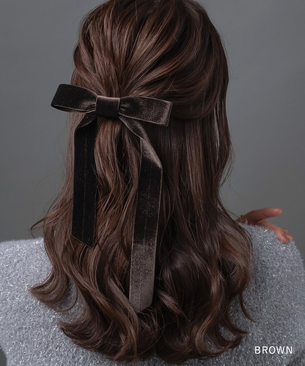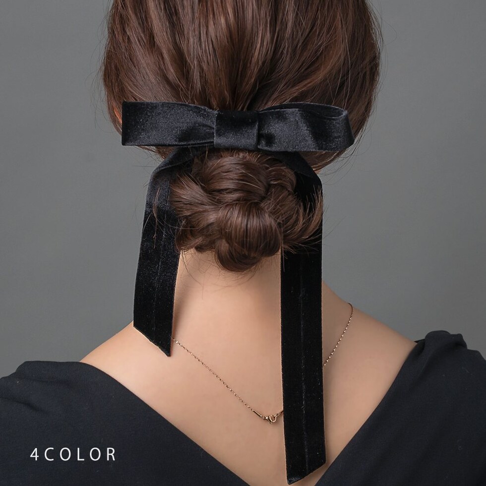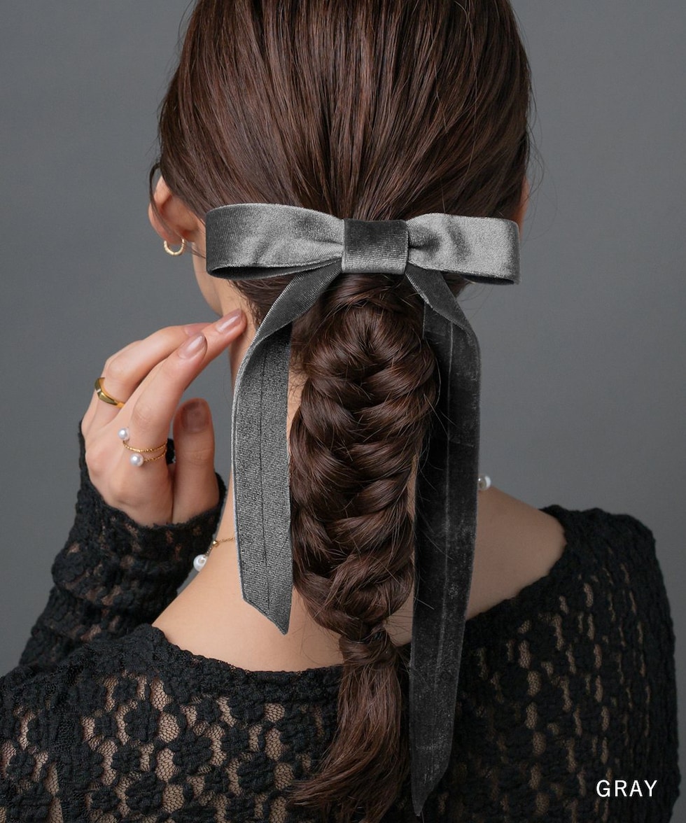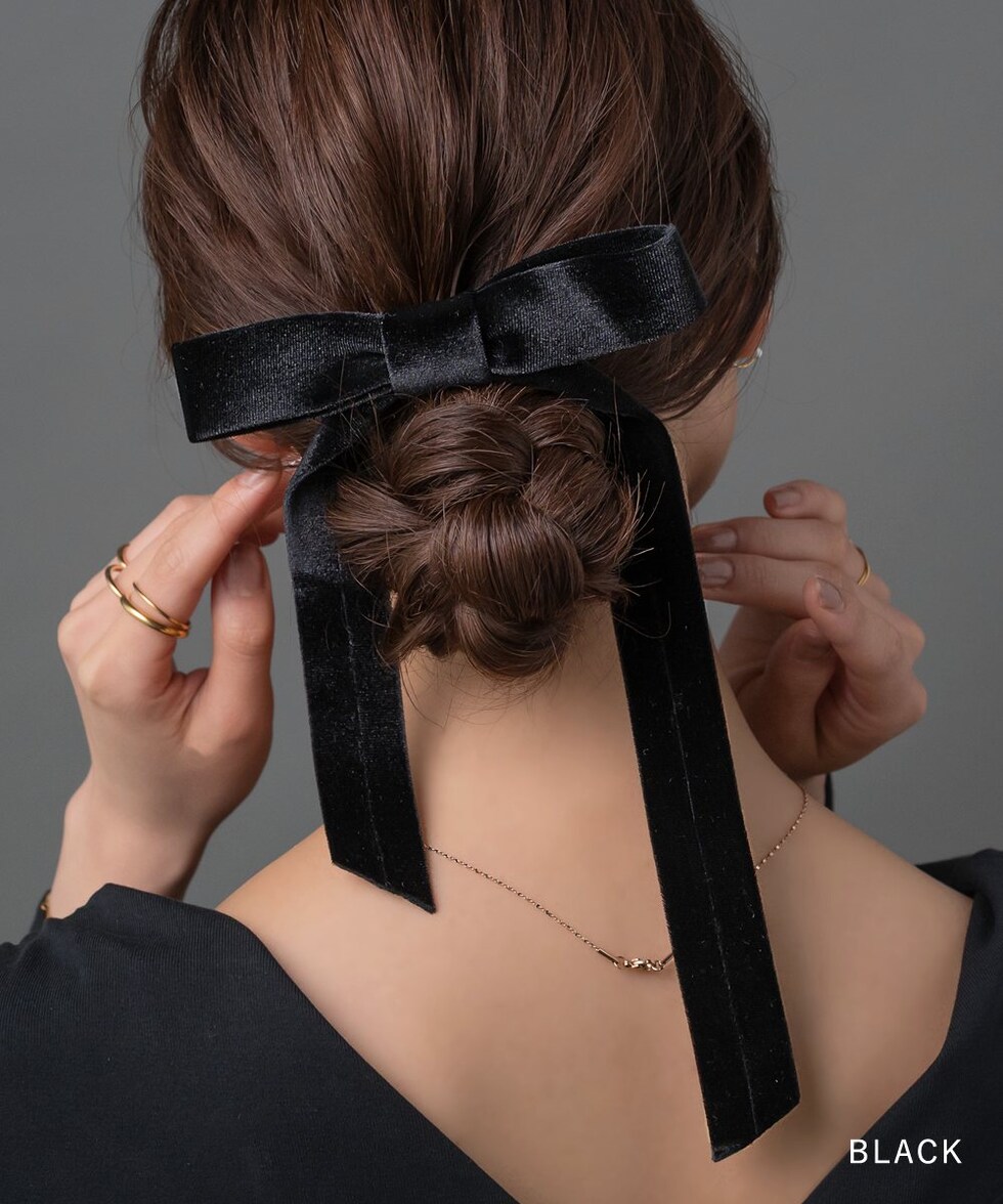 アシンメトリーなベロアリボンのポニーフック。程よいボリューム感で普段のスタイルにパッと華やかな印象をプラス。ロングヘアのローポニーやお団子スタイルにさりげなく差し色を添えて。