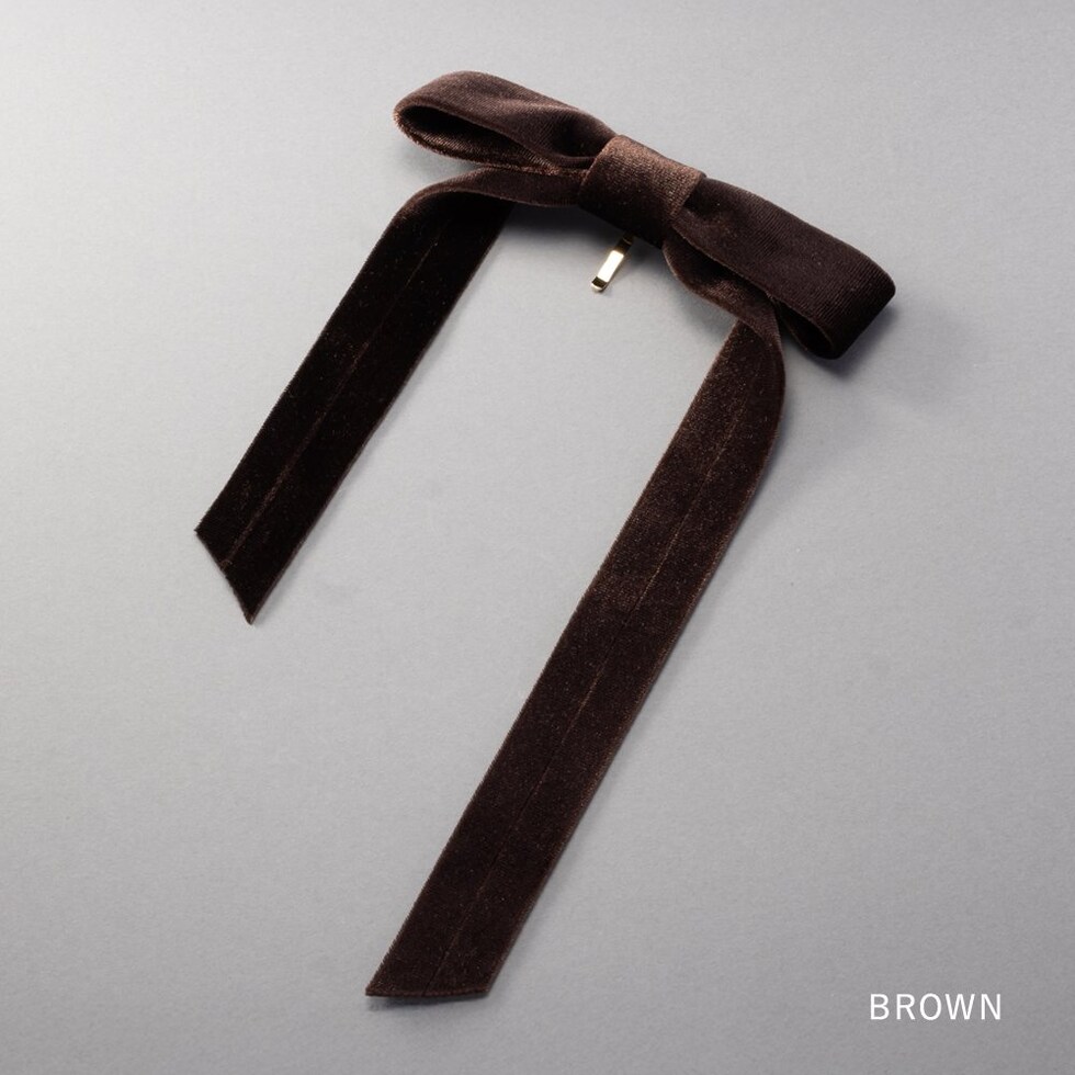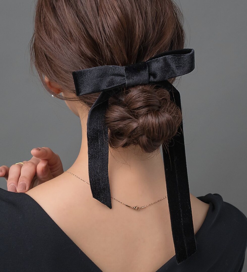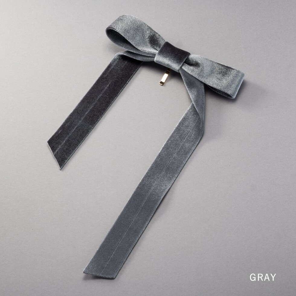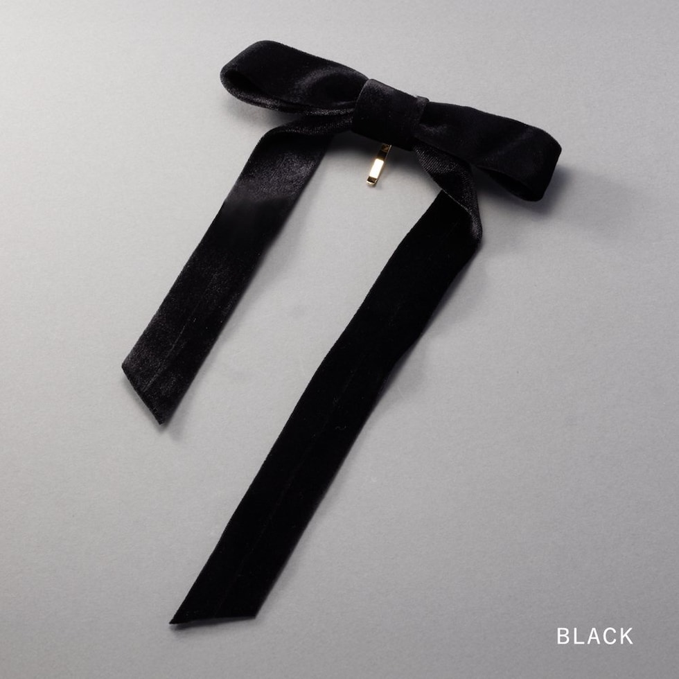 アシンメトリーなベロアリボンのポニーフック。程よいボリューム感で普段のスタイルにパッと華やかな印象をプラス。ロングヘアのローポニーやお団子スタイルにさりげなく差し色を添えて。