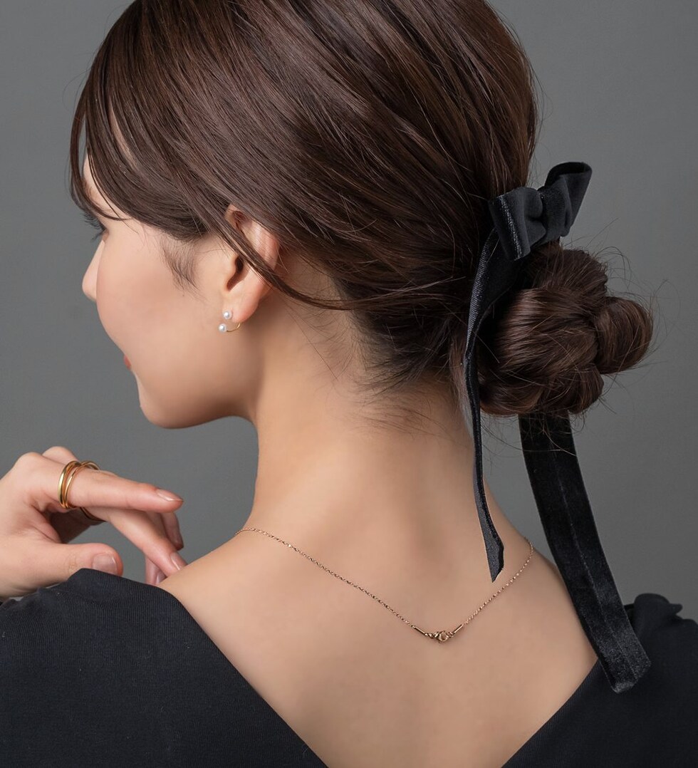 リボンモチーフでも子供っぽくならず大人コーデにマッチする深みのあるカラーをセレクト。簡単にこなれ感のあるスタイルが叶います♪