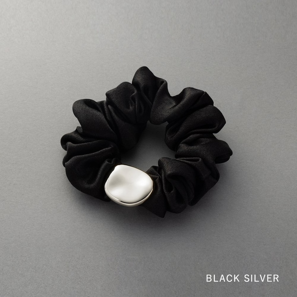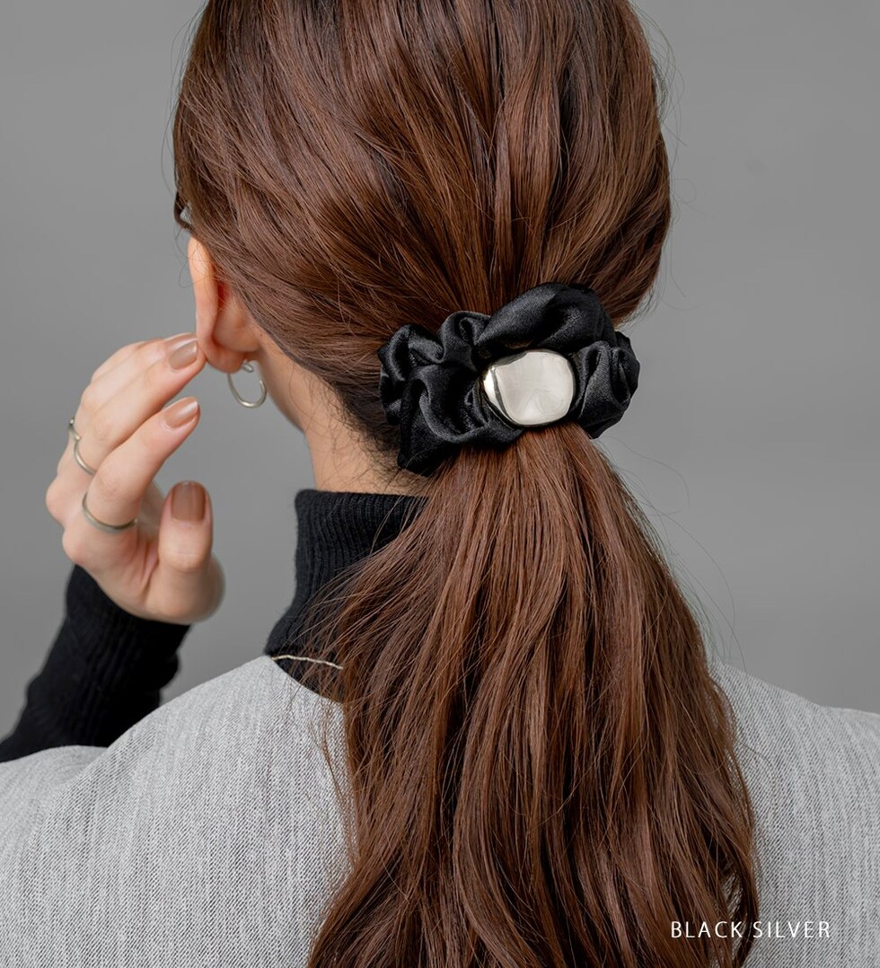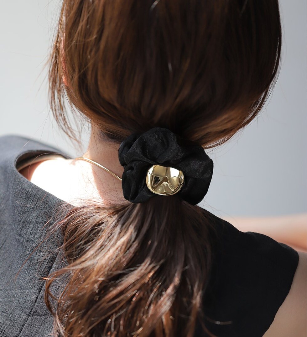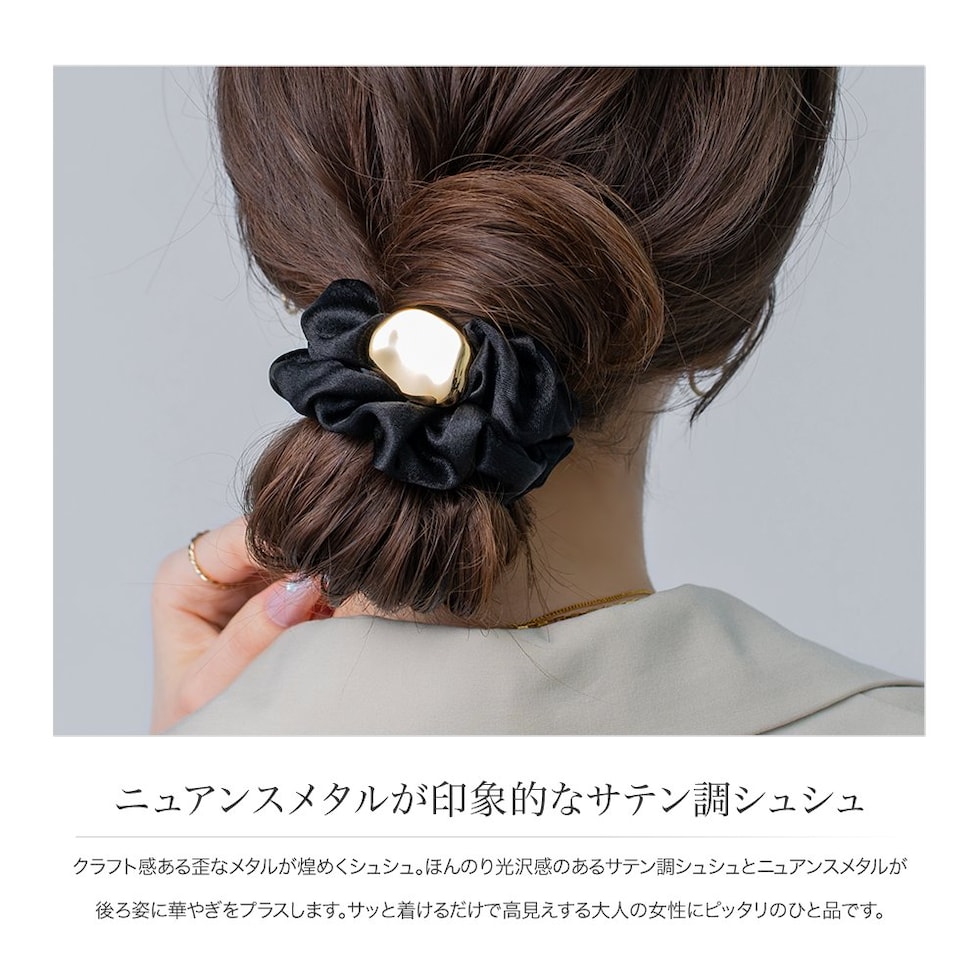 クラフト感ある歪なメタルが煌めくシュシュ。ほんのり光沢感のあるサテン調シュシュとニュアンスメタルが後ろ姿に華やぎをプラスします。サッと着けるだけで高見えする大人の女性にピッタリのひと品です。