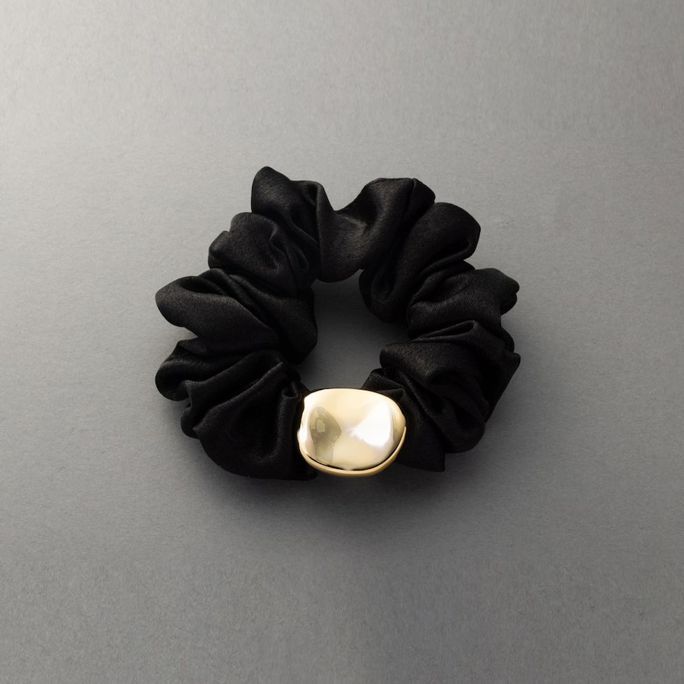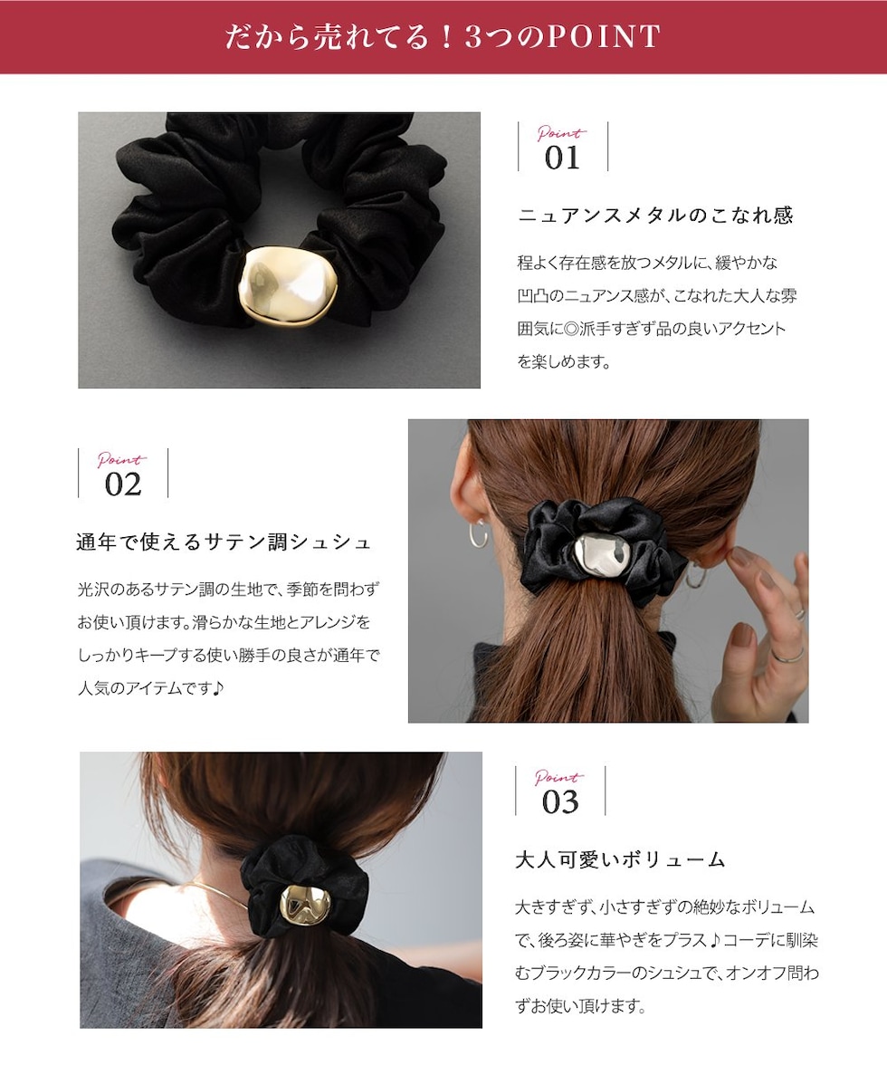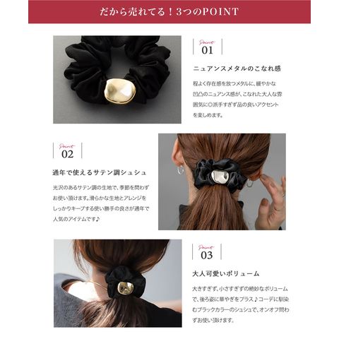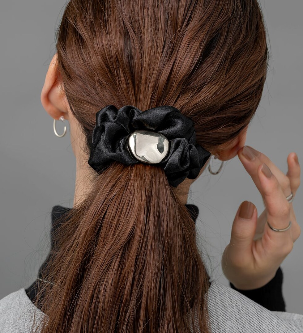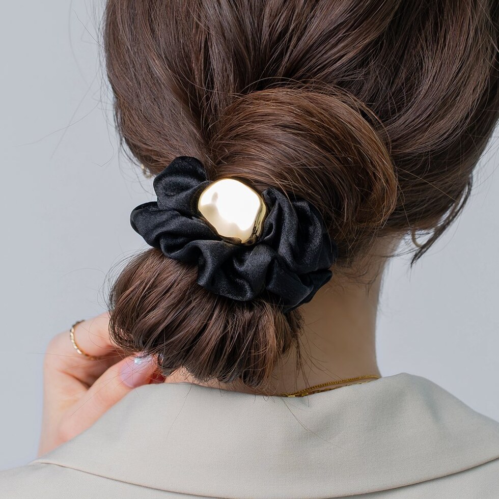 クラフト感ある歪なメタルが煌めくシュシュ。ほんのり光沢感のあるサテン調シュシュとニュアンスメタルが後ろ姿に華やぎをプラスします。サッと着けるだけで高見えする大人の女性にピッタリのひと品です。