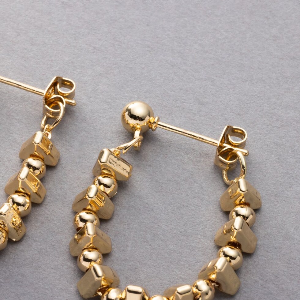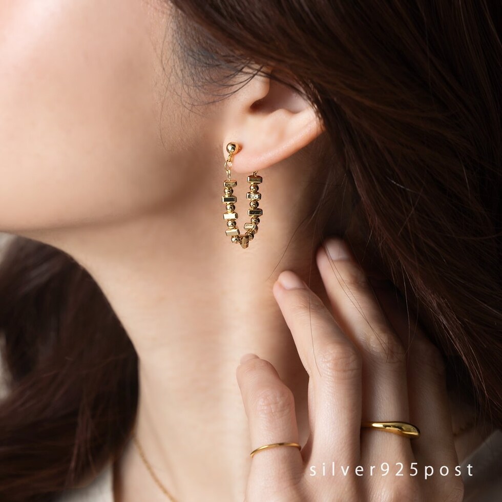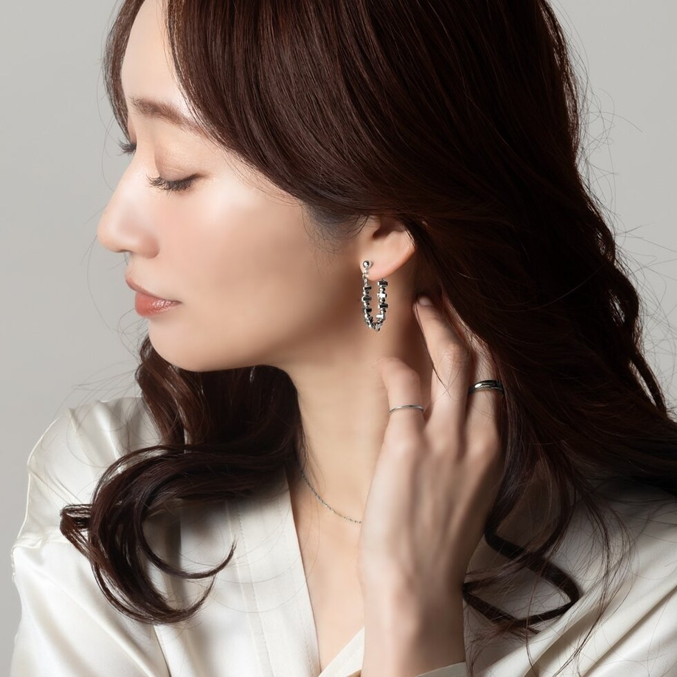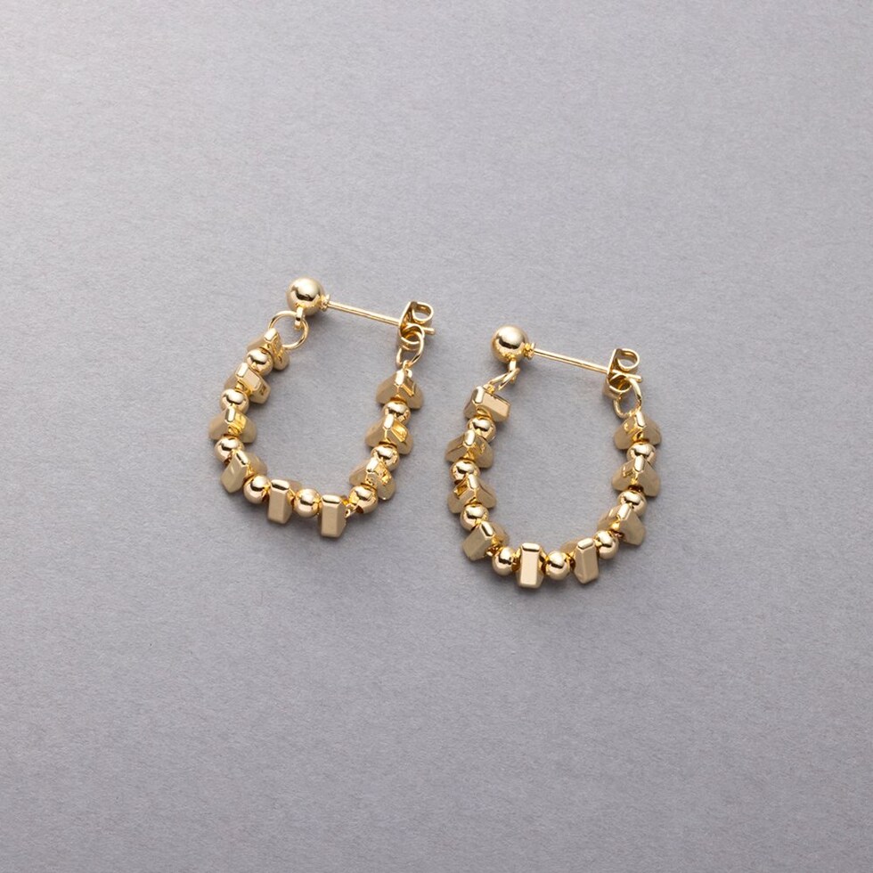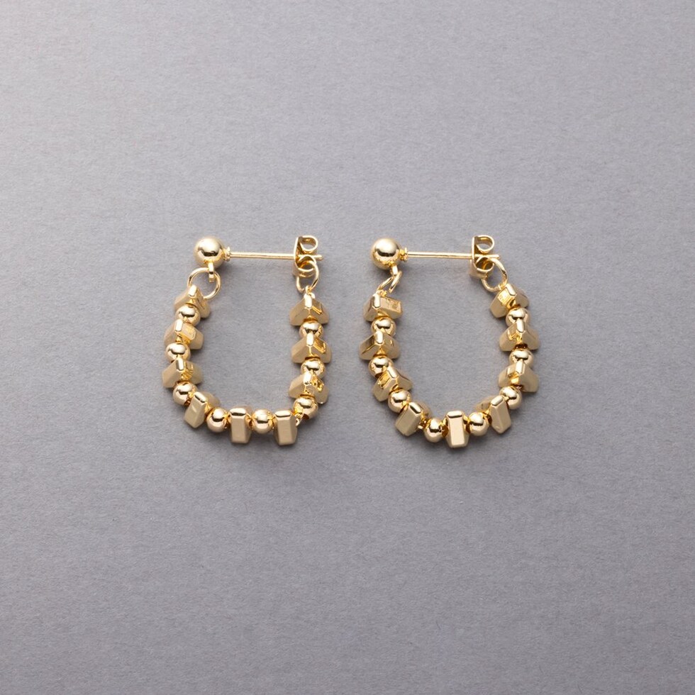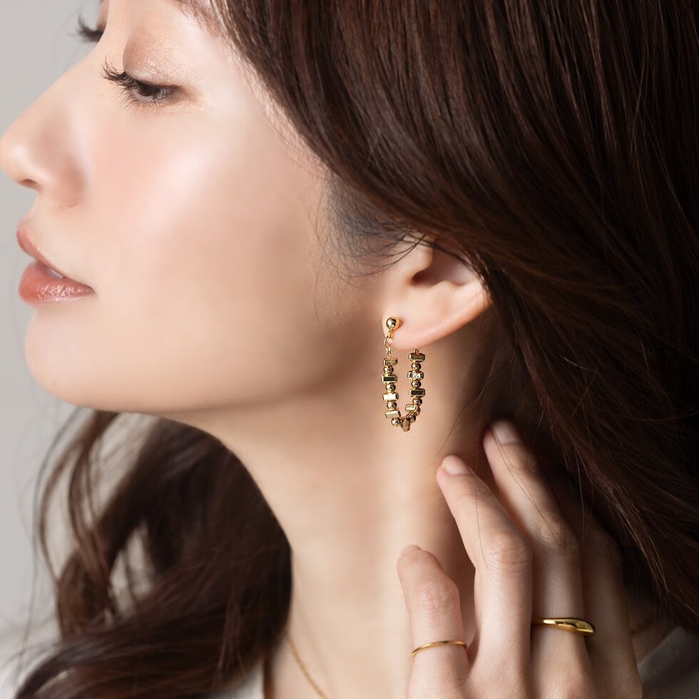 スフィアとトライアングルのメタルビーズを交互に連ねたバックキャッチピアス。連ねたメタルの艶めきと個性的な形が目を惹くデザインで、横顔をグッと印象づけてくれます。モダンな雰囲気をプラスしてくれるから、コーデがどこか物足りないときのアクセント使いに◎