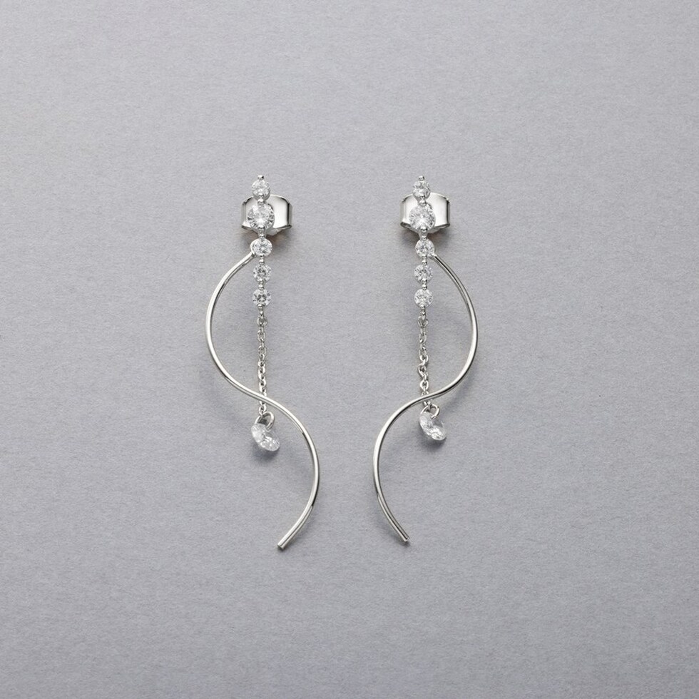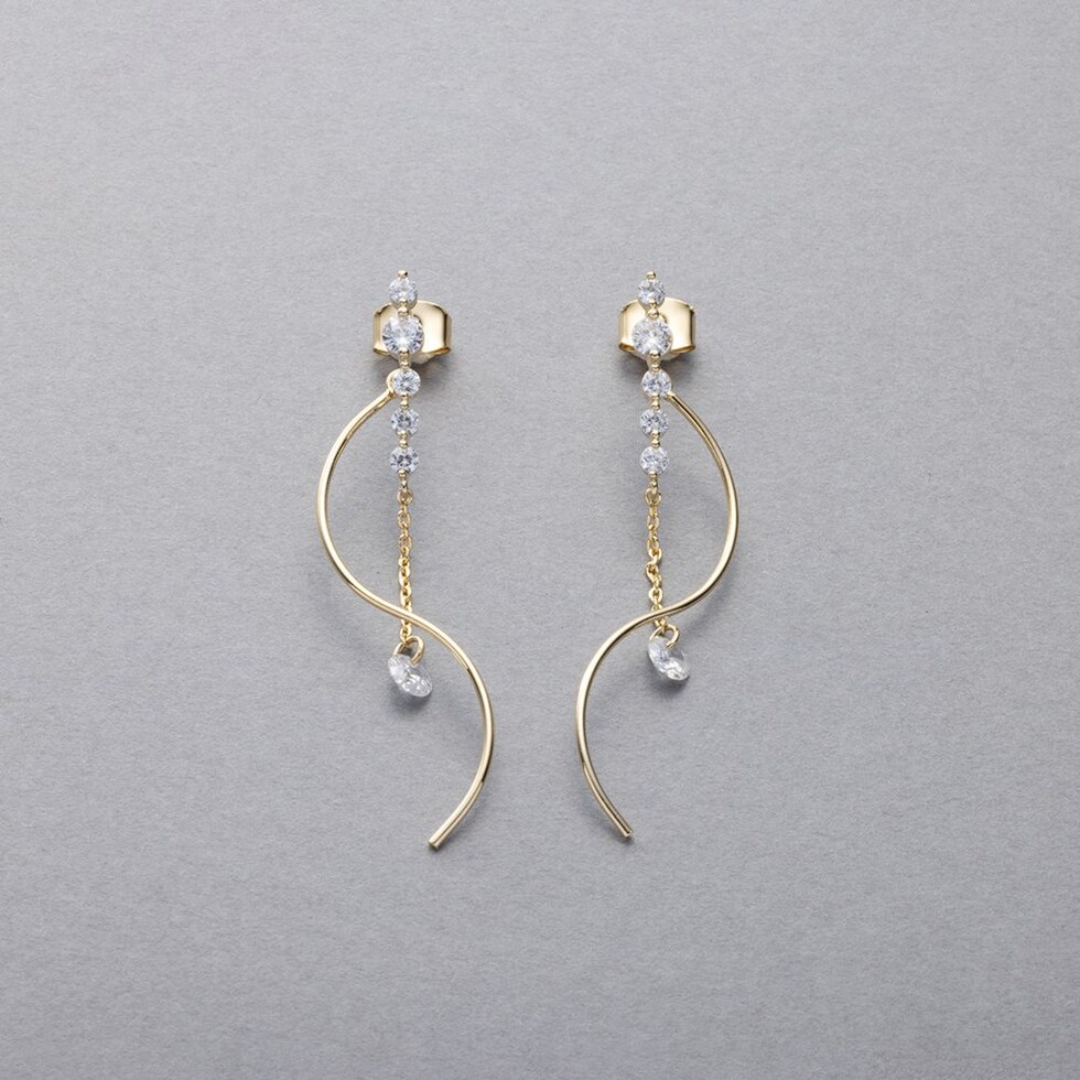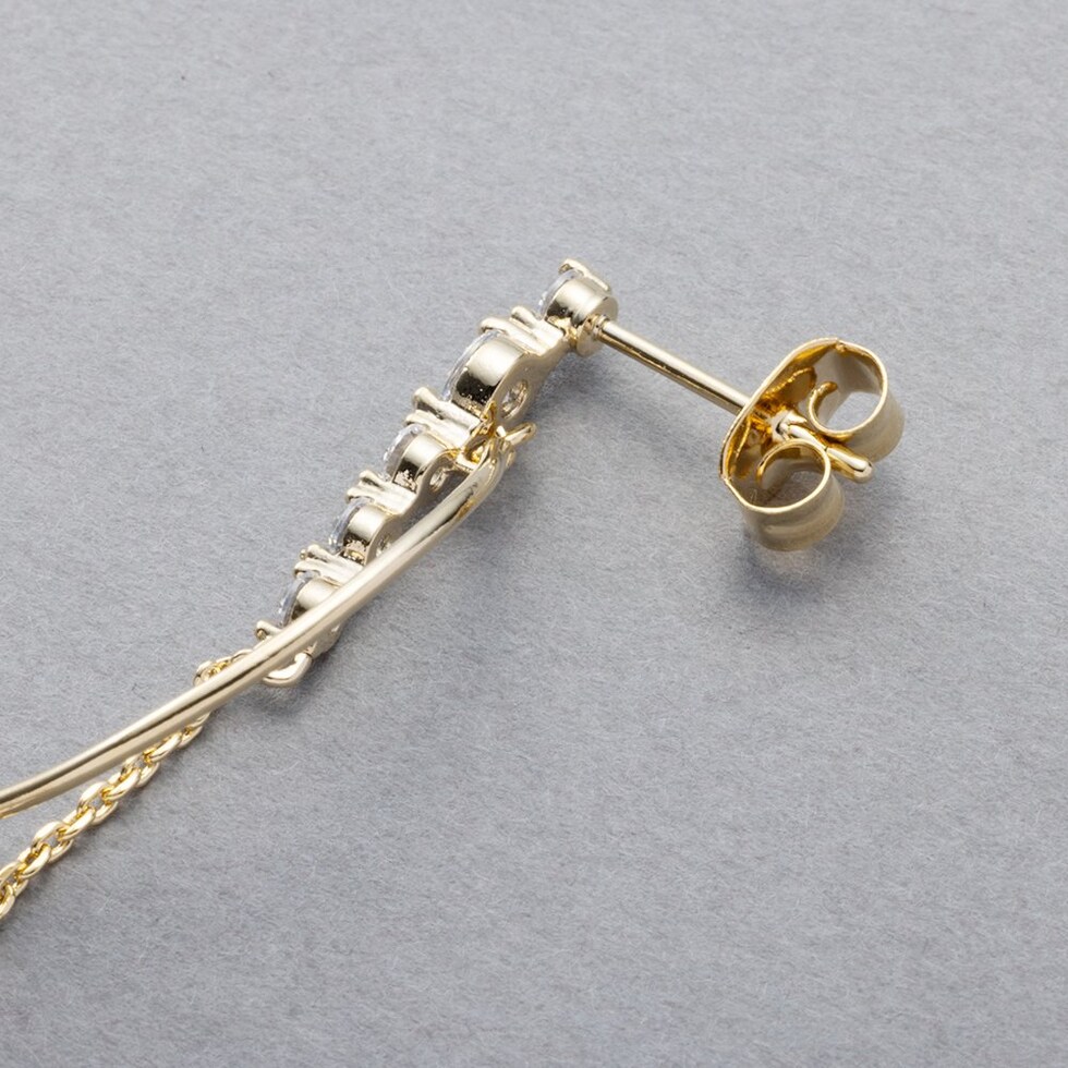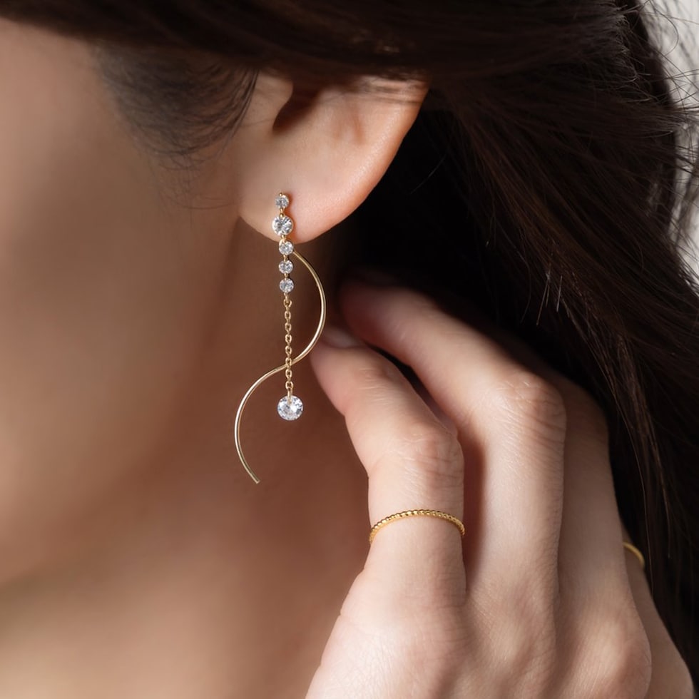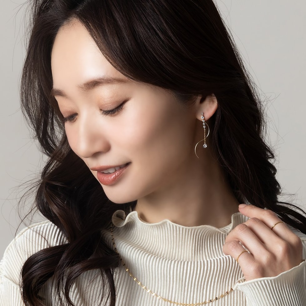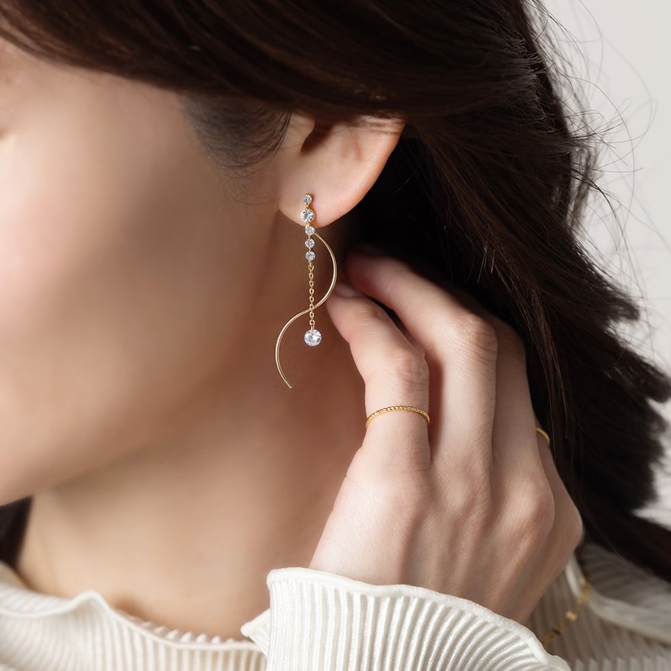 重なり合うラインビジューとウェーブバーが耳元で軽やかに揺れるスイングピアス。耳元で繊細に輝くビジューがお顔周りを華やかに演出し、品のよい存在感を放ちます。デイリーからオケージョンまで対応し、スタイリングをクラスアップしてくれるひと品です。